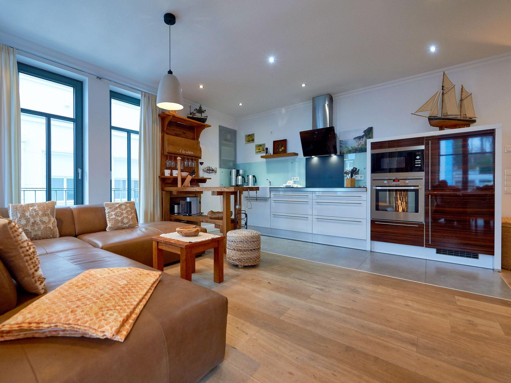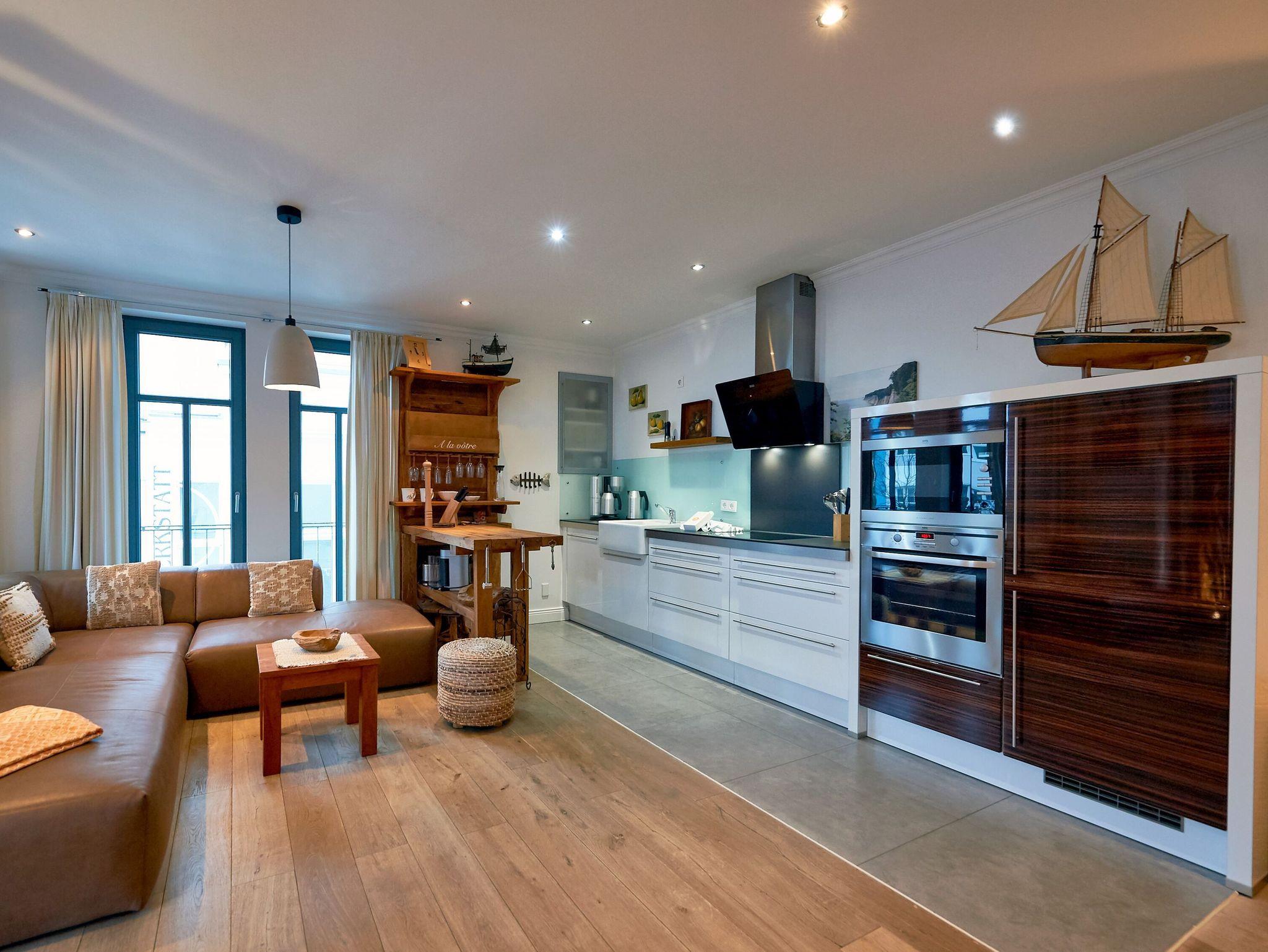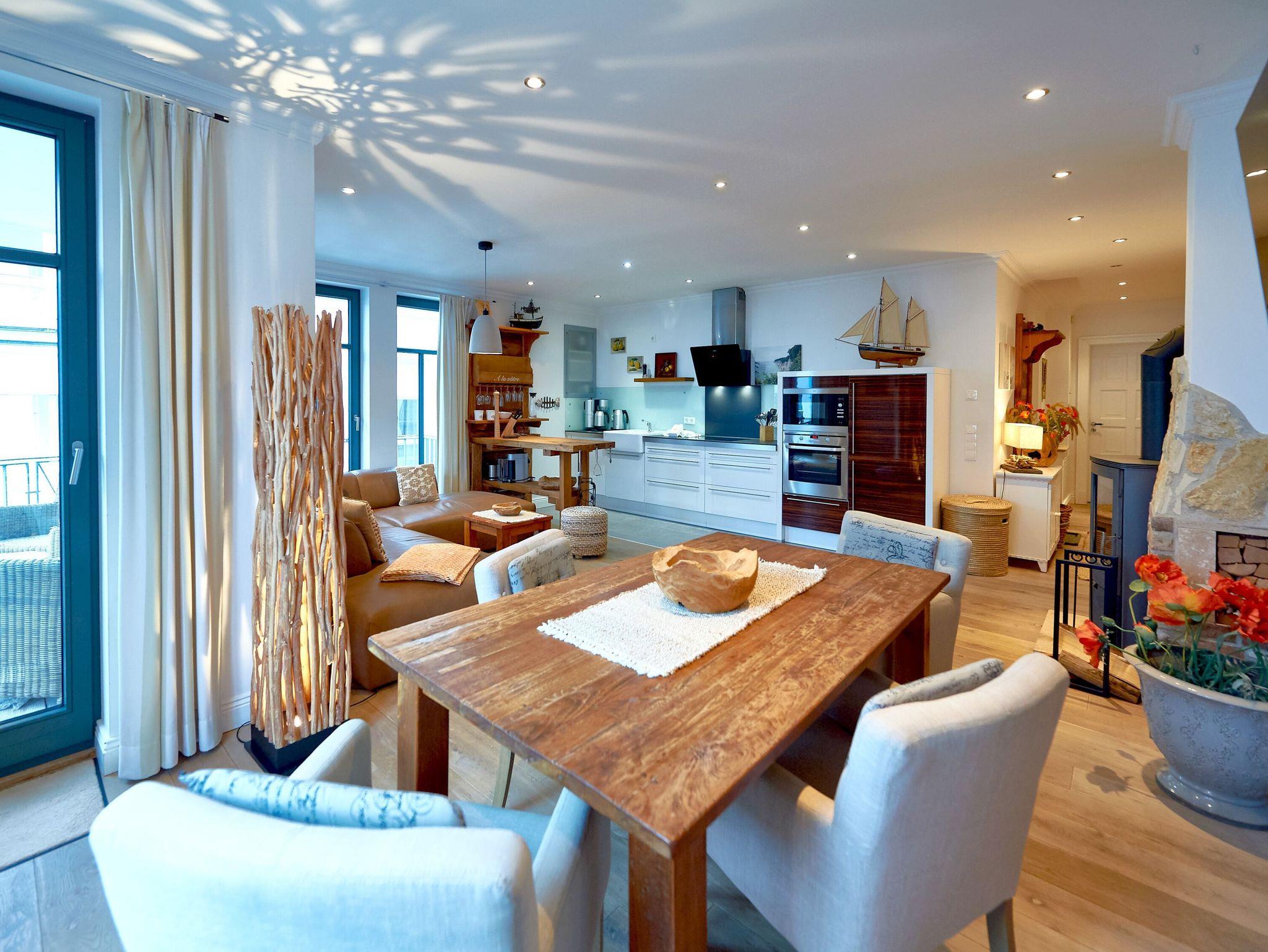 Der in den Wohnraum harmonisch integrierte Kochbereich überzeugt mit hochwertigen Geräten. Ein Miele-Induktionskochfeld, ein Backofen, eine Mikrowelle, ein Geschirrspüler, ein Kühlschrank mit Gefrierfach, ein Toaster, eine Nespresso-Maschine (Vertuo-System - halbrunde Kapseln), ein Kaffeeautomat Siemens-Porsche-Design, ein Wasserkocher, WMF-Kochtöpfe und diverses Kleininventar lassen das Herz jeden Hobbykochs höher schlagen. Der große Massivholz-Esstisch ist ein echtes Unikat und bietet 4 Personen genügend Platz für ein anregendes Mahl. Die frischen Urlaubsbrötchen bekommen Sie beim ca. 20 m entfernten Bäcker.