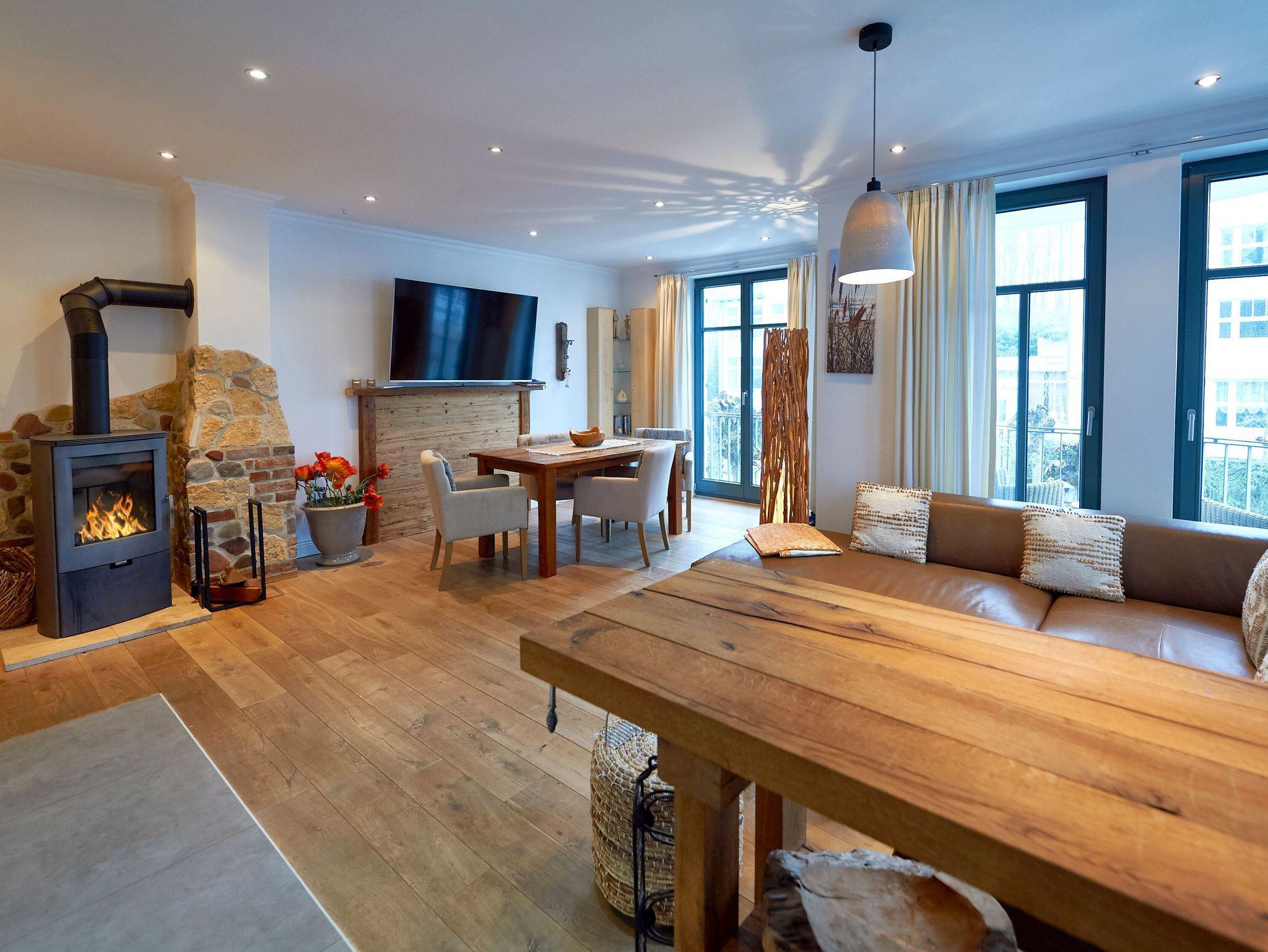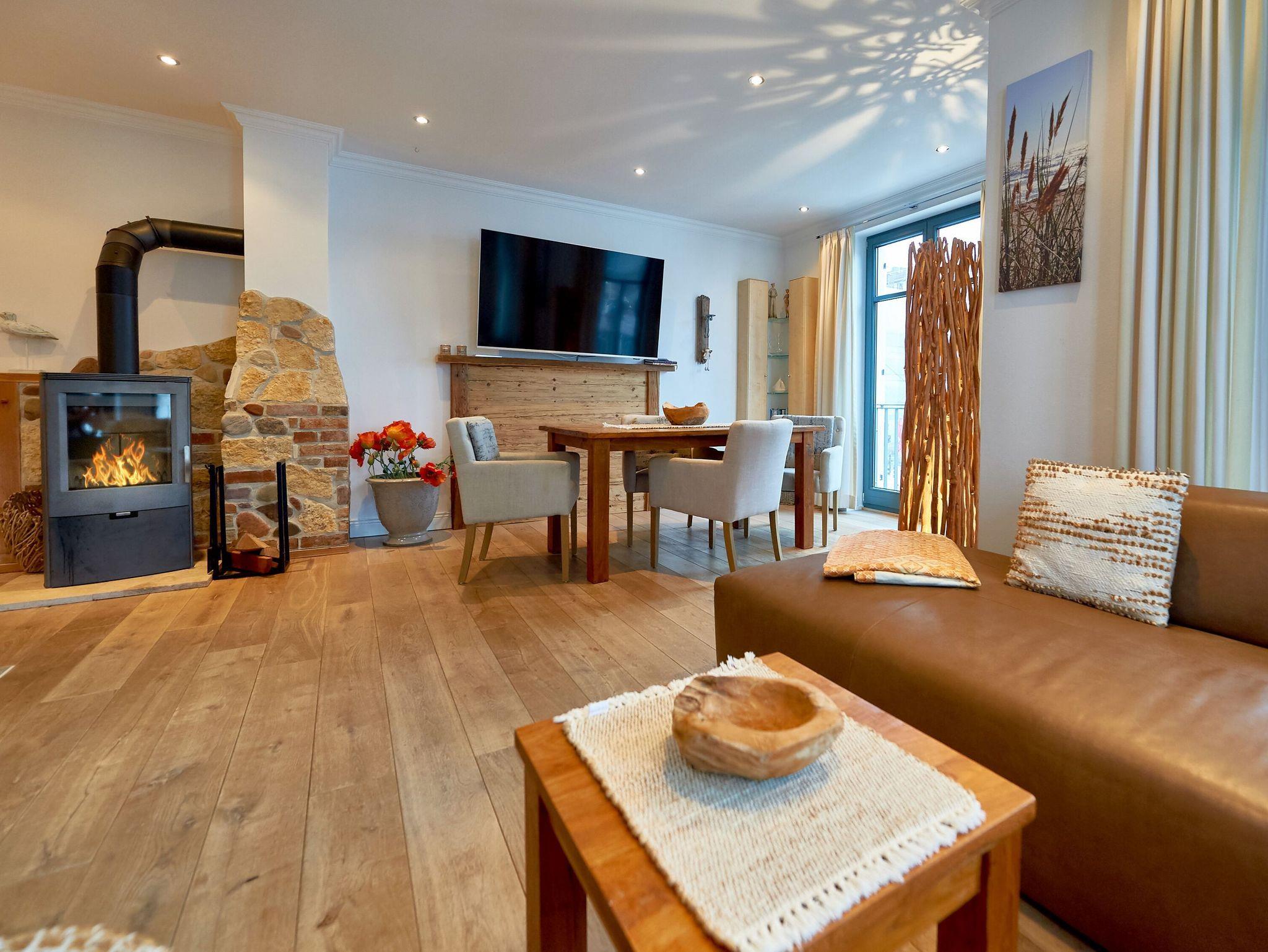Das 3-Raum-Appartement erfüllt auf ca. 92 m² Wohnfläche höchste Wohnansprüche! Der Wohn-/Essbereich mit seinen bodentiefen Fenstern wird mit schönem Tageslicht durchflutet und ist mit einem kleinen Balkon versehen. Die gemütliche Sitzecke verspricht entspannte Stunden vor dem prasselnden Kaminfeuer. Die rustikale Kaminecke wurde aus Naturstein und Holz errichtet. Ein großer Flachbild-TV 48 Zoll mit Ambilight - Beleuchtung und eine Bose-Sound-Anlage (CD, DVD und Radio) sorgen für Entertainment.