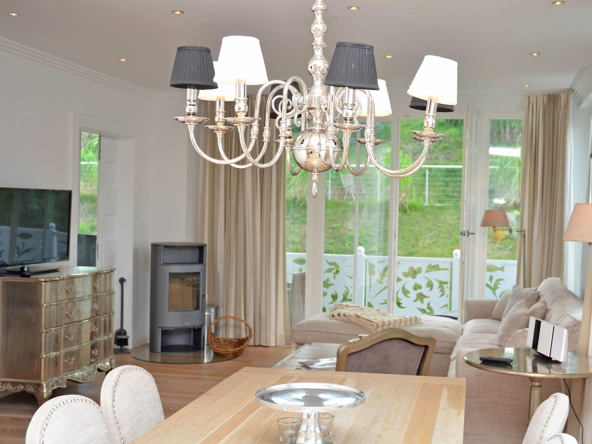 Die ausgedehnte Wohnlandschaft von ca. 47 m² mit Koch-, Ess- und Relaxbereich ermöglicht entspannte Stunden auf der bequemen freistehenden Couch vor Kaminofen oder auch anregende Gespräche an dem großen Holzesstisch mit charakteristischer Oberfläche und den außergewöhnlichen Stühlen. Ein großer Flachbild-TV, eine Musikanlage sowie W-LAN stehen natürlich auch zur Verfügung.
