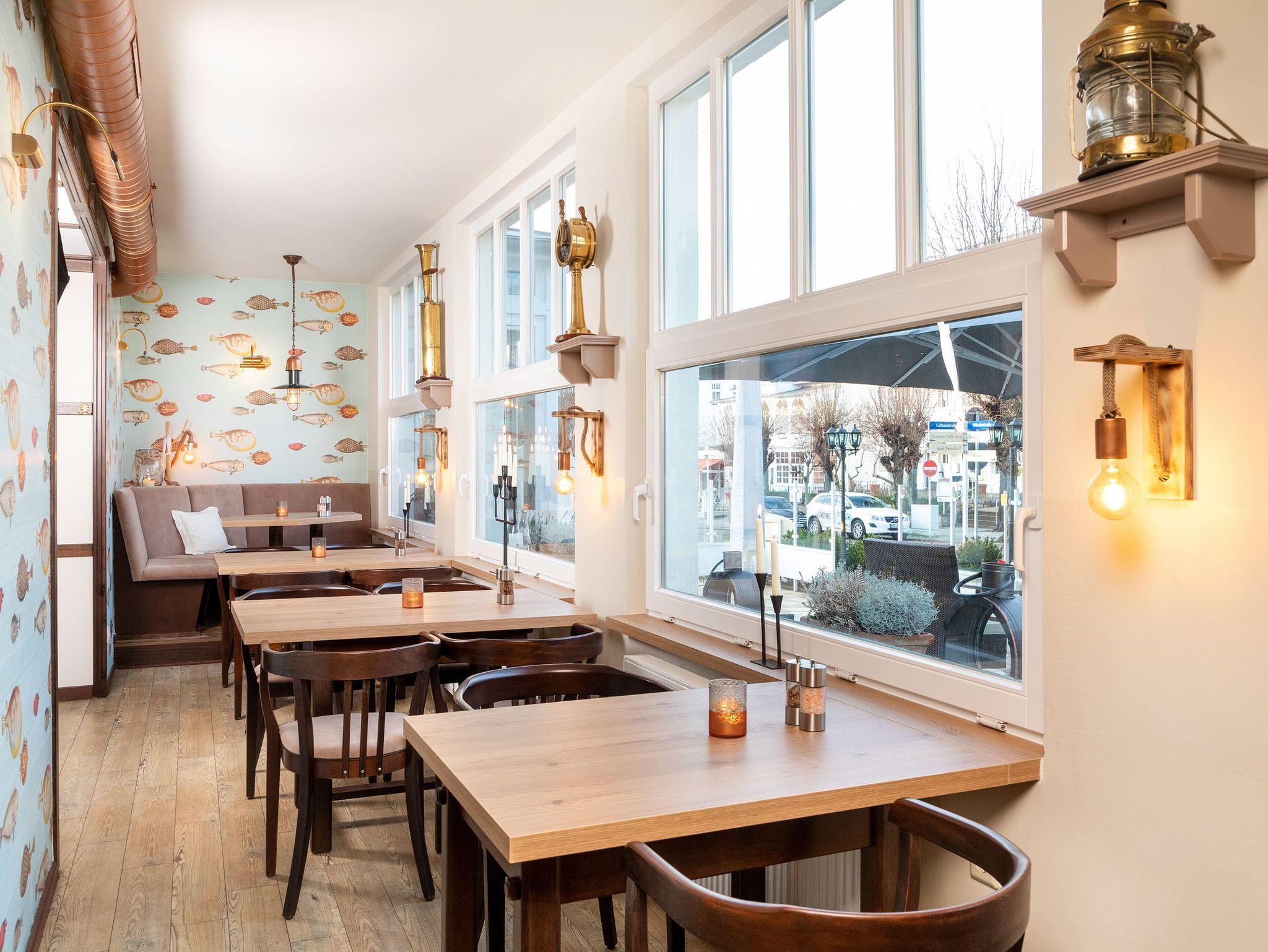 ...und das neu renovierte Restaurant Zur Kajüte mit Lounge verwöhnt Sie mit einer feinen regionalen Küche. Am Abend können Sie sich mit Bier, Wein oder Cocktails an der Hotelbar verwöhnen lassen.