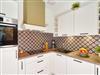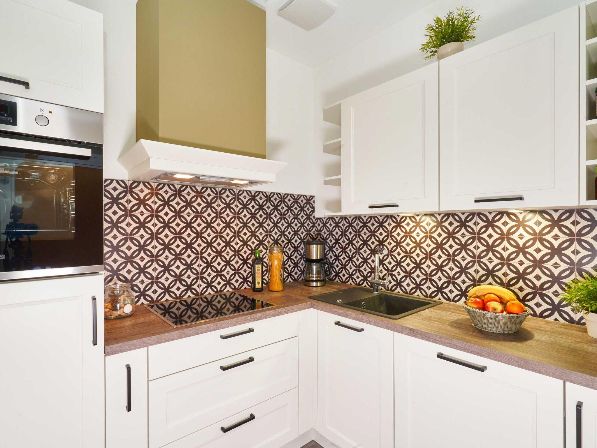 Vom Wohnbereich aus gelangt der Gast im hinteren Bereich in eine kleine, komplett eingerichtete Küche mit reichhaltiger Küchenausstattung, Herd mit Cerankochfeld, Dunstabzugshaube, Geschirrspüler, Kühlschrank, Kaffeemaschine, etc..