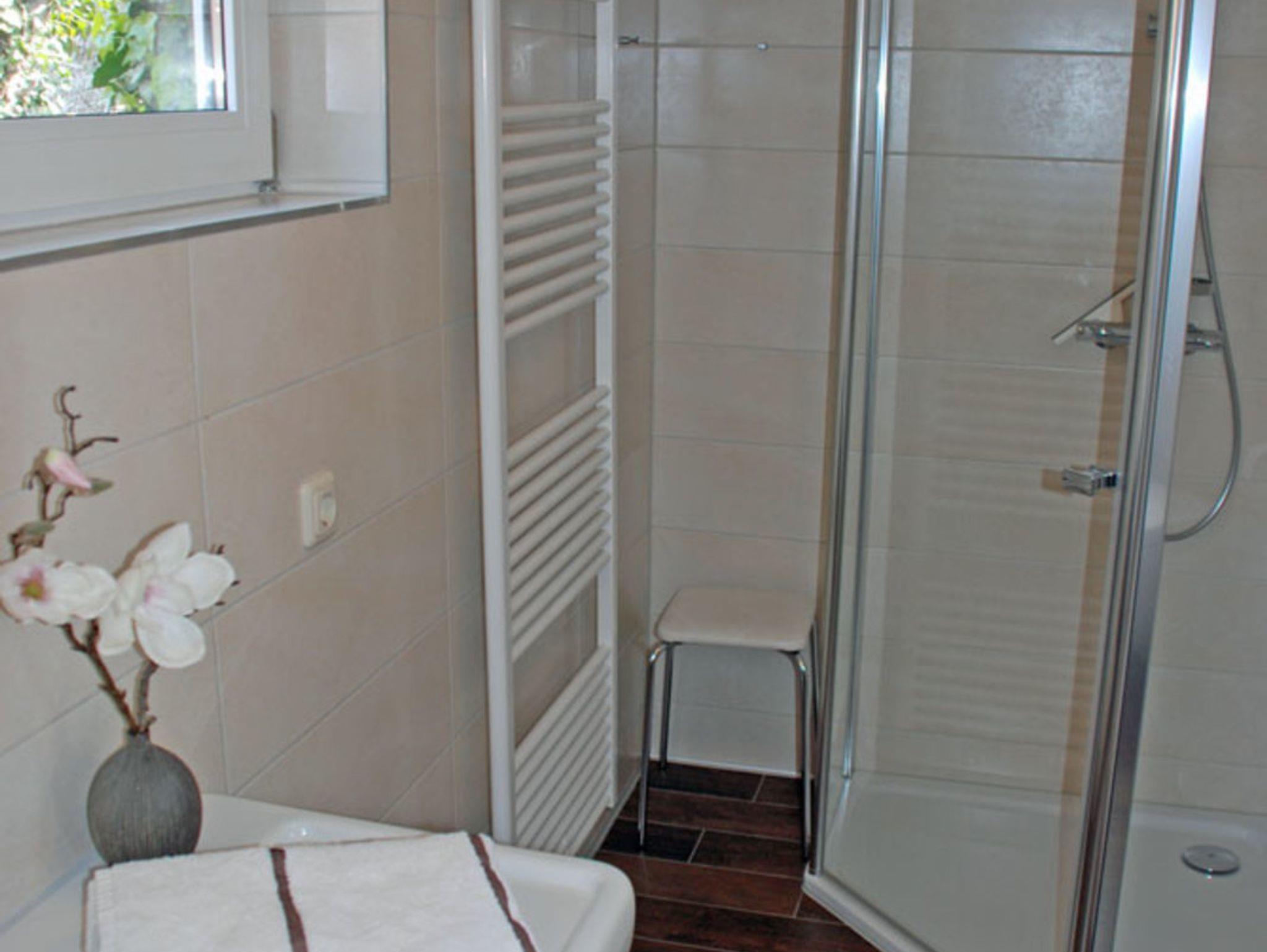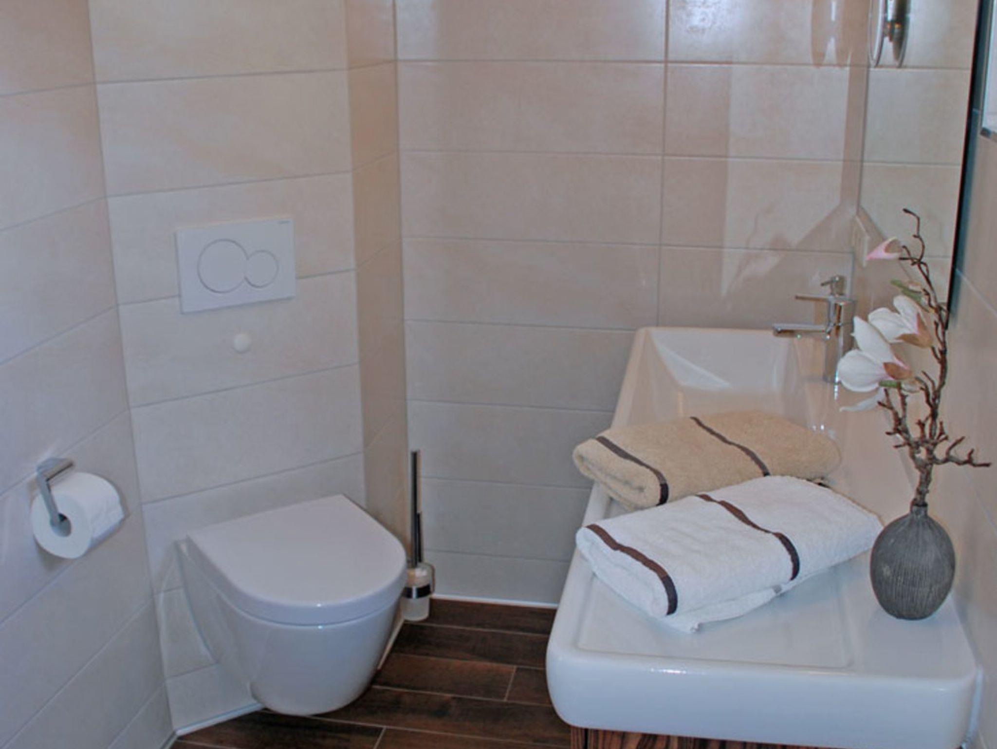 Das moderne Bad ist mit Dusche, Föhn, WC und Waschtisch ausgestattet und verfügt über Tageslicht.