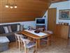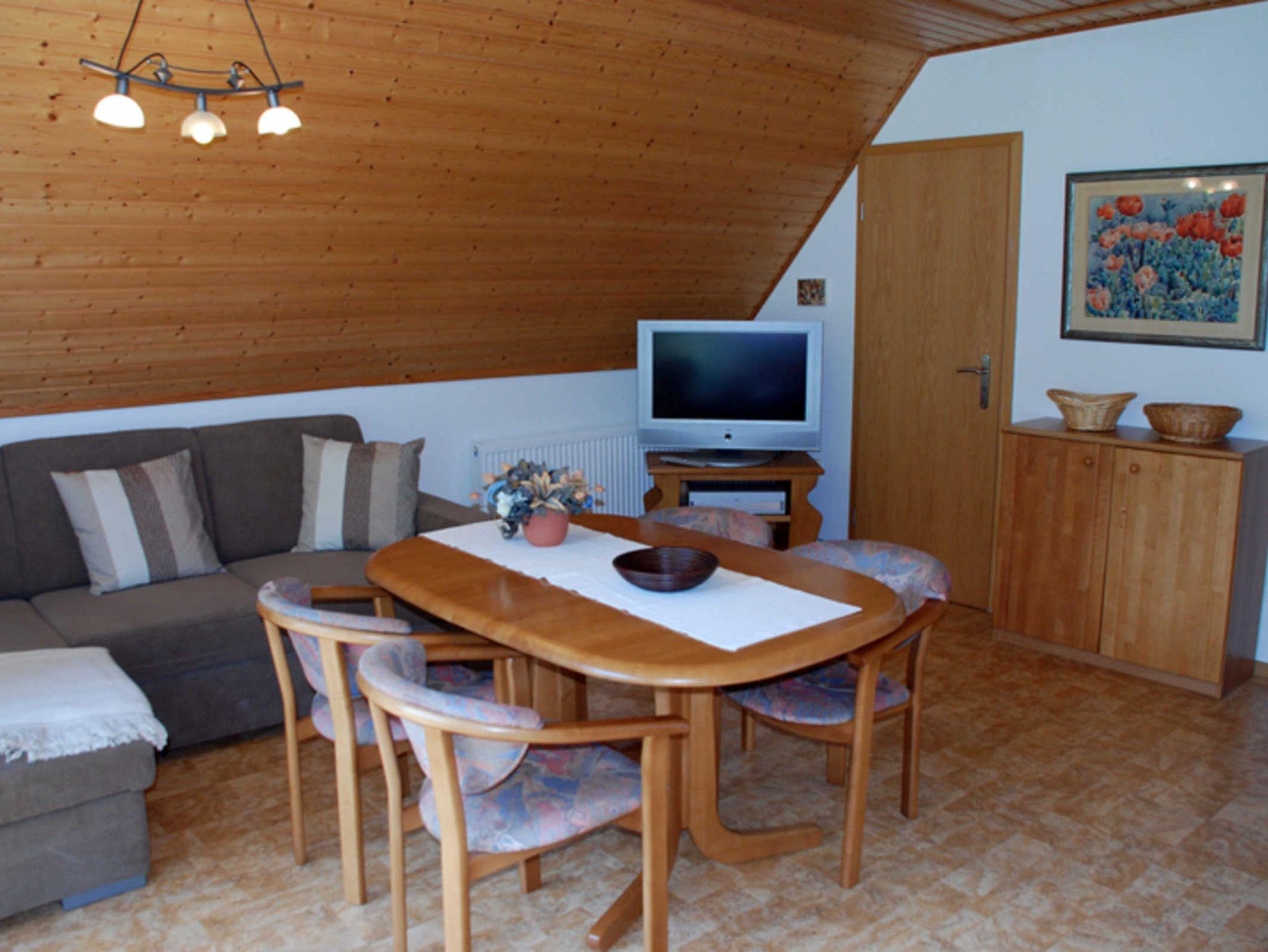 Im Wohnraum befinden sich eine bequeme Sitzcouch mit Tisch und ein modernes Flachbild-TV-Gerät. Hier steht auch ein Esstisch mit Stühlen. Ein Internetzugang steht Ihnen kostenfrei zur Verfügung.