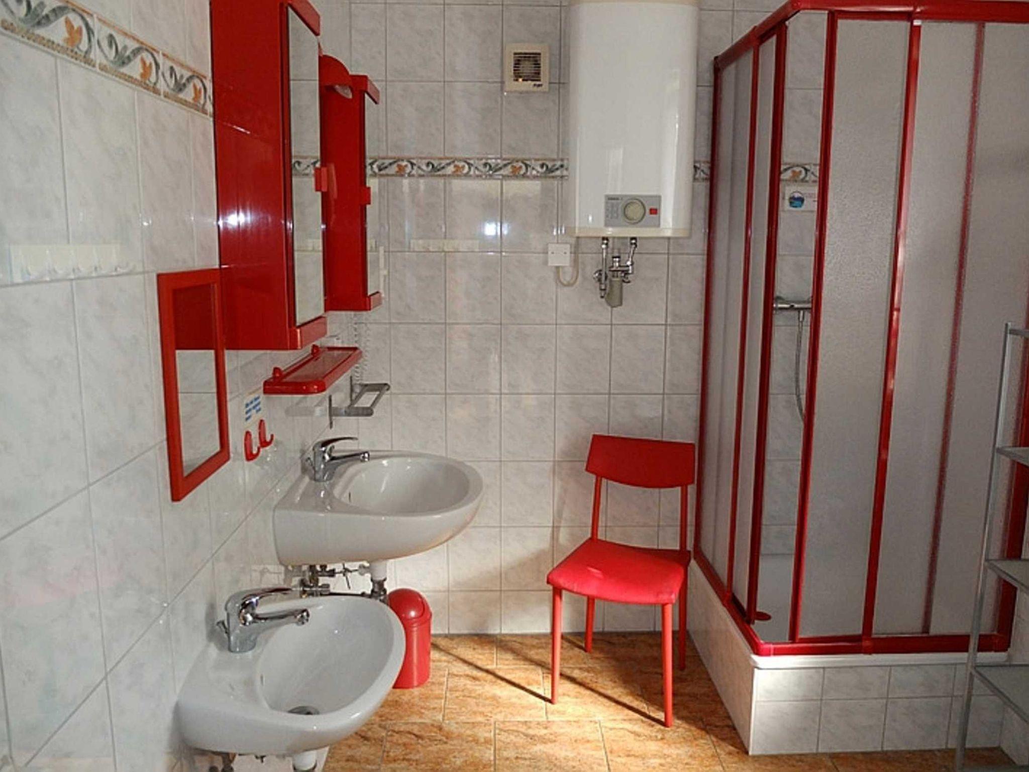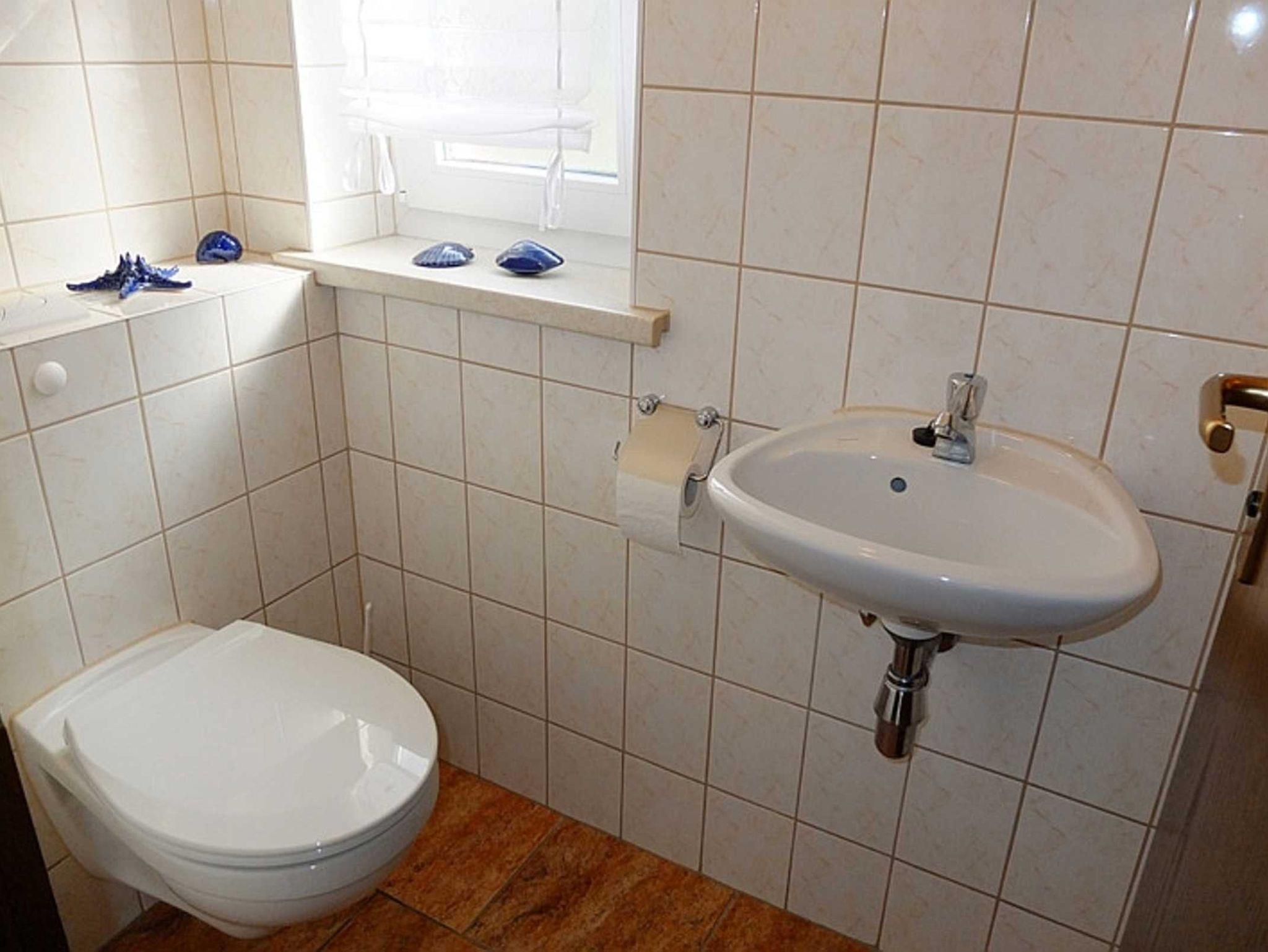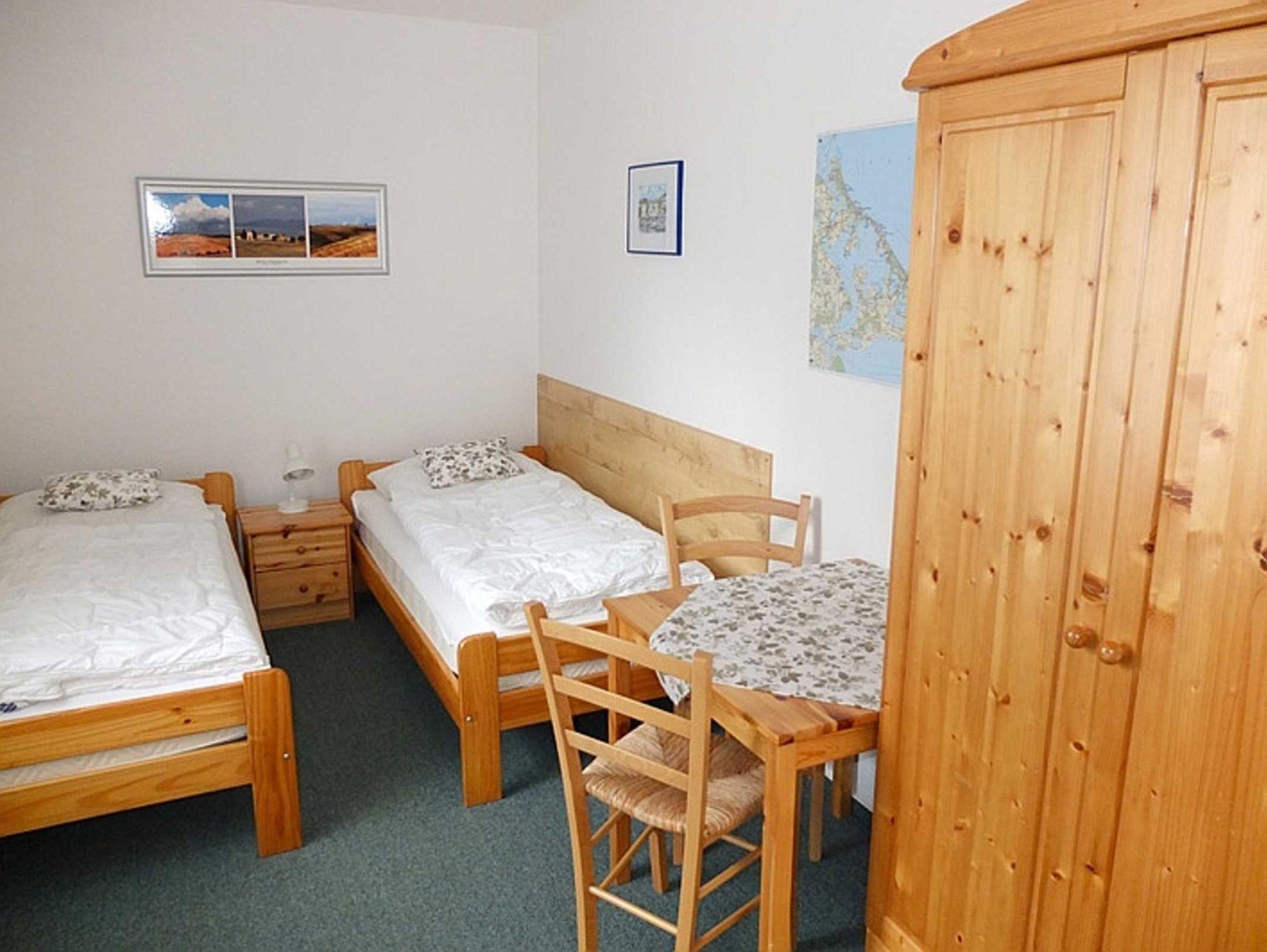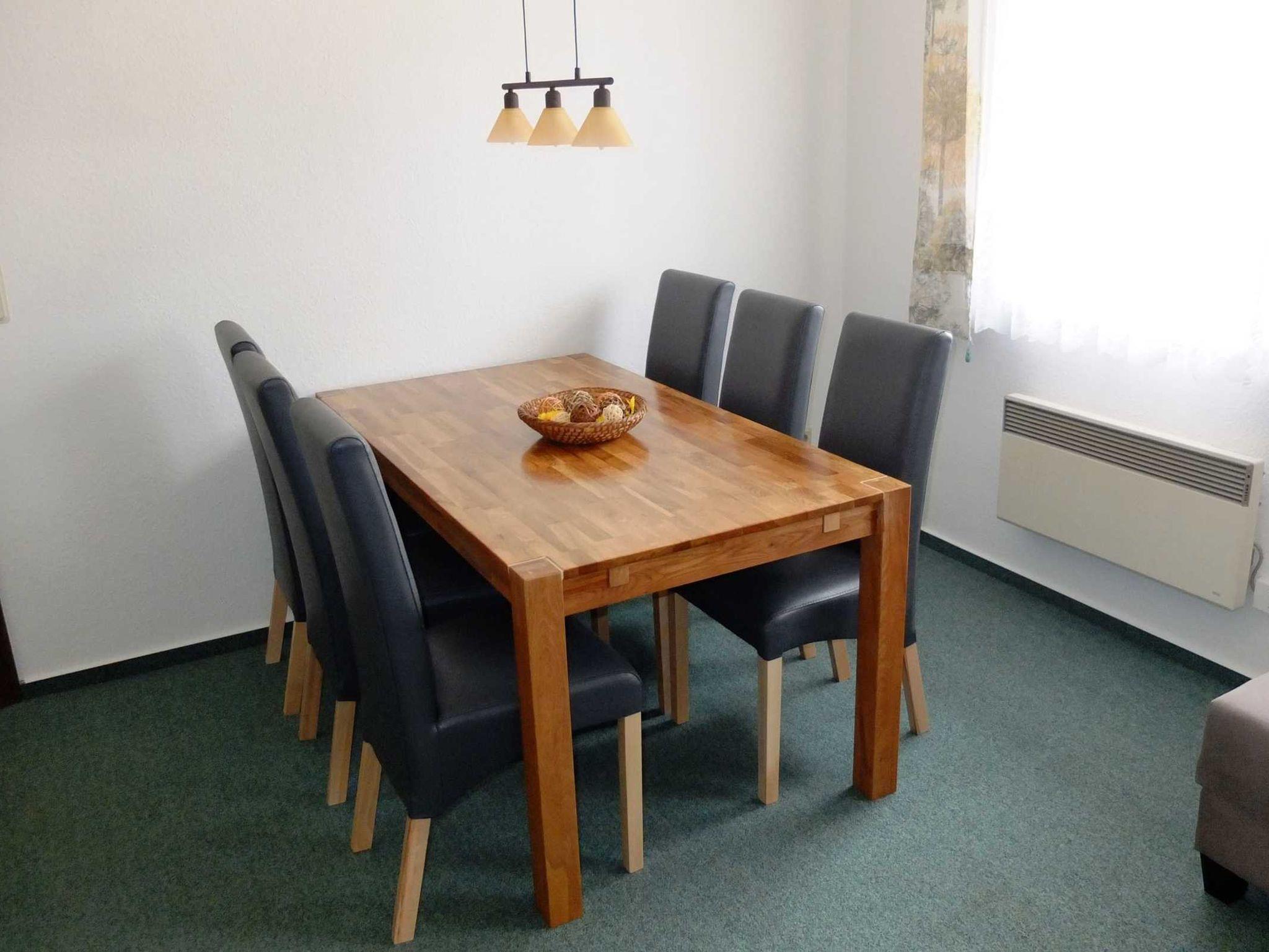 Eines der beiden Schlafzimmer verfügt über ein Doppelbett (1,80x2,00m), Kleiderschrank, sowie über einen Tisch mit Stühlen. Das zweite Schlafzimmer ist mit zwei Einzelbetten (a 0,90x2,00m), Kleiderschrank, sowie mit einem Tisch und Stühlen ausgestattet. Weiterhin gehört ein Bad mit DU/WC und ein Gäste-WC dazu. Das Haus verfügt über eine Elektroheizung. Flur, Küche und Badezimmer sind gefliest. In allen anderen Räumen befindet sich Teppichboden.