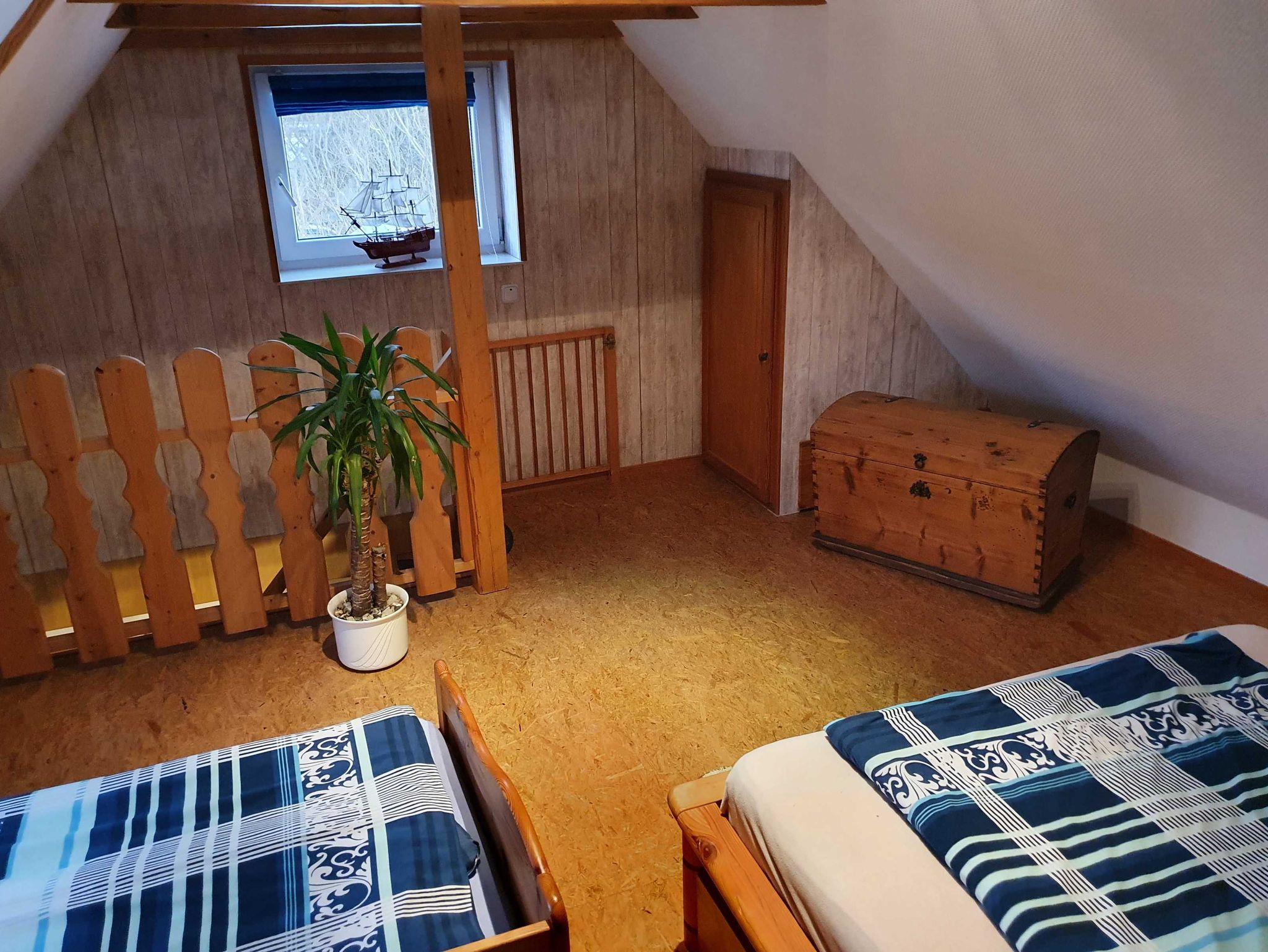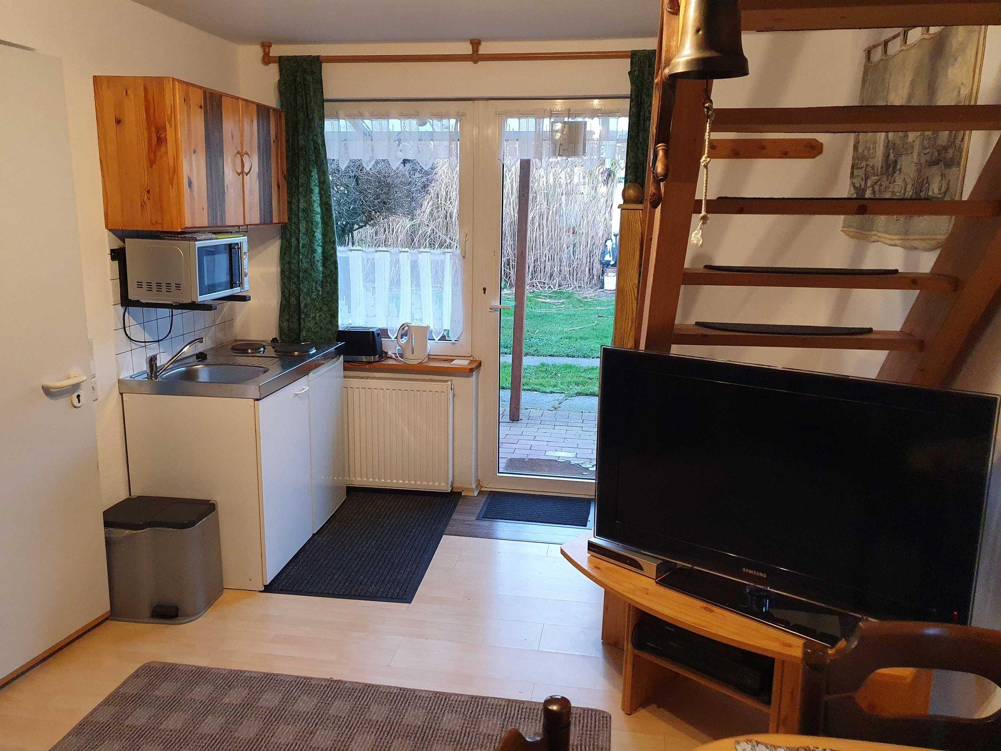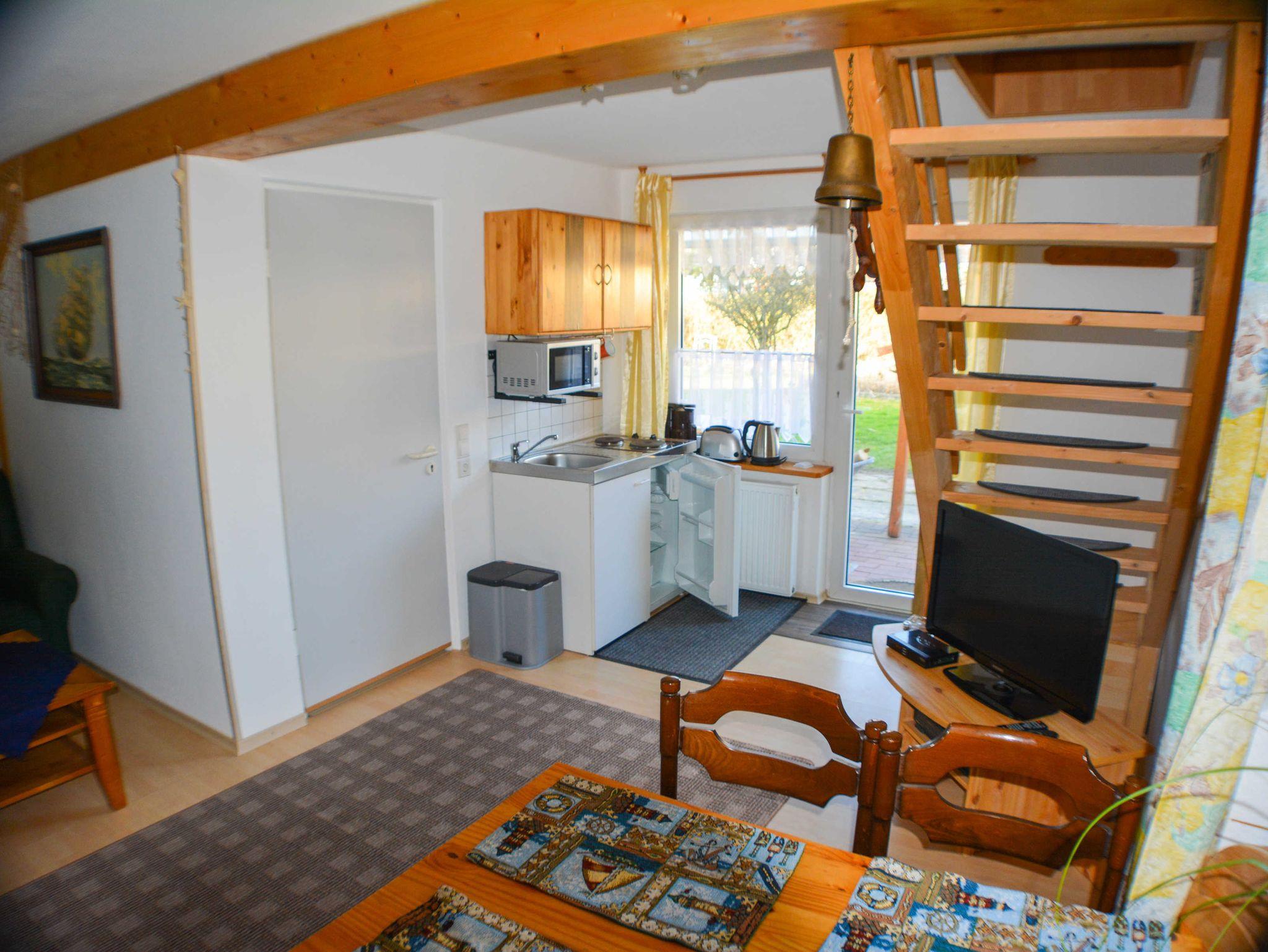 Wir vermieten eine helle, freundliche Ferienwohnung mit ca. 45 qm für 4 Erwachsene, auch eine Aufbettung ist möglich. Im ebenerdigen Bereich befindet sich die Sitzecke, eine kleine Pantryküche und das Bad mit Dusche und WC. Über eine Treppe erreicht man die Galerie-Schlafebene mit französischem Doppelbett (140x200) und 2 Einzelbetten (90x200). Die Pantry-Küche ist ausgestattet mit Kühlschrank, 2-Kochfelder, Toaster, Wasserkocher, Kaffeemaschine Mikrowelle, Minibackofen und Geschirrhandtüchern. Geschirr sowie Töpfe und Pfannen sind ebenfalls vorhanden.
