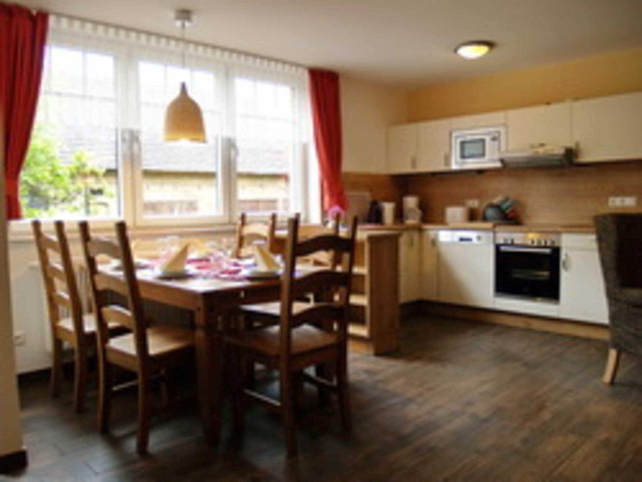 Küche mit Kochstelle, Backofen, Kühlschrank, Mikrowelle und Geschirrspüler,