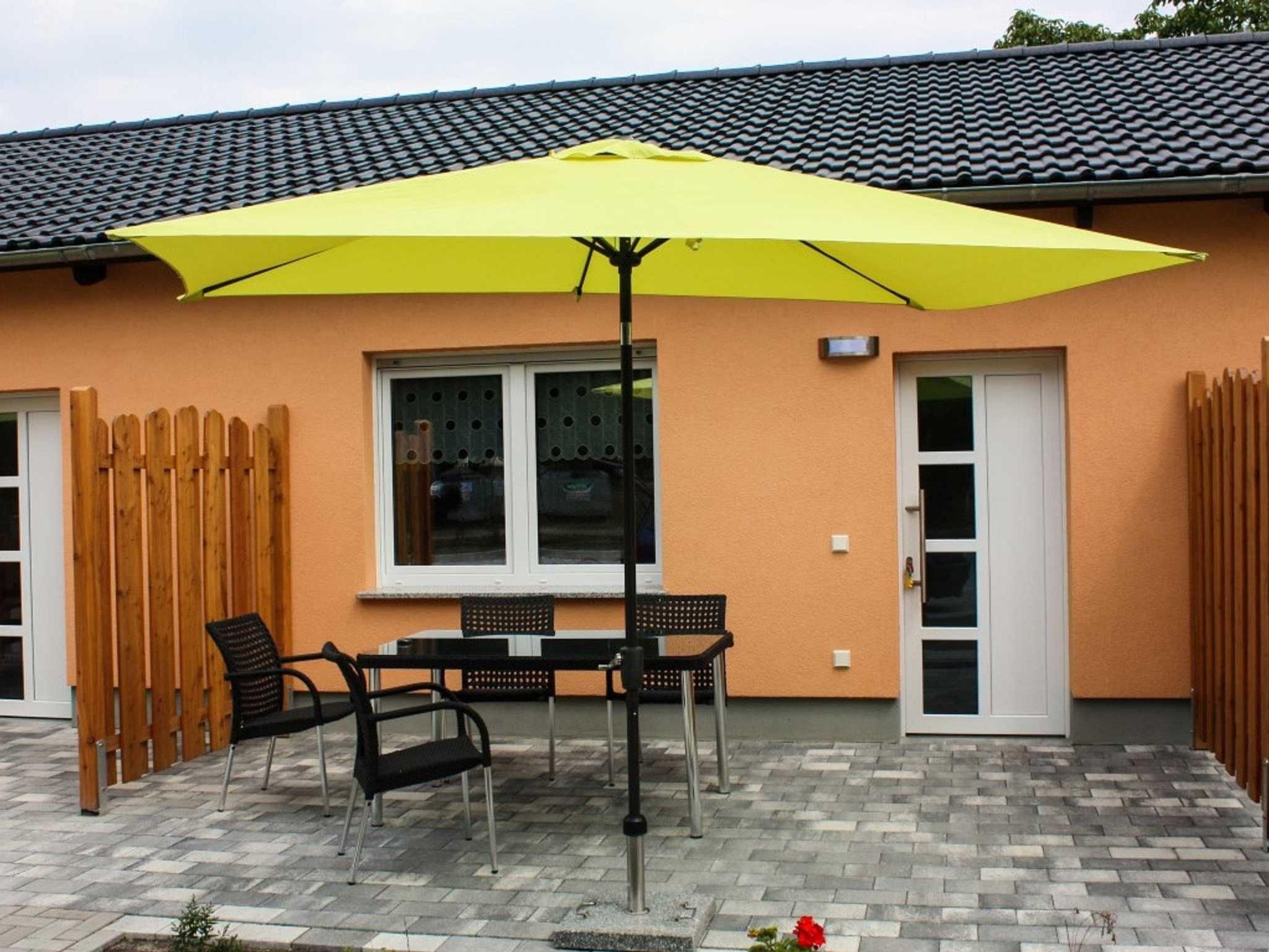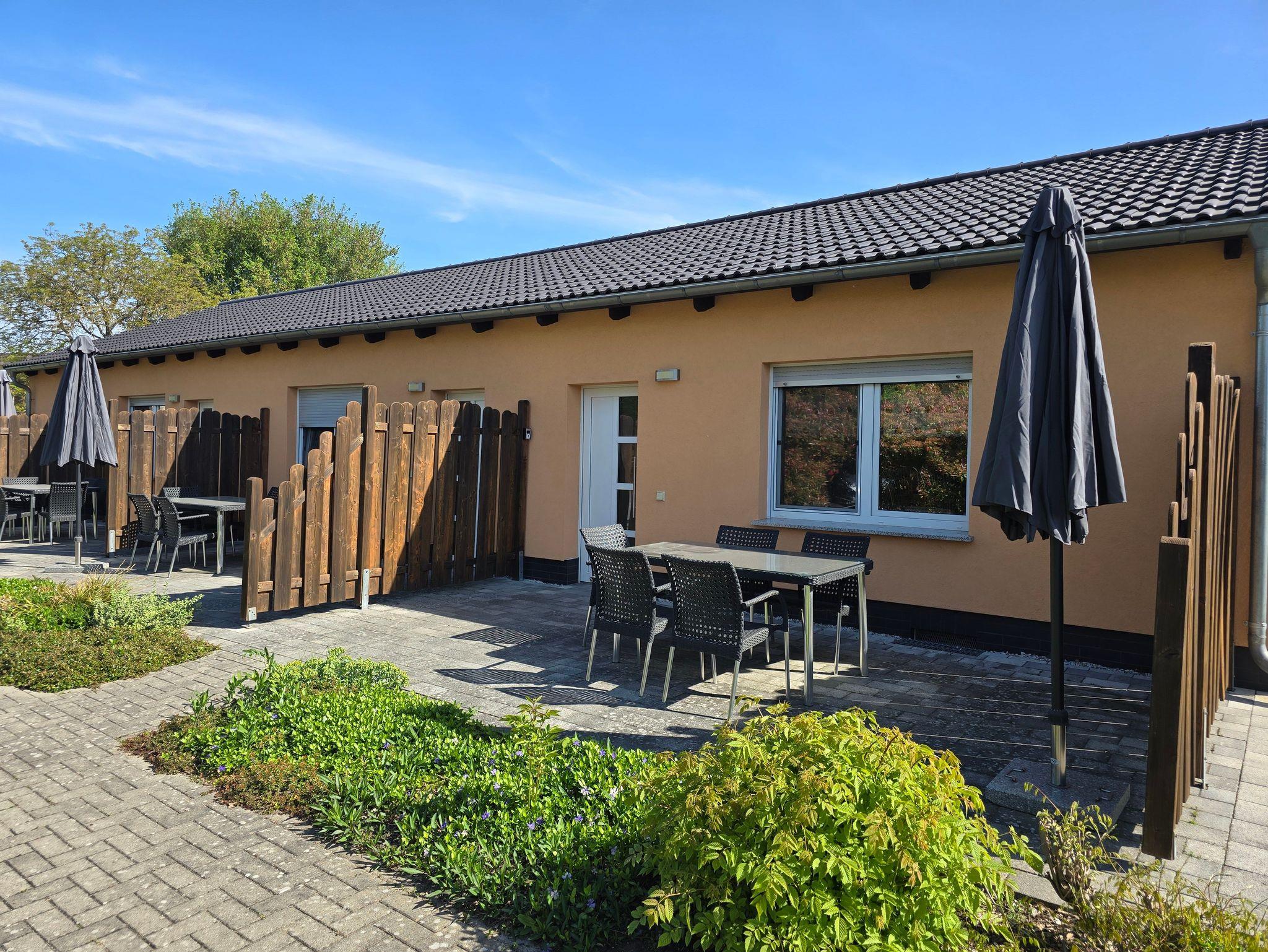 Zu jeder Wohnung gehört eine großzügige Terrasse mit Gartenmöbeln und Sonnenschirm. Ebenso gibt es einen Parkplatz auf dem Grundstück.