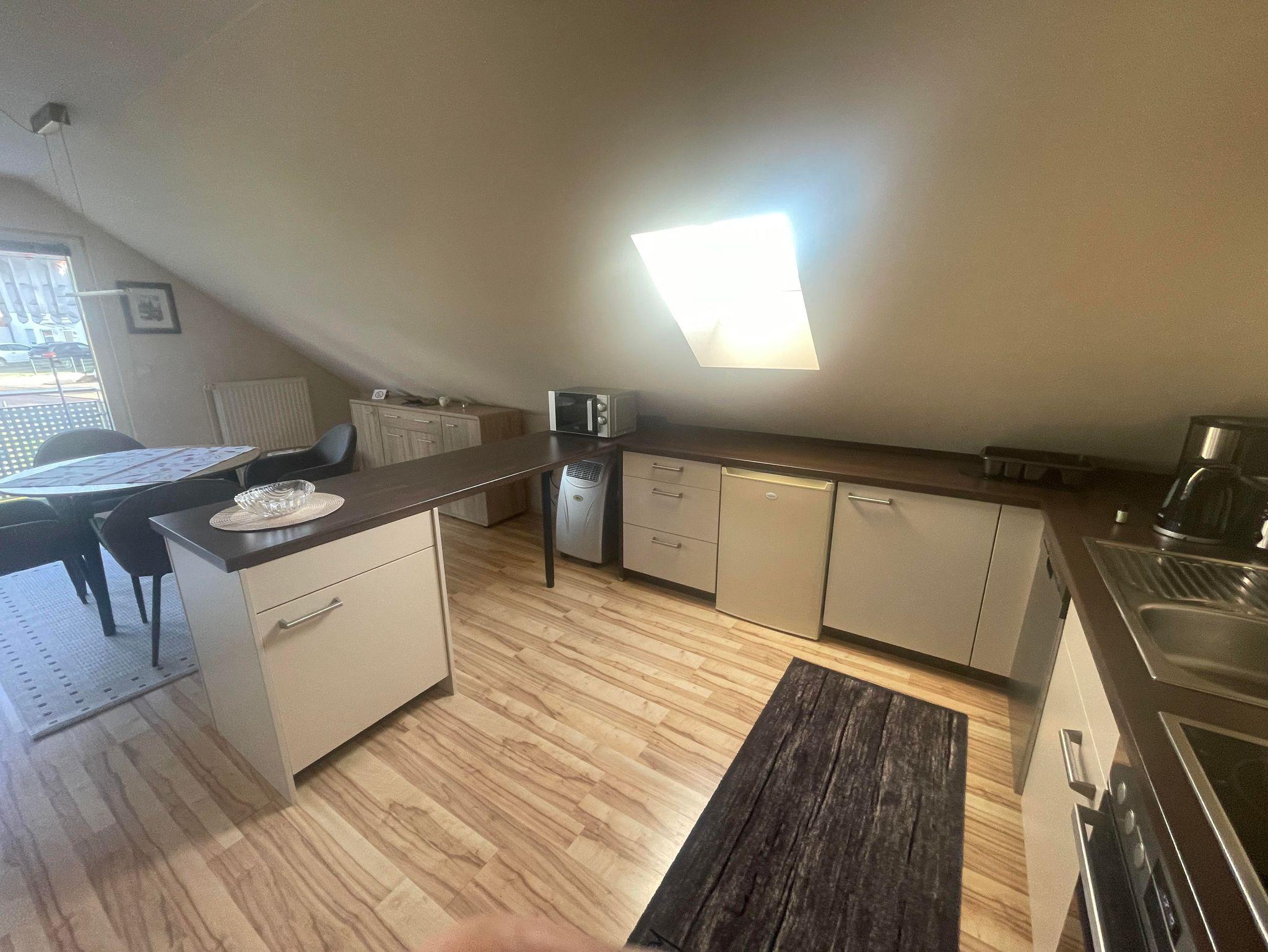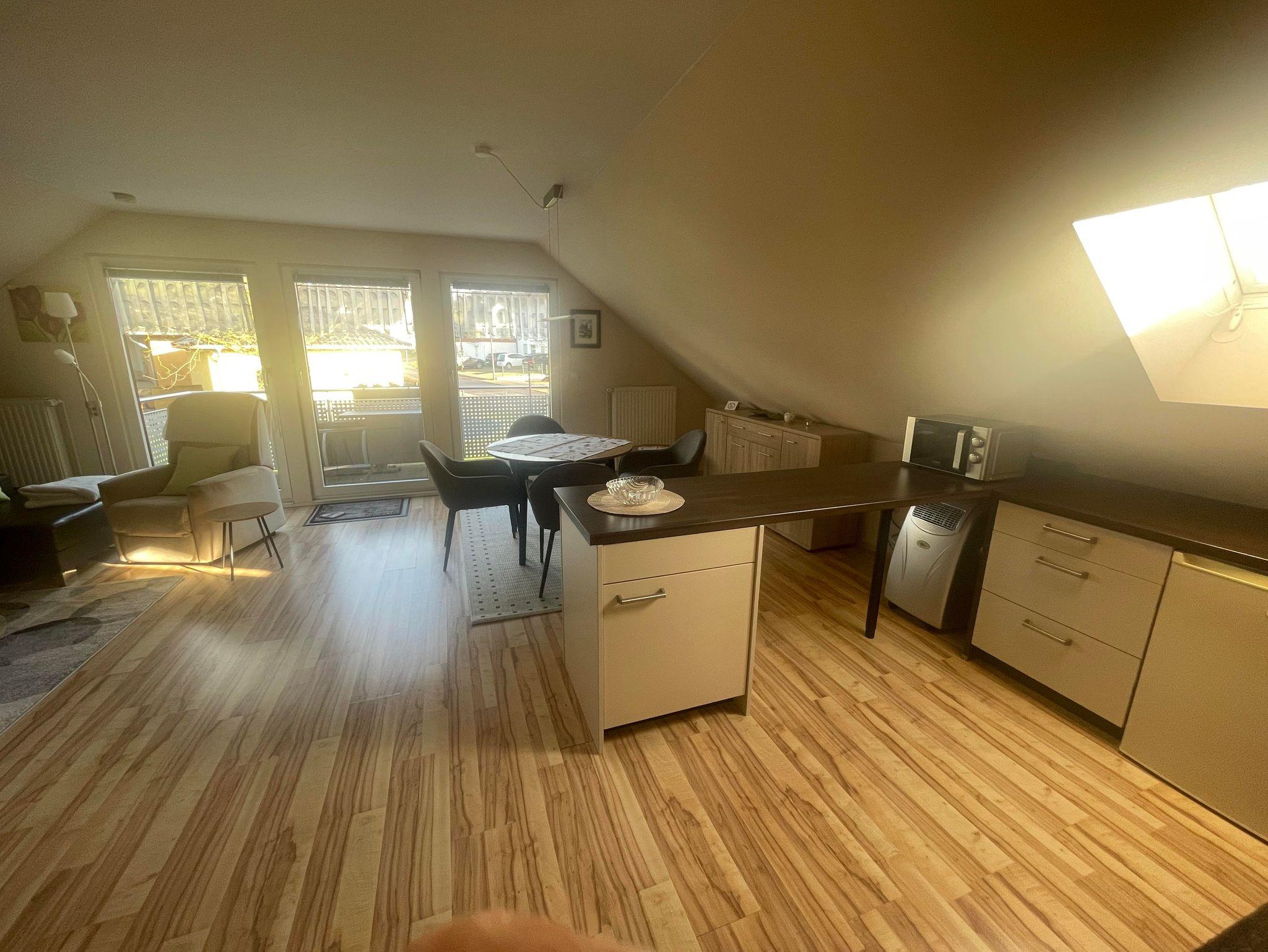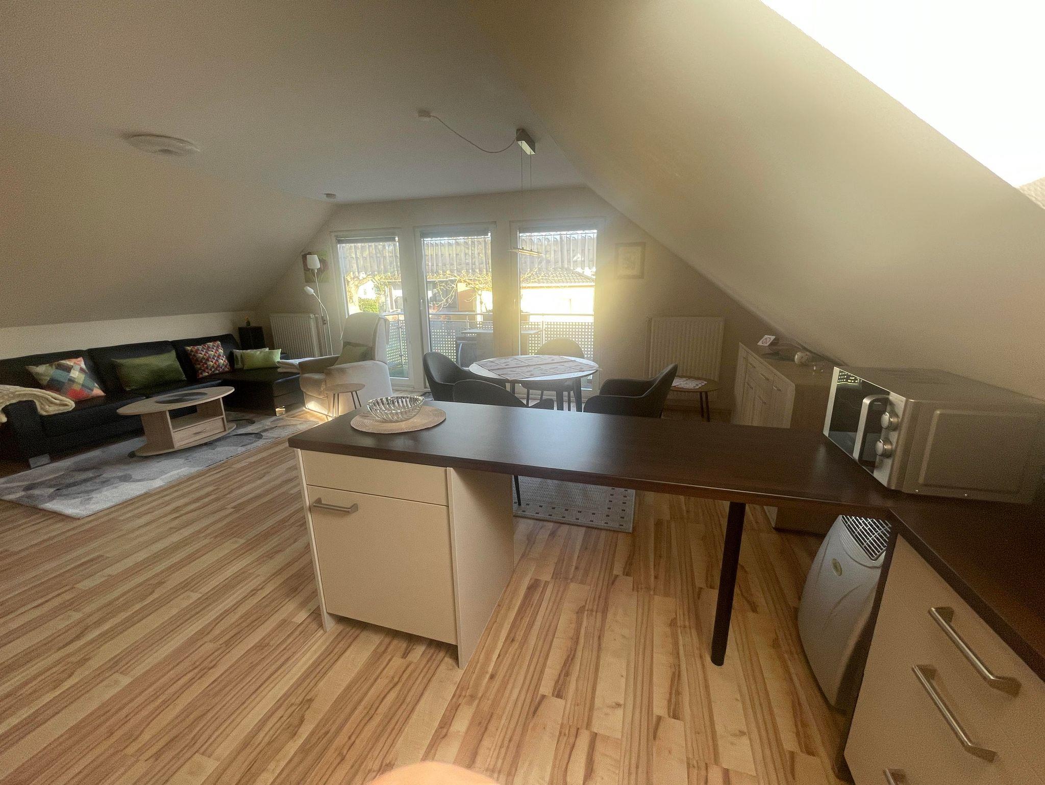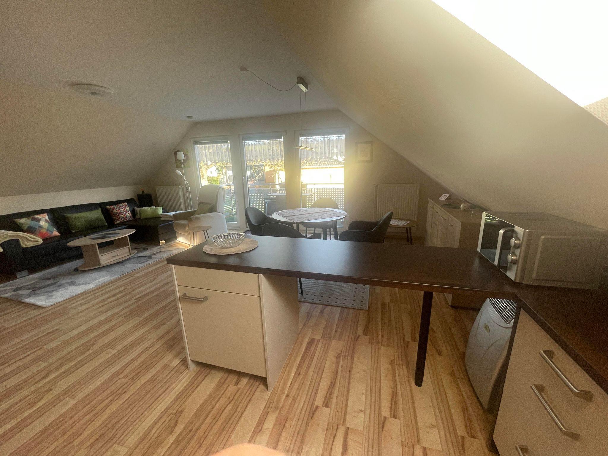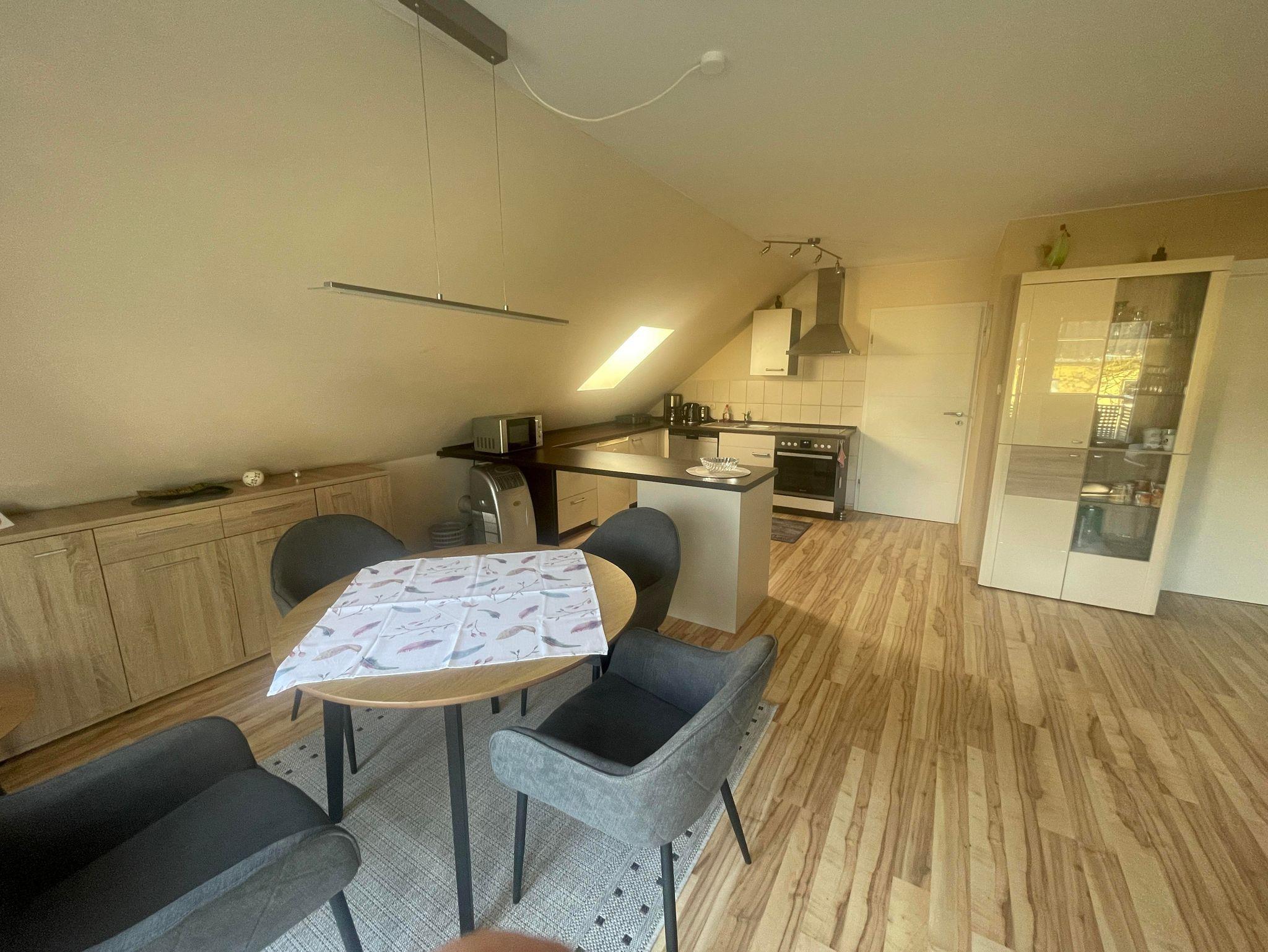 Geräumige 80 qm Ferienwohnung für 2 Personen mit separatem Eingang in der 1. Etage. Die Eigentümer wohnen selbst im Haus. Die Wohnung ist aufgegliedert in Living-Room ( Küche, Esszimmer und Wohnzimmer 45 qm ), Schlafzimmer mit Doppelbett und ein sehr großes Bad mit Waschbecken, Dusche, WC und Badmöbeln.