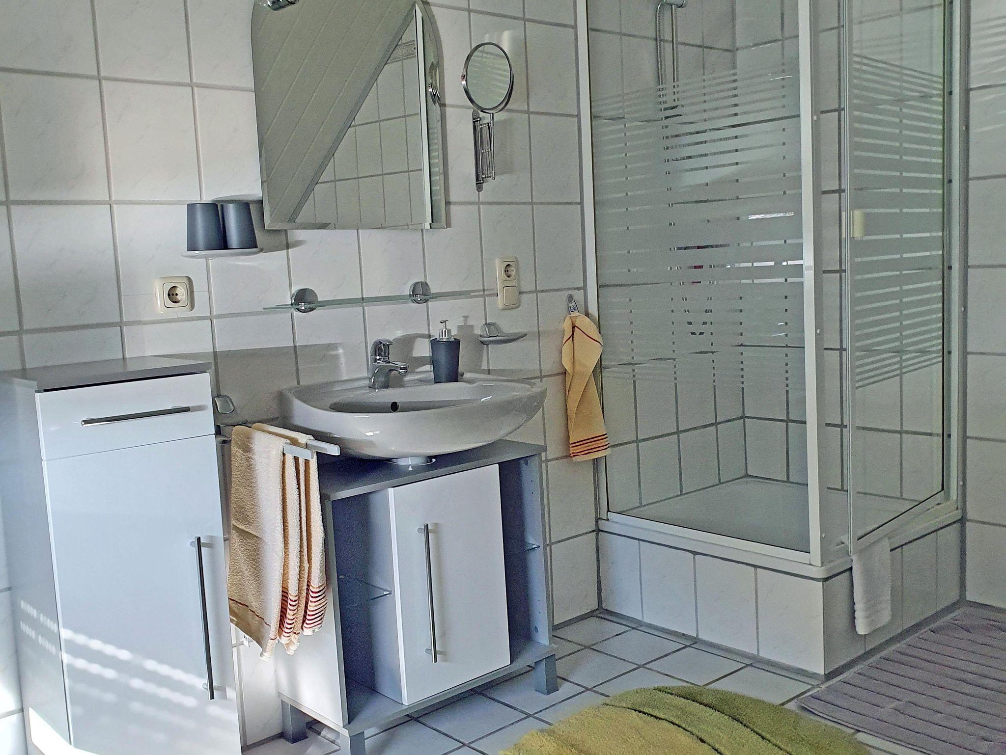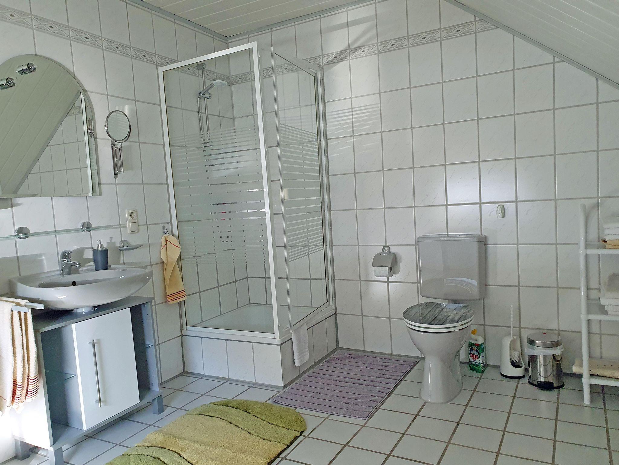 Das Bad ist komplett gekachelt, ca 20qm groß und beinhaltet eine Dusche aus Glas, WC, Waschbecken , diverse Badmöbel sowie Wäscheständer.