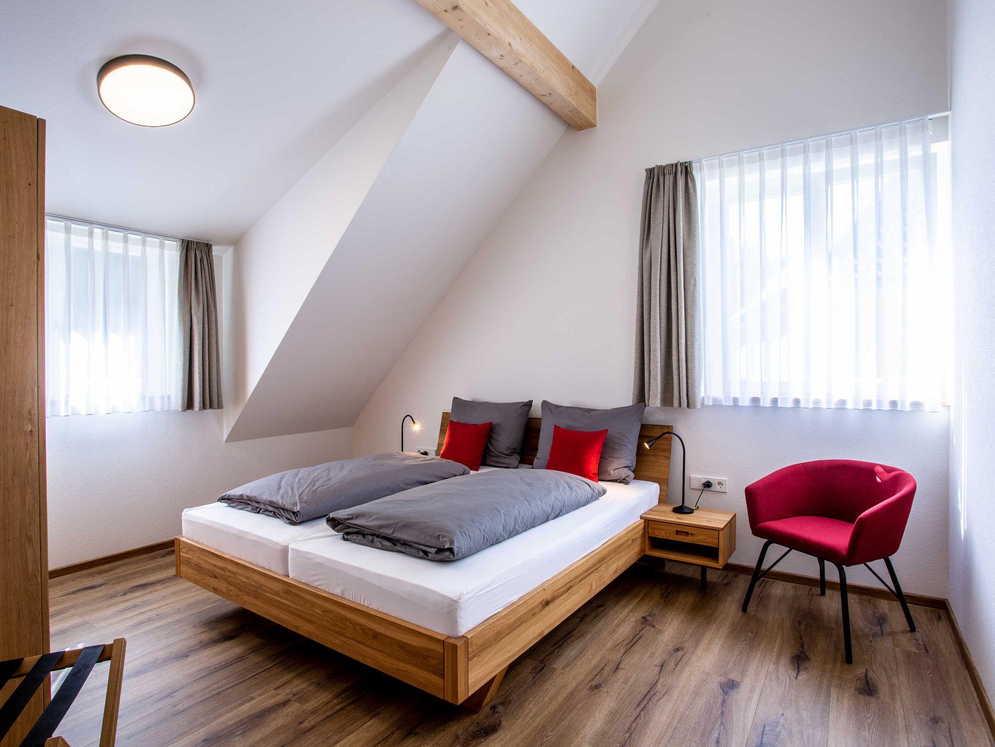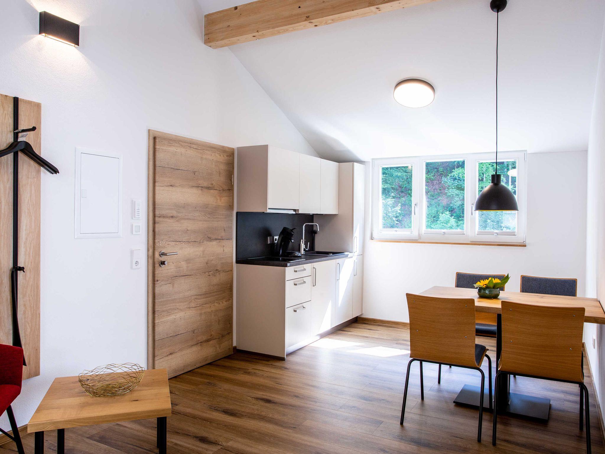 Die Ferienwohnung Weißbuche ist die zweite geräumige Wohnung im Dachgeschoss. Man hat einen schönen Blick auf den Wald, ob beim Kochen oder aus dem Schlafzimmer heraus.