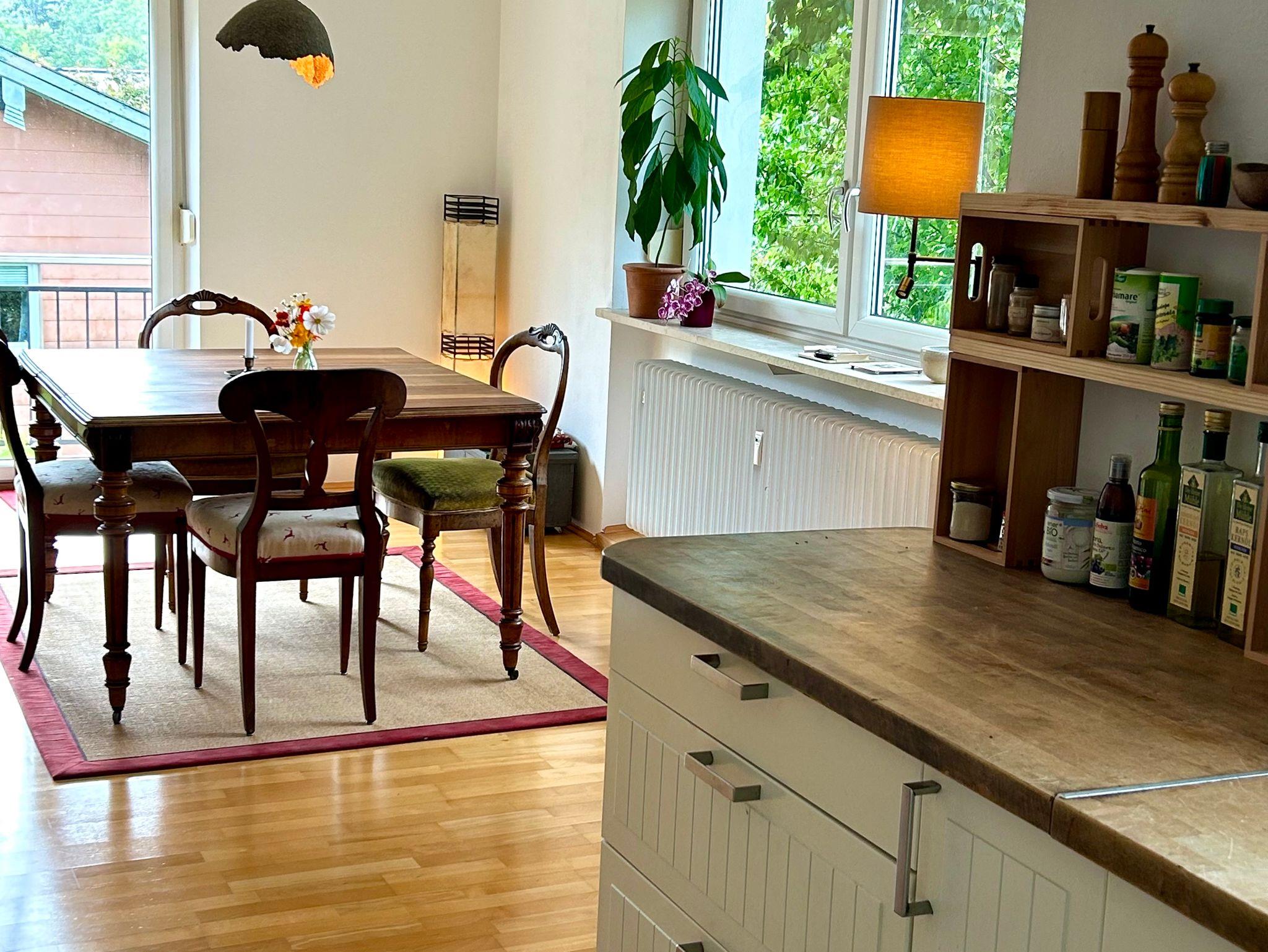 in der sonnigen Wohnung fällt die morgentliche Sonne als erstes auf den Balkon. Am Abend wirft der Sonnenuntergang seine letzten Strahlen in den Wohnbereich. Die Küche ist mit einem modernen Gasofen, Elektrobackofen und Kochutensilien wunderbar zum Kochen geeignet. Eine eingebaute Wasserverwirblung in Küche und Bad sorgt für lebendig strukturiertes Wasser. Der Holzofen lässt an kalten Tagen die Gemütlichkeit genießen.
