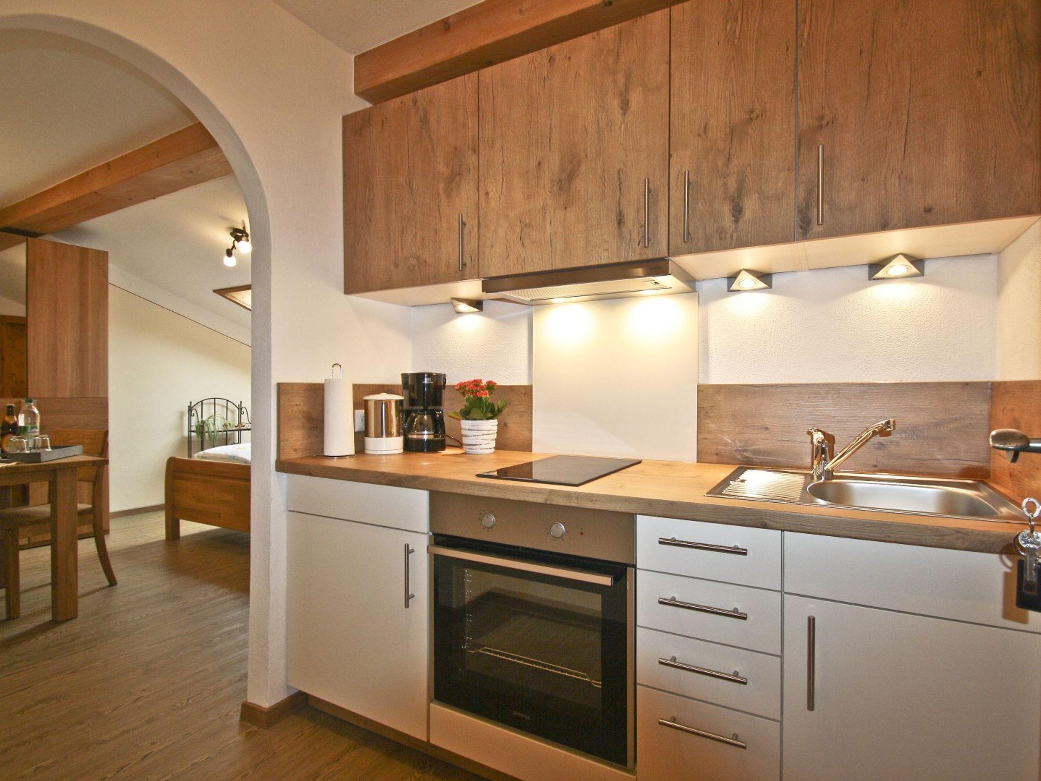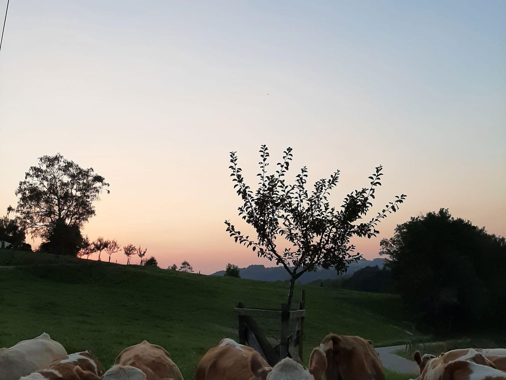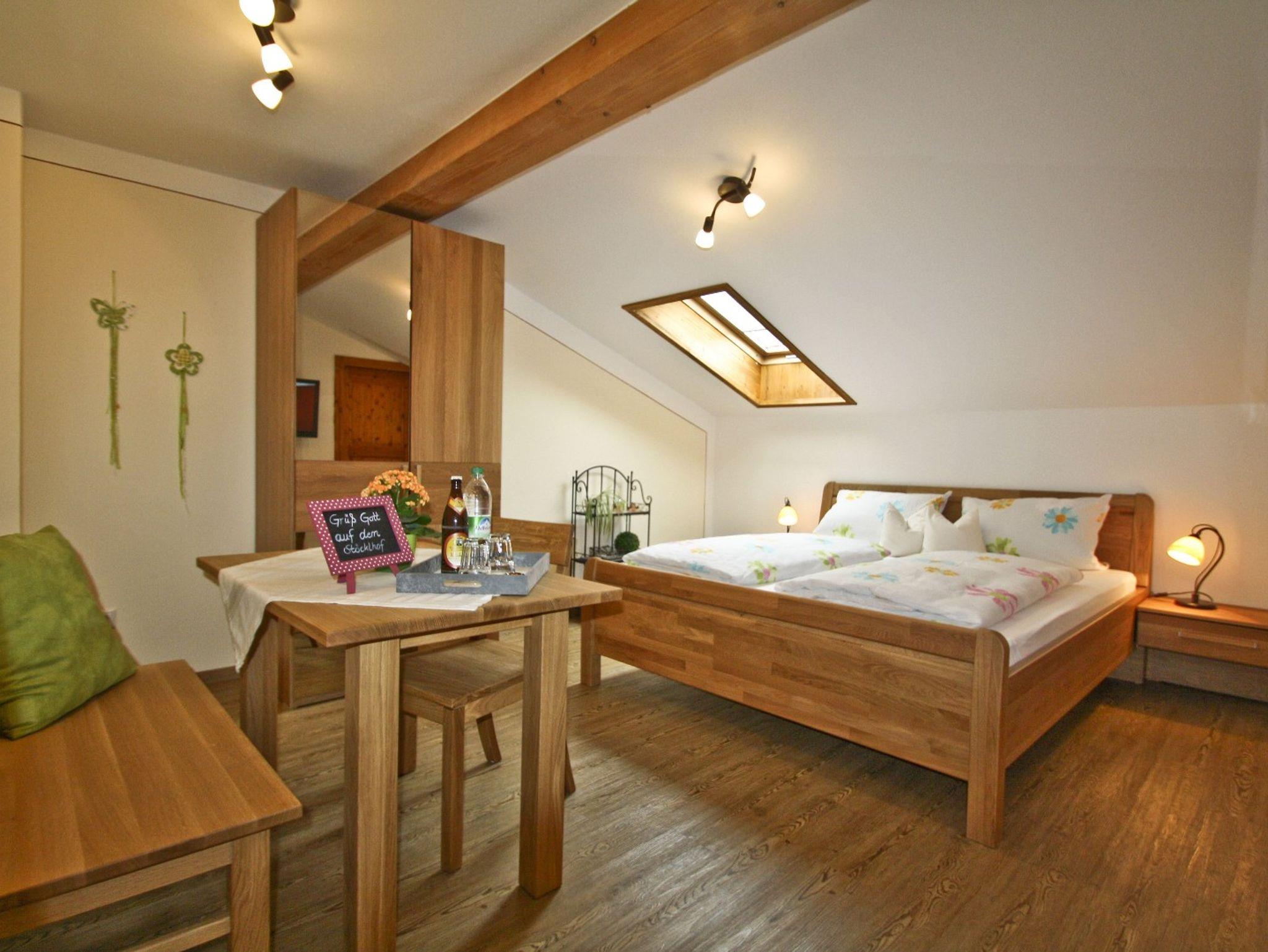 Das gemütliche neu renovierte Appartement Sternengugga im Bauernhaus, 2. Stock, Dachgeschoss (28 m²) hat einen Wohn-Schlafraum mit einem Doppelbett (1,80 x 2,00 m), Küchenzeile und ein Bad mit WC. Ausstattung: zwei Kochplatten mit Backrohr, Kühlschrank mit Gefrierfach, Wasser-, Eierkocher, Toaster, Kaffeemaschine, Flachbildfernseher, Radio, Babyausstattung (Hochstuhl, Babybett und Wickelauflage) ist vorhanden und nach Absprache verfügbar. Ein Reisebett kann jederzeit dazugestellt werden. Bettwäsche, Handtücher und Geschirrtücher werden gestellt. Unsere Ferienwohnung wurde vom DTV mit 3 Sternen ausgezeichnet. Unsere Wohnungen sind für Allergiker geeignet, deshalb können wir keine Haustiere aufnehmen!