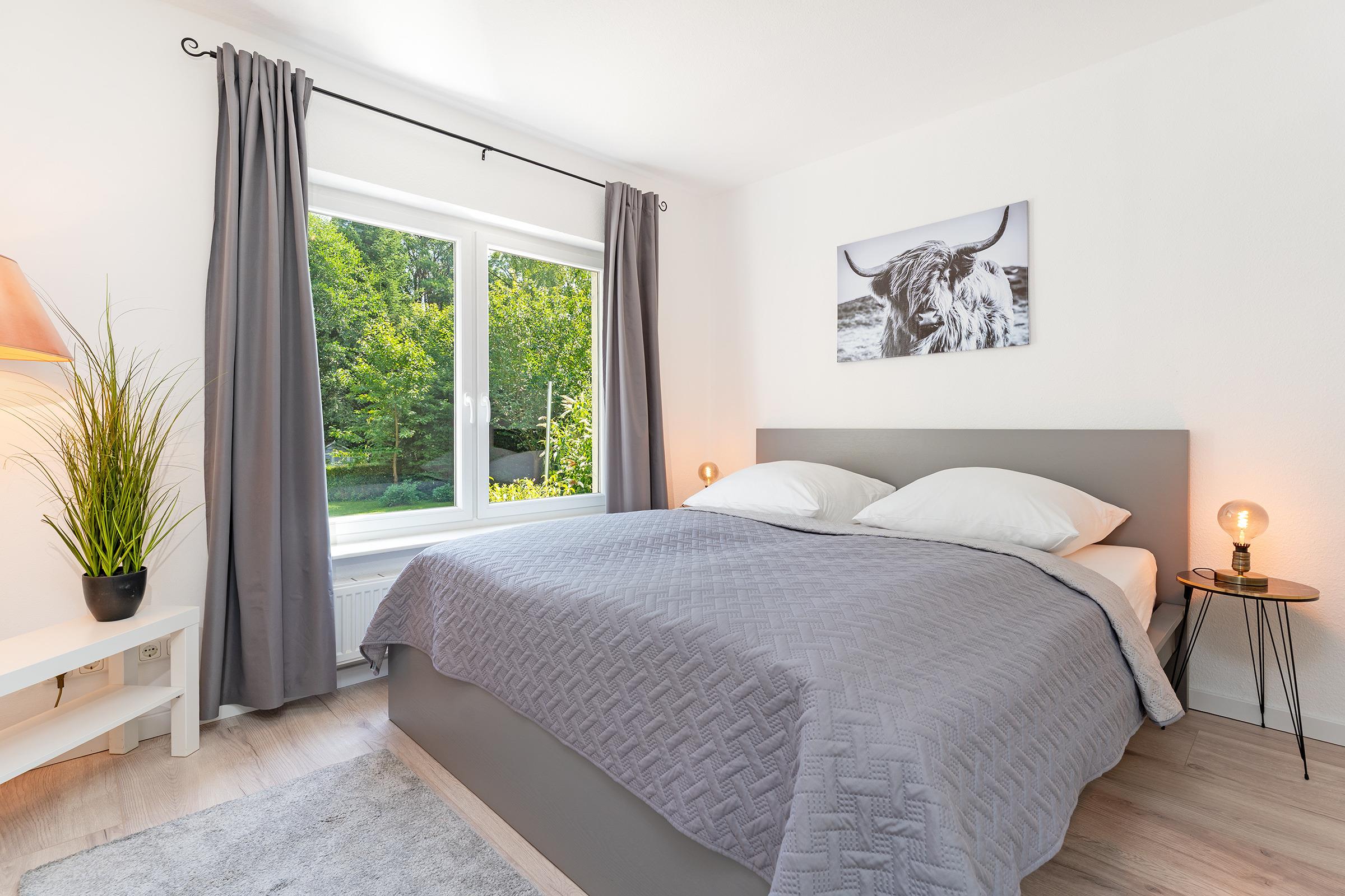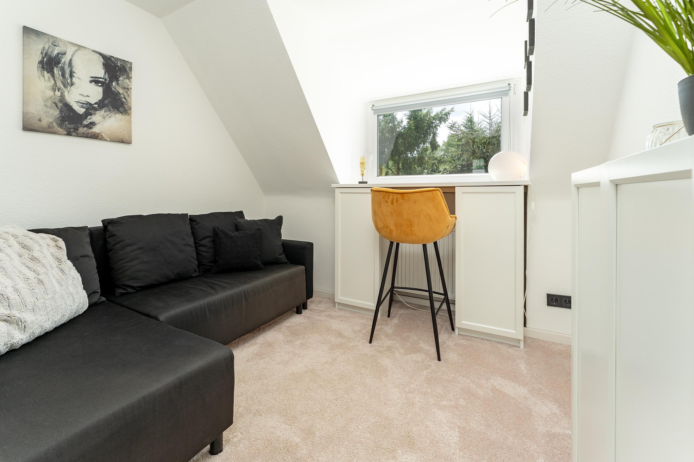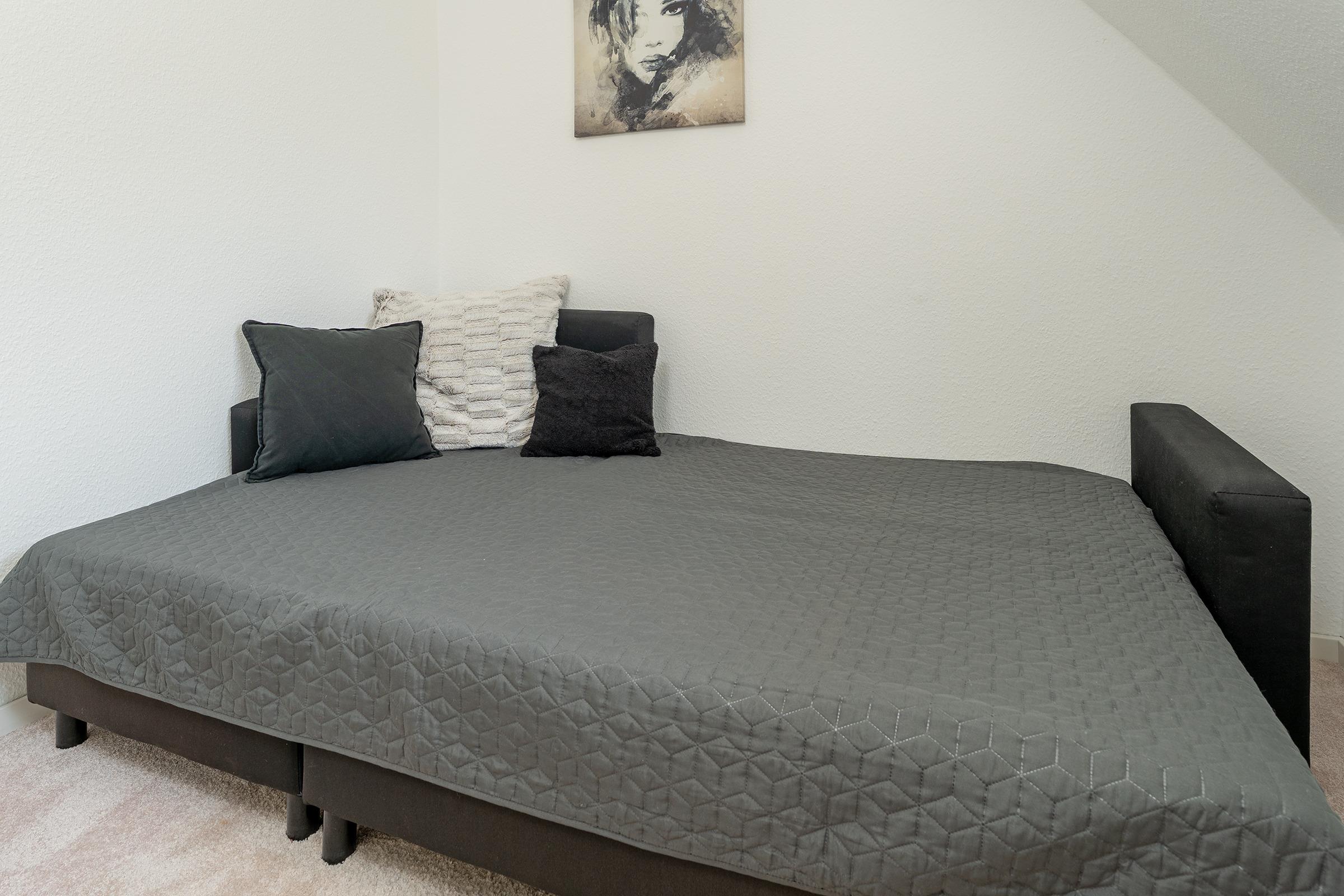 Im Obergeschoss befinden sich drei gemütlich eingerichtete Schlafzimmer: Das erste Schlafzimmer ist mit einem komfortablen Doppelbett (180×200?cm) ausgestattet. Im zweiten Schlafzimmer steht ein weiteres Doppelbett (2x 80×200?cm) zur Verfügung. Das dritte Zimmer bietet ein Schlafsofa (140×200?cm) und eignet sich ideal für Kinder oder flexible Schlafmöglichkeiten. Im Erdgeschoss befindet sich ein weiteres Schlafzimmer mit einem Doppelbett (2x 90×200?cm) – ideal für Gäste, die auf eine ebenerdige Unterkunft angewiesen sind oder einfach mehr Rückzugsmöglichkeiten wünschen. Ihre Urlaubsgarderobe verstauen Sie mühelos im jeweiligen Kleiderschrank. Im Obergeschoss erwartet Sie ein modern ausgestattetes Vollbad. Zusätzlich befindet sich im Erdgeschoss ein praktisches Gäste-WC.