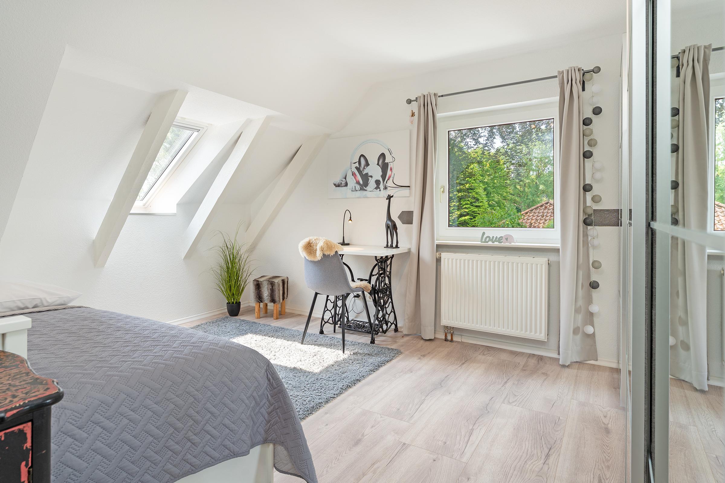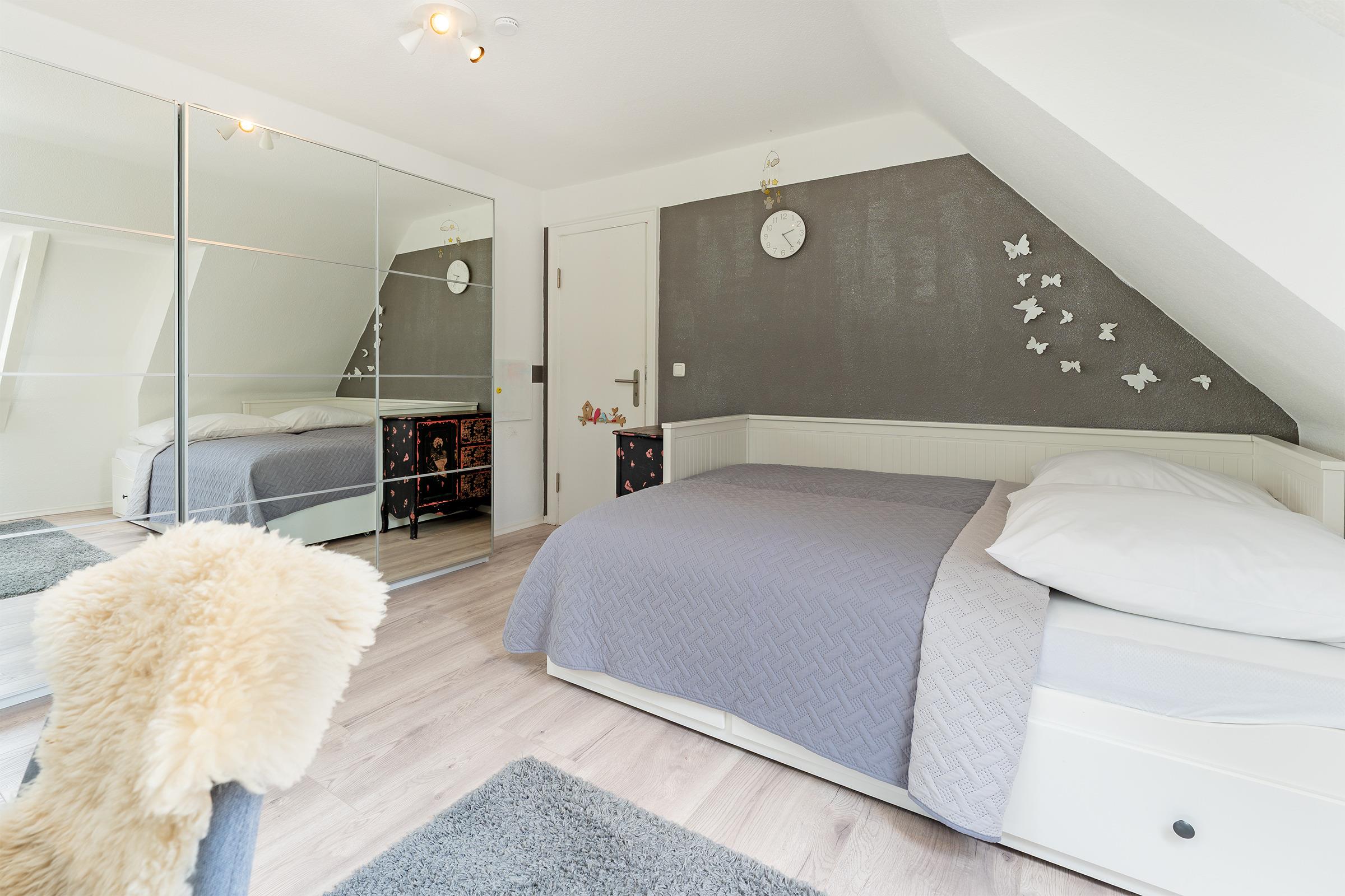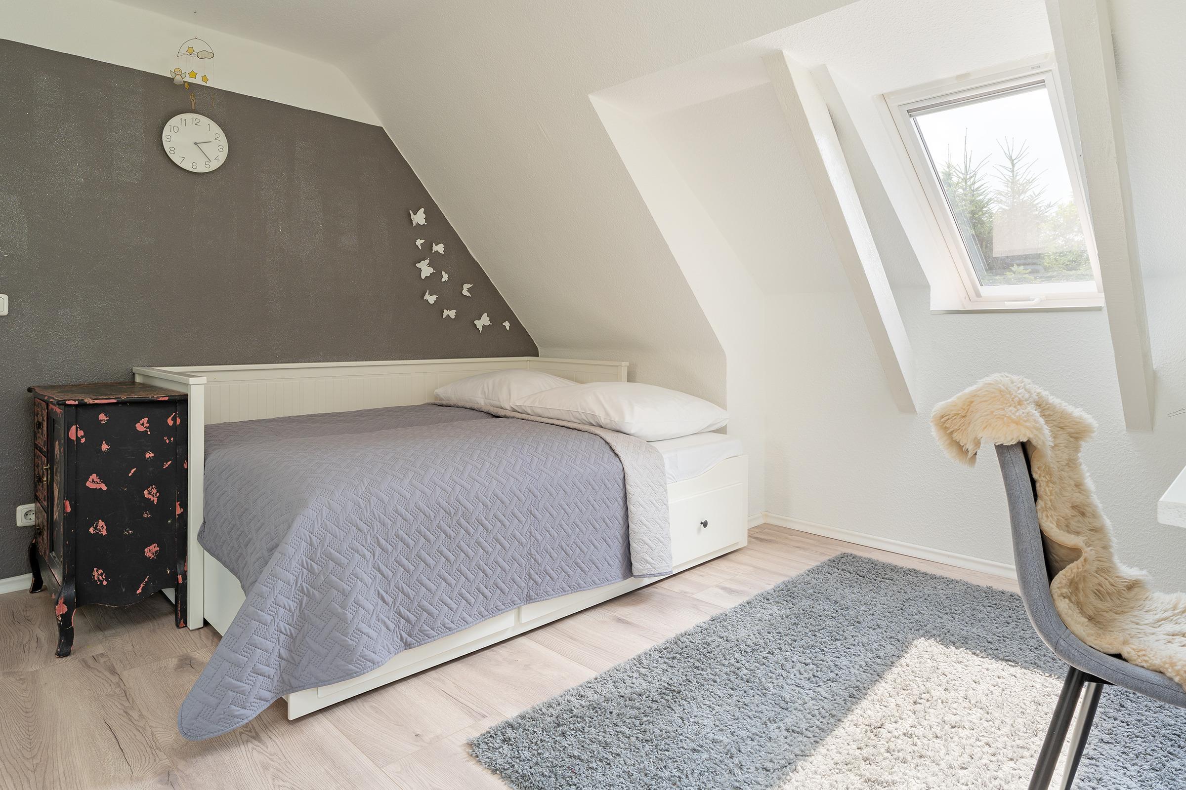 Schlafzimmer 2 (OG): 1 Doppelbett (2x 80x200 cm), Kleiderschrank, Verdunkelung: Gardine, Platz für Babybett vorhanden