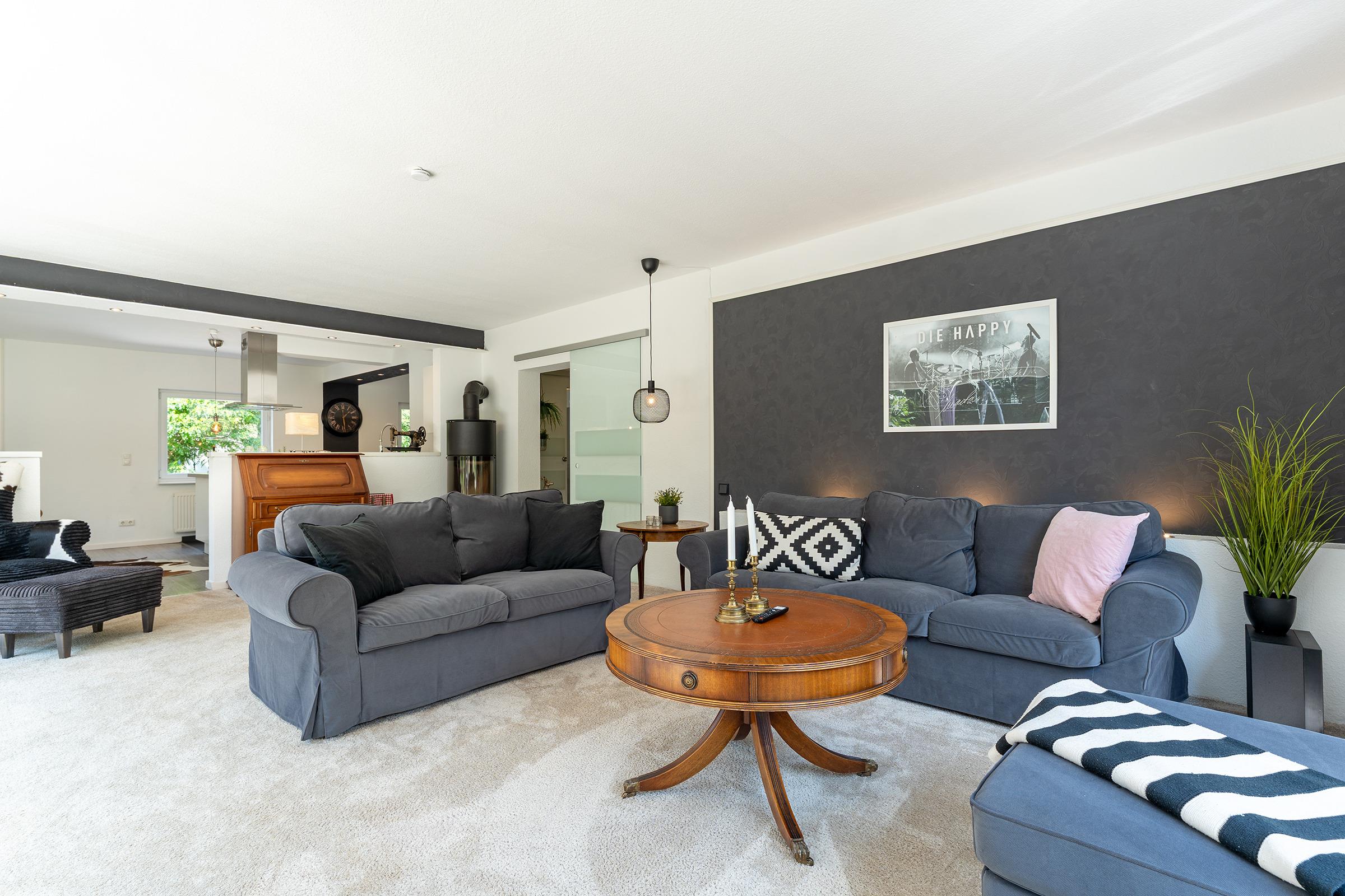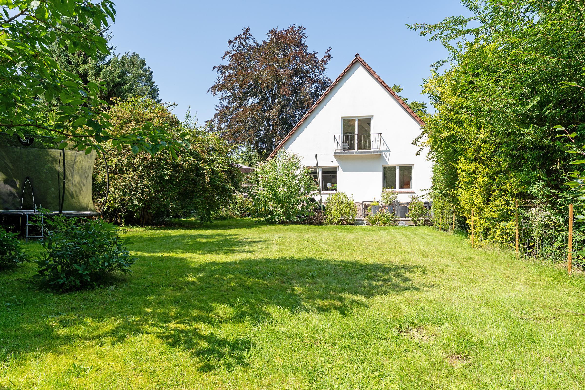 Der einladende Wohnbereich im Erdgeschoss ist das Herzstück des Hauses. Hier entspannen Sie auf einer gemütlichen Couch am wärmenden Kaminofen – ideal für gemütliche Abende. Die angrenzende, offene Küche ist vollständig ausgestattet und lässt keine Wünsche offen. Im Außenbereich erwarten Sie zwei möblierte Terrassen, ideal für Mahlzeiten im Freien oder einen entspannten Abend mit Freunden. Der eingezäunte Garten sorgt für Sicherheit – auch für Ihre Vierbeiner – und bietet mit Schaukel und Trampolin zusätzlichen Spaß für die Kinder.