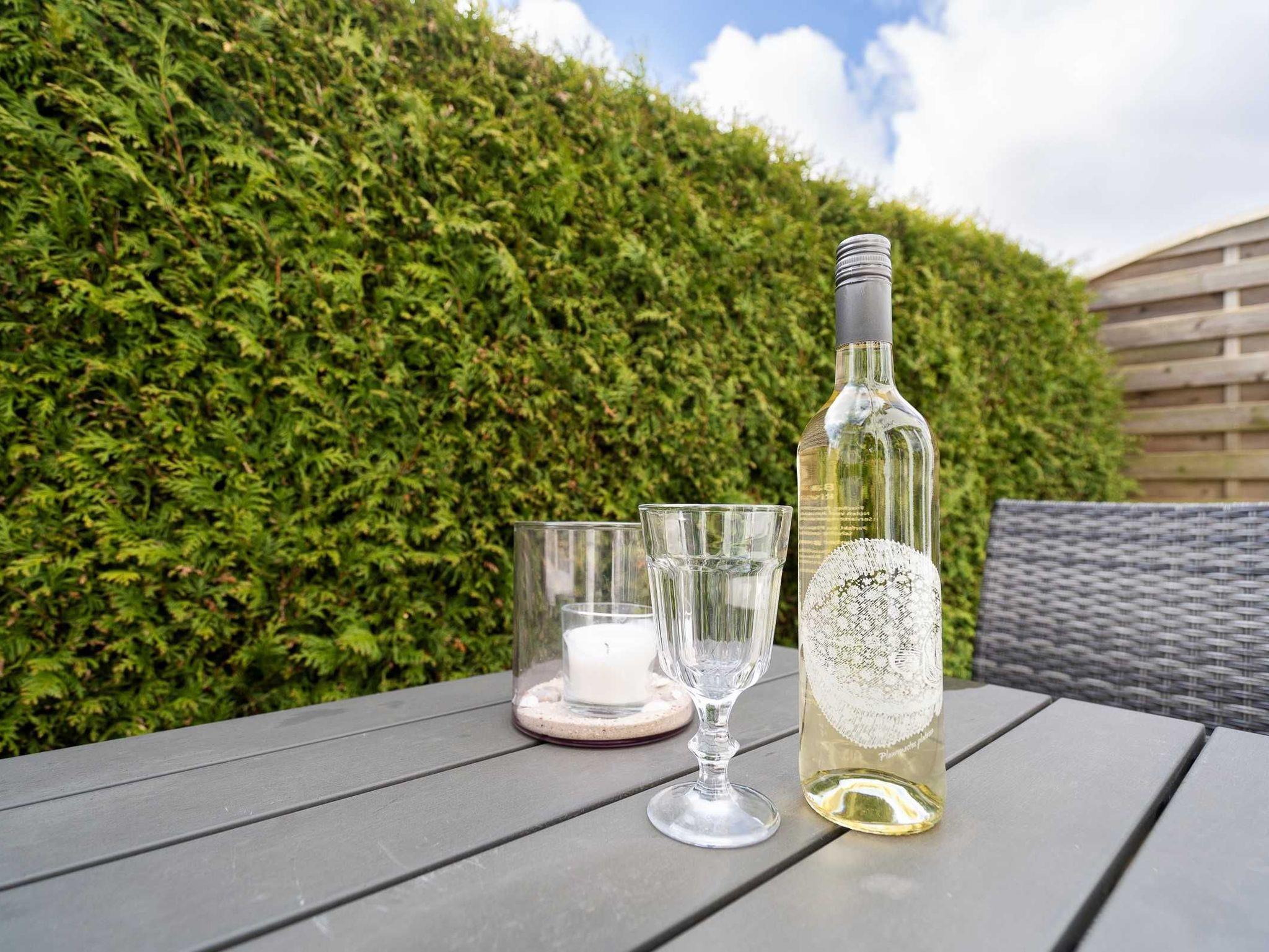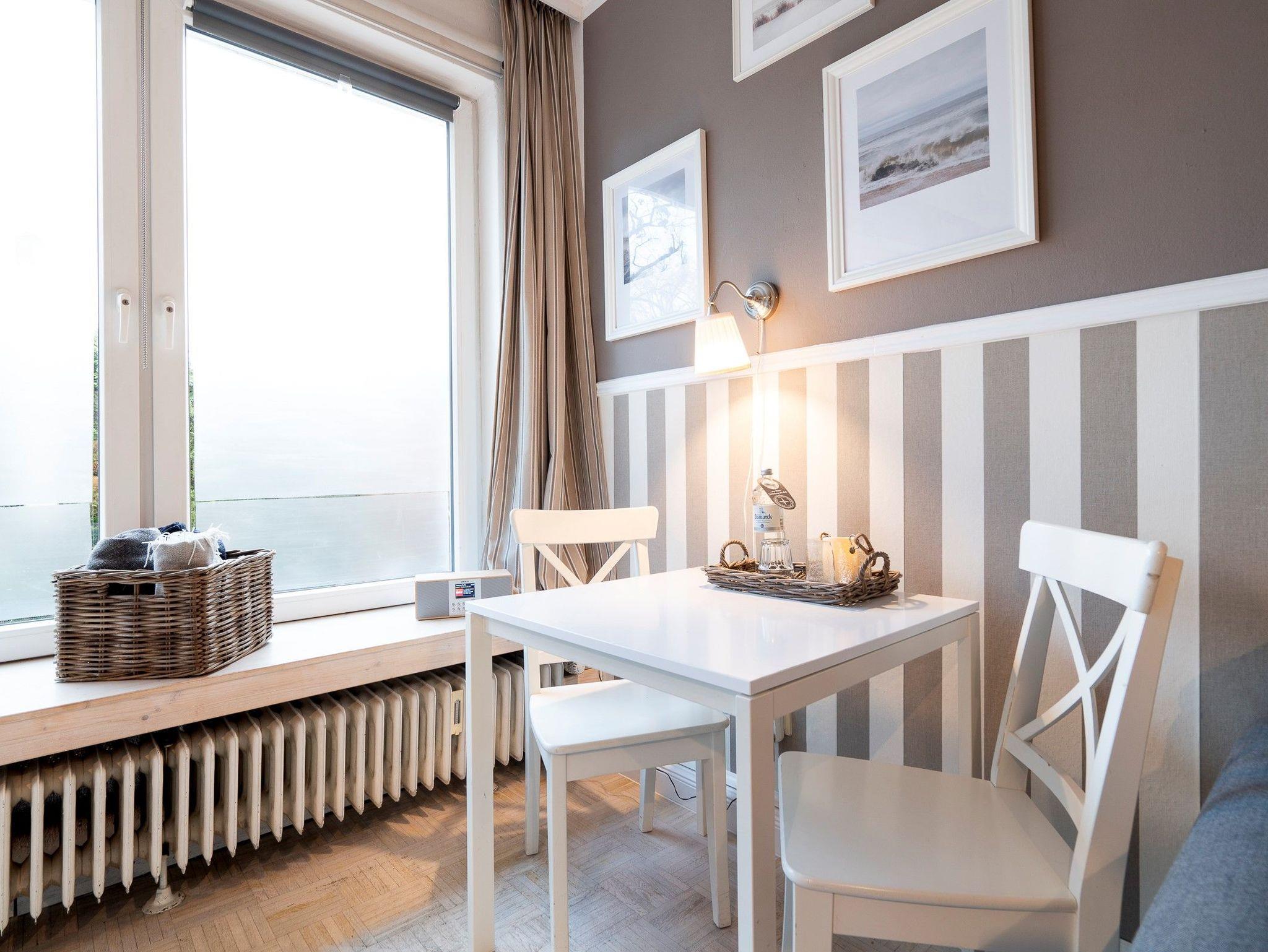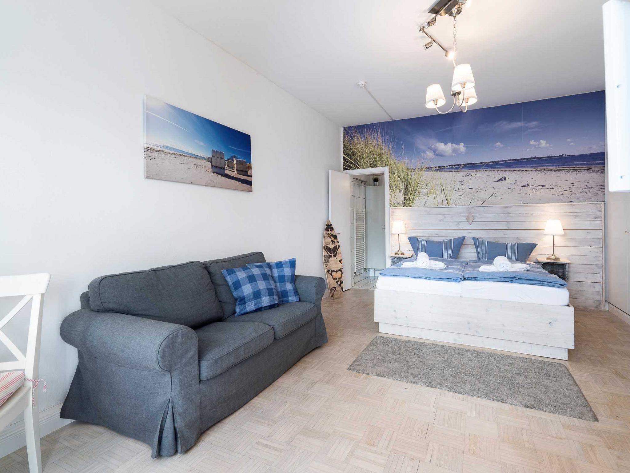 Die 1-Zimmer-Studio-Ferienwohnung ist im Winter 2023/24 neu renoviert und eingerichtet. Ob allein oder zu Zweit: hier finden unsere Gäste alles, was man braucht. Die Wohnung besteht aus einem Zimmer mit Küche, einem Vollbad und einer Terrasse mit Tisch und Stühlen. Es gibt ein 160 cm Doppelbett mit Strandpanorama, ein Sofa und einen Fernseher. In der Küchenecke finden sich neben einem 2-Platten-CeranKochfeld mit Mikrowelle und einem Kühlschrank mit Gefrierfach auch ein Wasserkocher und eine Kaffeemaschine. Es sind ausreichend Geschirr, Töpfe und Pfannen für 2 Personen vorhanden. Eine eigene Terrasse mit Tisch und Stühlen gehört auch zu der Wohnung.