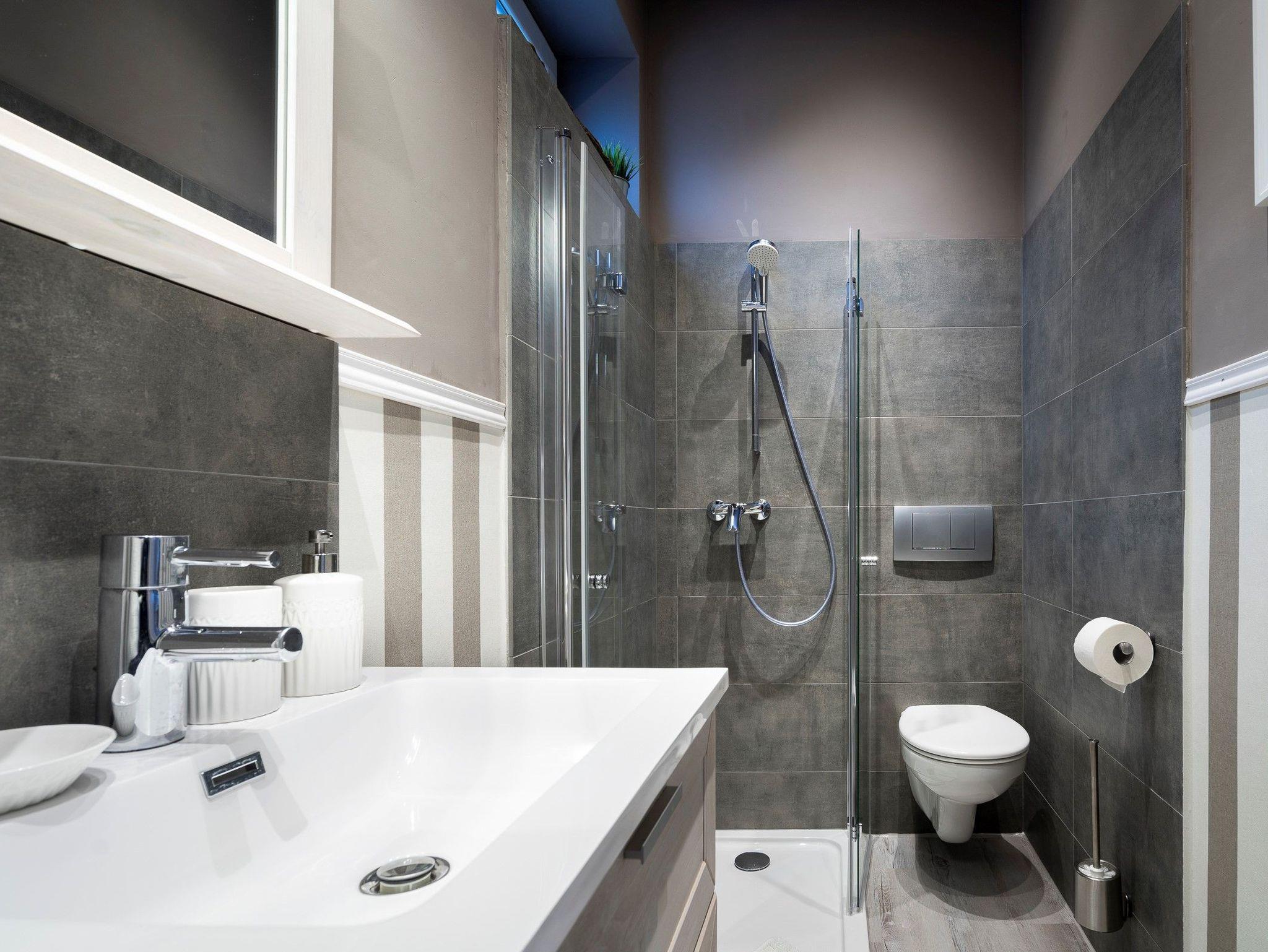 Das Bad hat eine Badewanne mit Spritzschutz zum Duschen und einen großen Handtuch-Heizkörper. Mit hochwertigem Hänge-WC. Der Waschtisch ist aus Porzellan und Echtholz-Schrank mit einer Schublade mit Steckdose und einem Föhn.