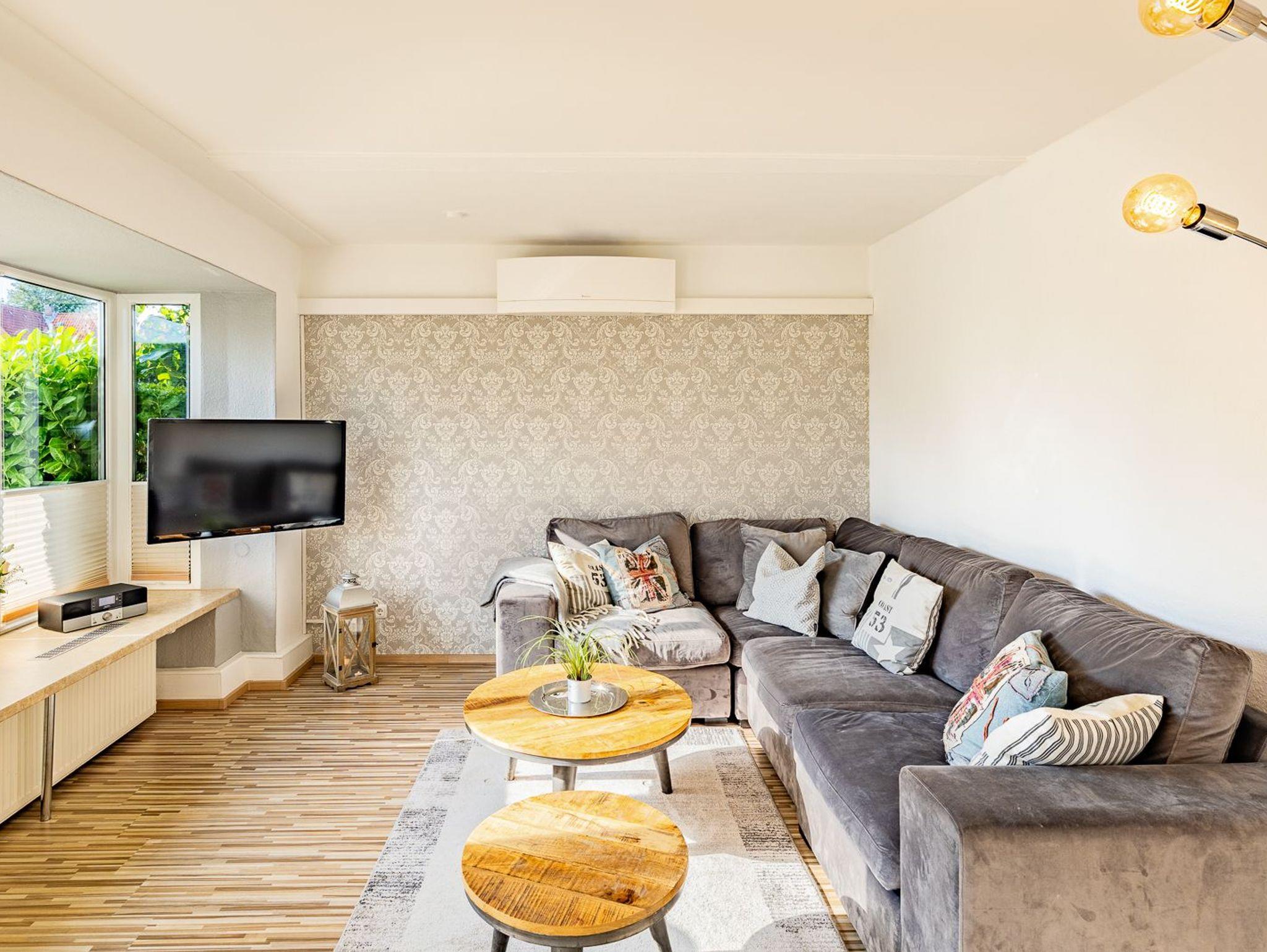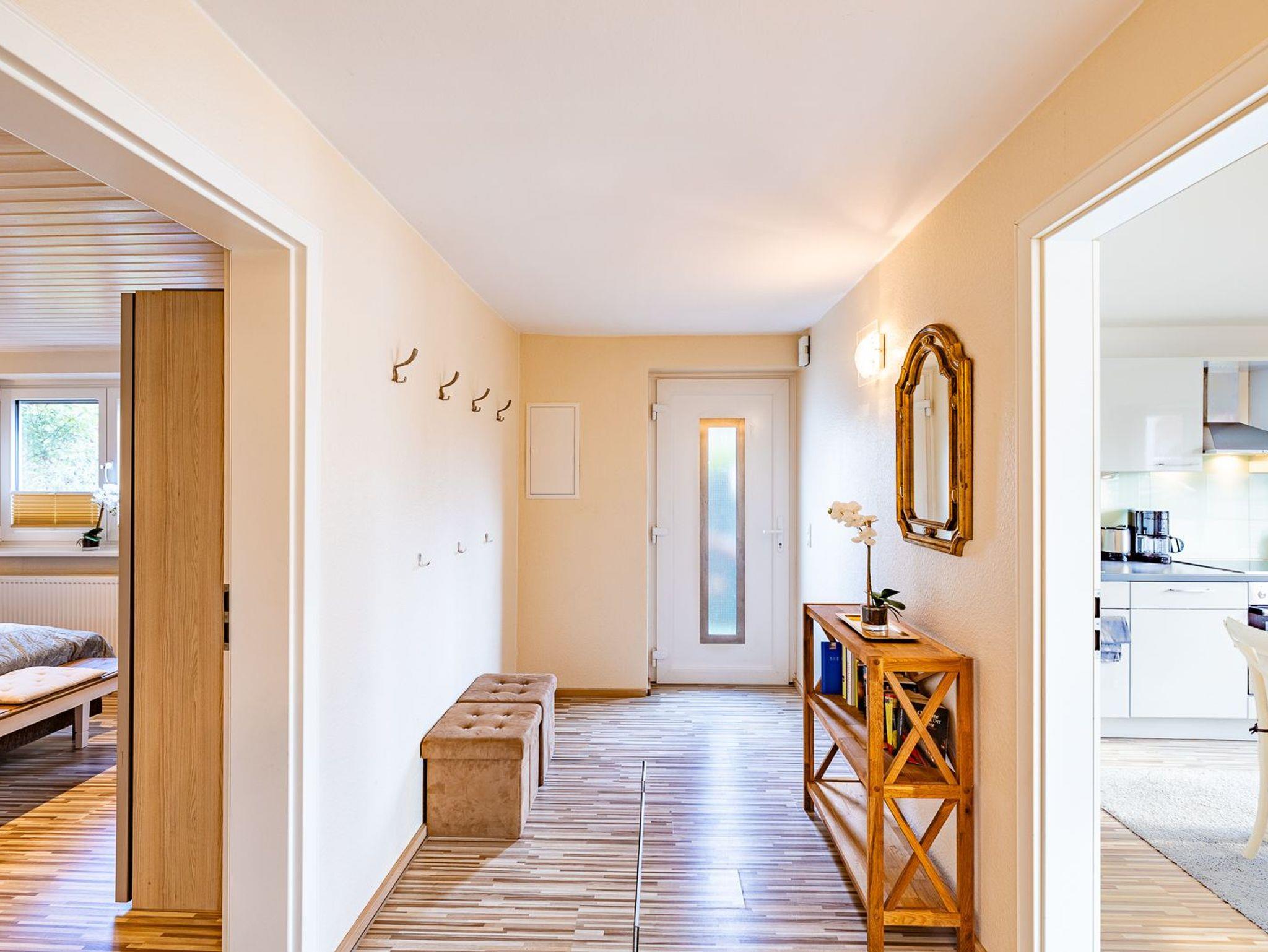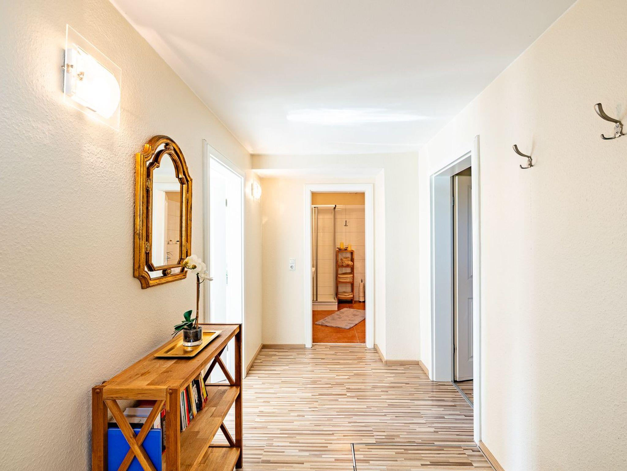Neben dem großzügigen Eingangsbereich gibt es zwei Schlafzimmer, zwei vollausgestattete Bäder (davon ein Bad mit Waschmaschine) und einen gemütlichen Wohn-Essbereich, der im Winter 2023/24 neu möbliert wurde.