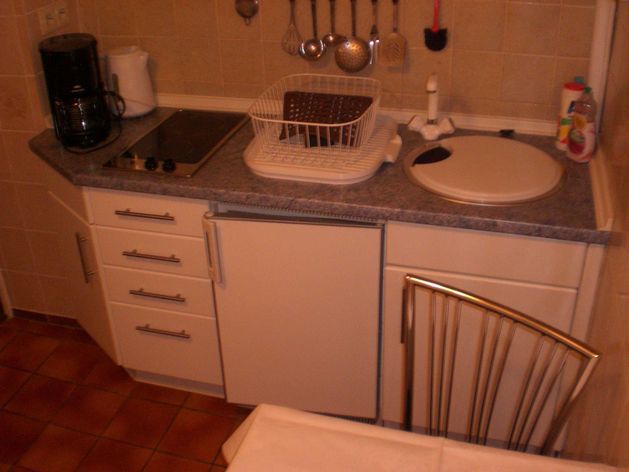 In der Küche sind Kühlschrank, Mikrowelle und Kaffeemaschine vorhanden.