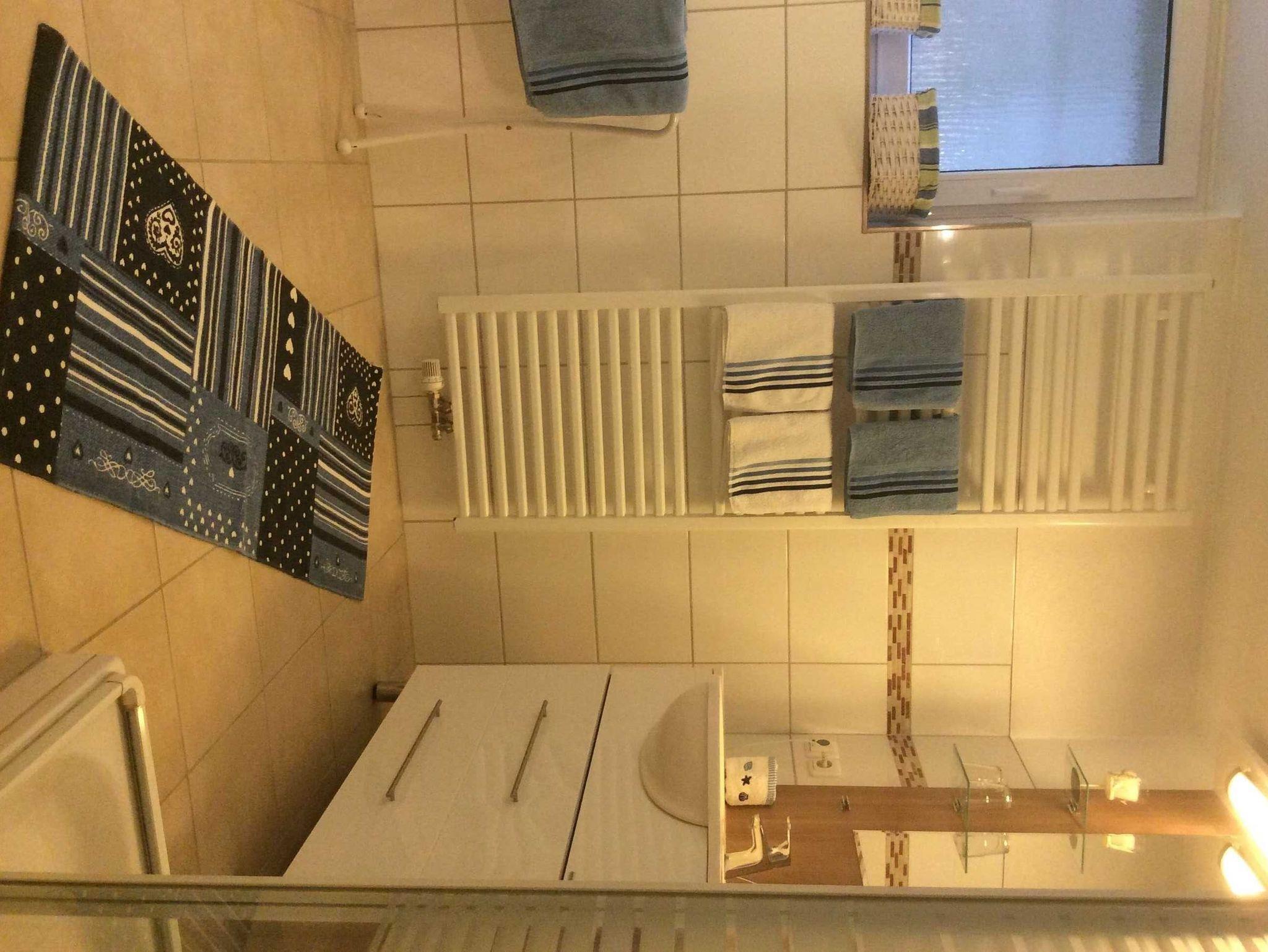 Die Ferienwohnung Nr. 2 liegt im Halb-Souterrain (aufgrund der Hanglage) und hat auch einen eigenen Eingang. Alle Wohnräume sind lichtdurchflutet. Vom Flur gehen alle Zimmer ab. Es gibt ein separates Schlafzimmer mit Schrank und einem Ehebett. Auch im Wohnzimmer kann die Couch als Schlafmöglichkeit genutzt werden. Im Kinderzimmer gibt es für 4 weitere Personen Platz zum Schlafen. Das Bad ist mit einer Dusche sowie einer Badewanne und der Waschmaschine ausgestattet. Das WC ist separat gleich nebenan. Die Küche ist mit allem, was man zum Kochen und Genießen braucht, sehr gut ausgestattet. Sie befindet sich im Wohnraum mit angrenzender Essecke. Der Boden ist mit Fliesen und Teppichboden ausgestattet. Die Fenster lassen sich durch ein Außenrollo verschließen. Draußen vor dem Haus befindet sich eine Sitzmöglichkeit für 2 Personen. Hinter dem Haus gibt es eine ruhige, gemütliche Sitzecke, die auch zum Grillen genutzt werden kann. Man erreicht sie über eine Treppe neben dem Haus. Als optionale Serviceleistungen können Bettwäsche und Handtücher dazugebucht werden.