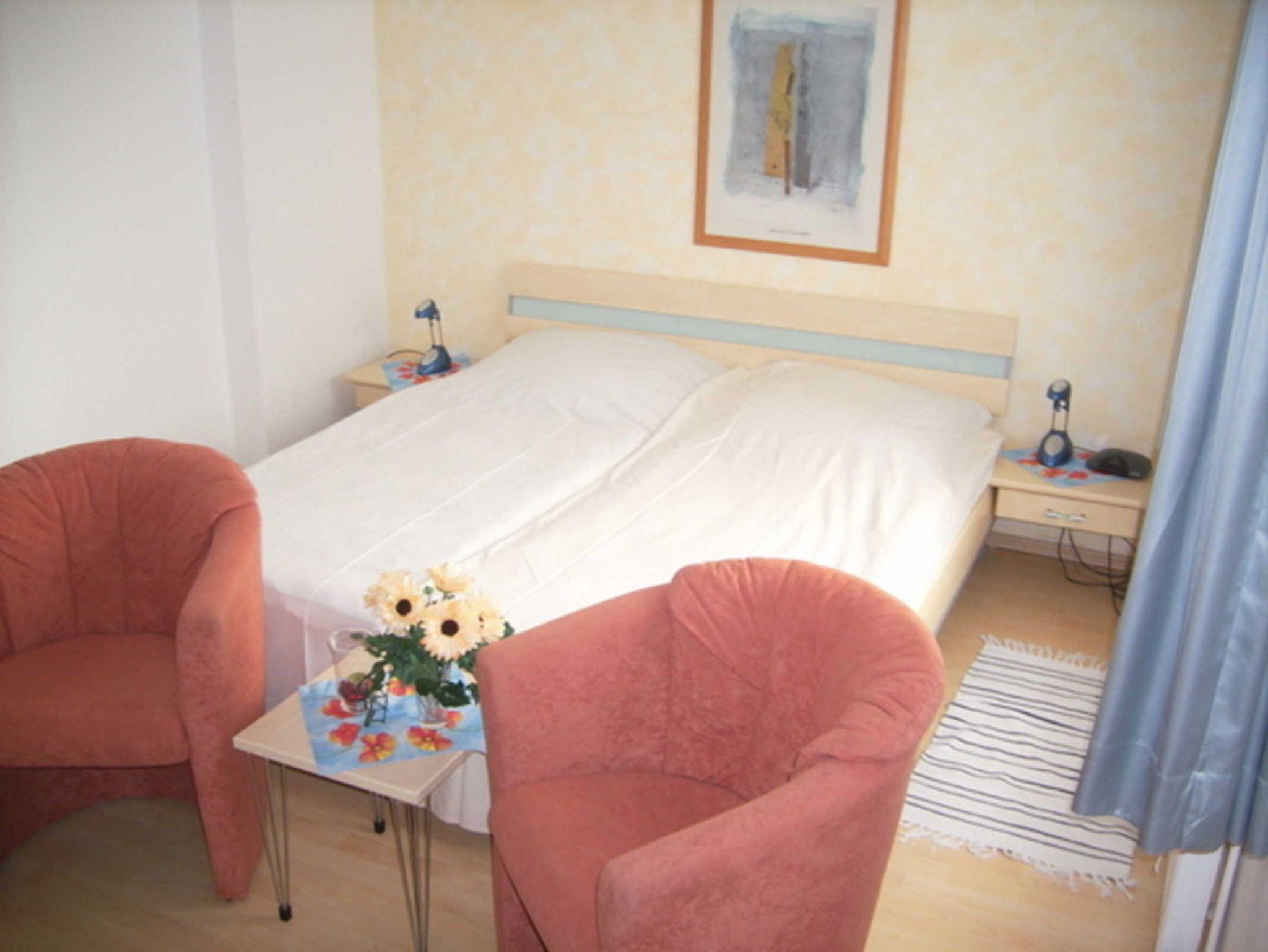 Das ca. 25 m² große 1-Raum-Appartement im Erdgeschoss des Gästehauses hat einen kombinierten Wohn-/ Schlafraum mit Doppelbett. Zur gut ausgestatteten Pantry-Küche gibt es im angrenzenden Vorraum einen kleinen Essbereich.