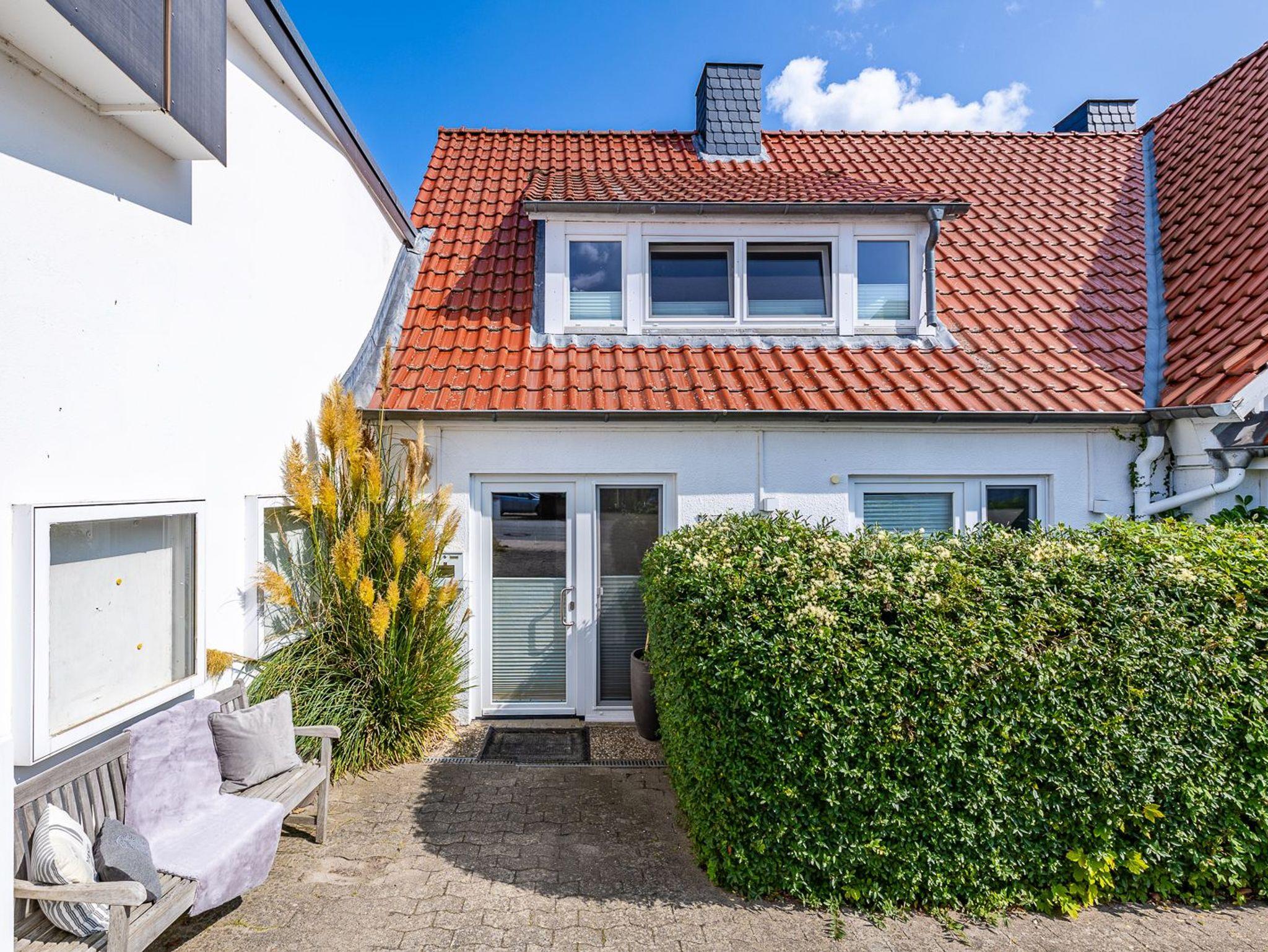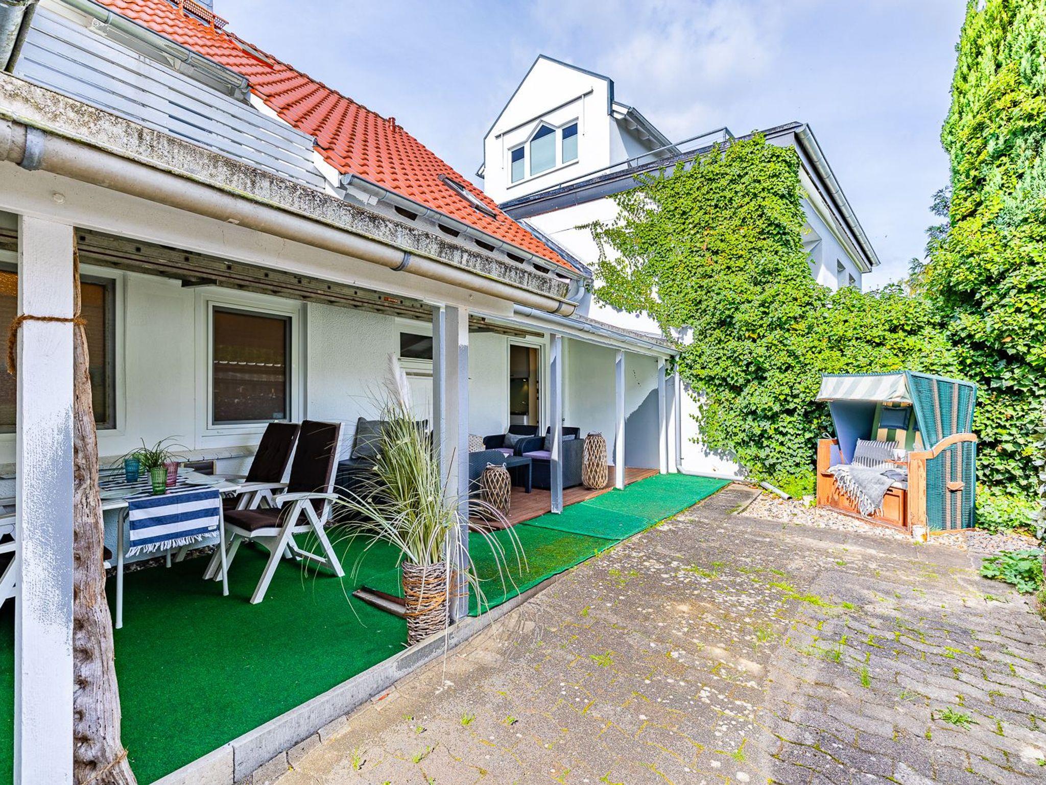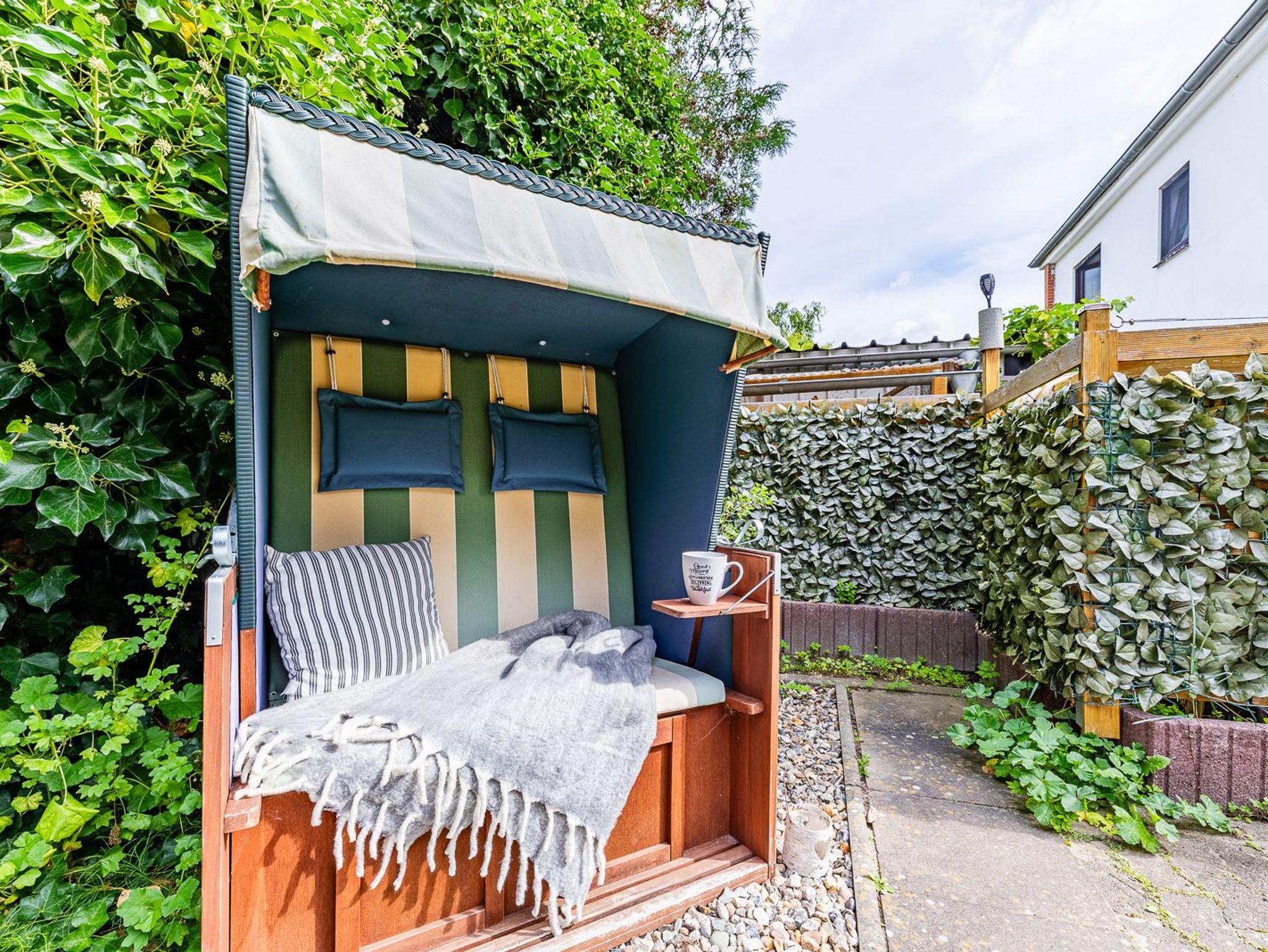 Zu guter Letzt bietet das Reihenhaus „LEE“ ein kleines Gartenstück mit Terrasse, das von der Küche aus zu erreichen ist. Dort befinden sich ein hochwertiger Garten-Strandkorb und 2 weiteren Sitzgelegenheiten, in denen die Urlaubstage entspannt ausklingen können.