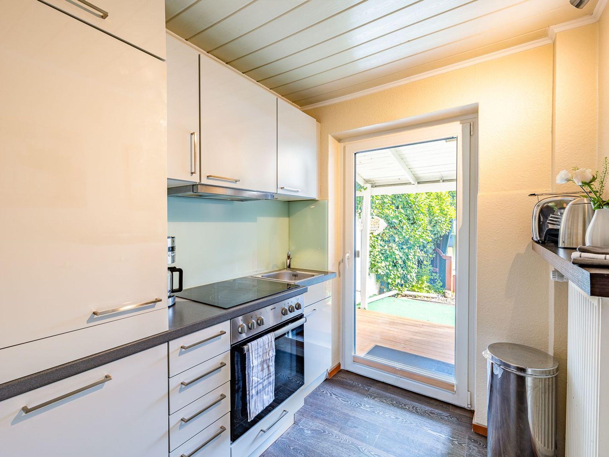 Unsere zum Garten gerichtete Küche wird alles für ein angenehmes Frühstück oder Abendessen bieten können. Backofen, vier Cerankochfelder, Kühlschrank mit Gefrierfach, Geschirrspülmaschine, Kaffemaschine, Toaster, Wasserkocher und natürlich ausreichend Besteck und Geschirr stehen zur Verfügung.
