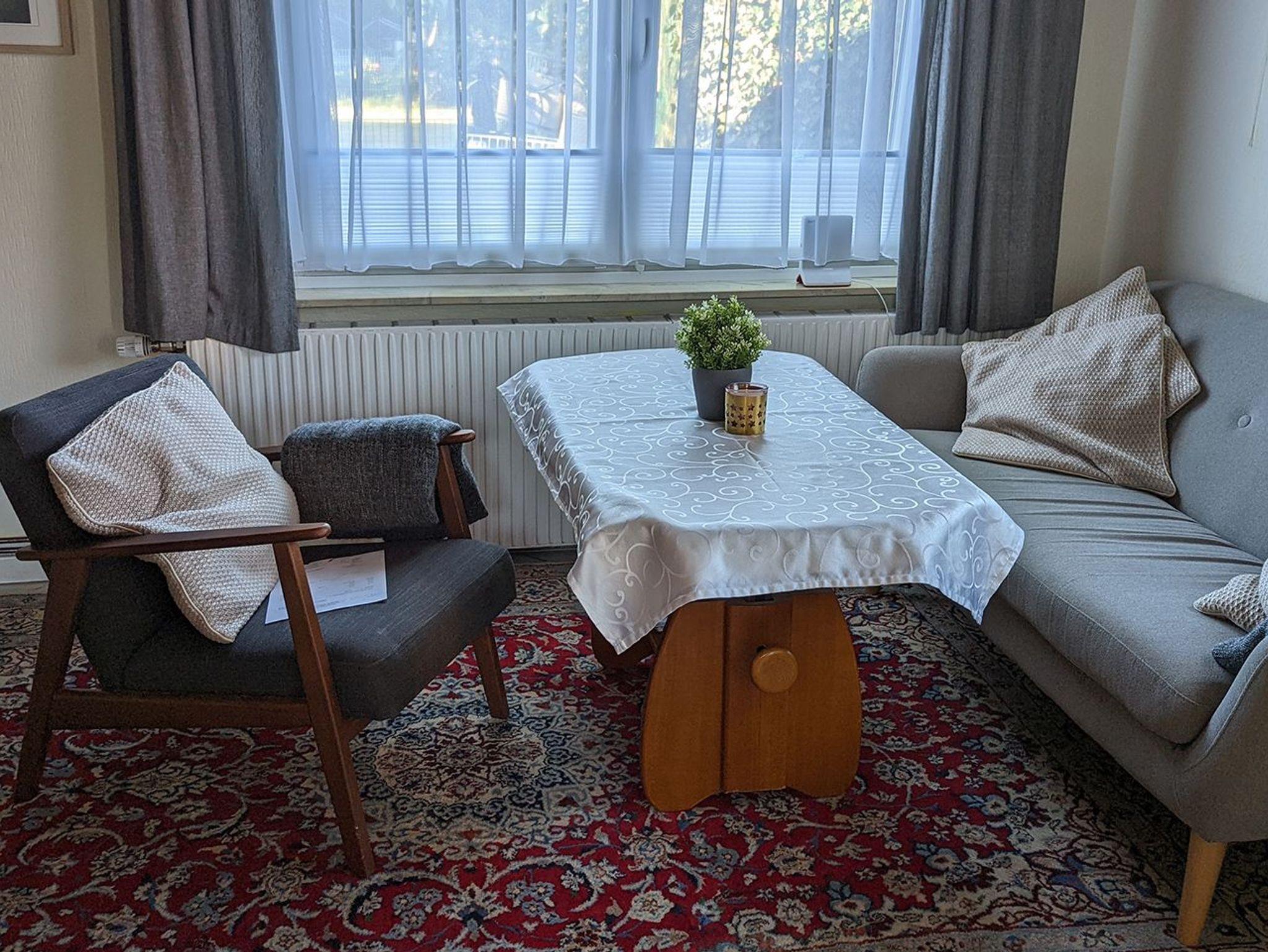 Im gefliesten Wohnzimmer sind eine Sitzgruppe mit Couch, Sessel, ausziehbarem Couchtisch und eine Schrankwand mit Schrankklappbett. Handtücher, Küchentücher und Bettwäsche werden gestellt und wöchentlich gewechselt.