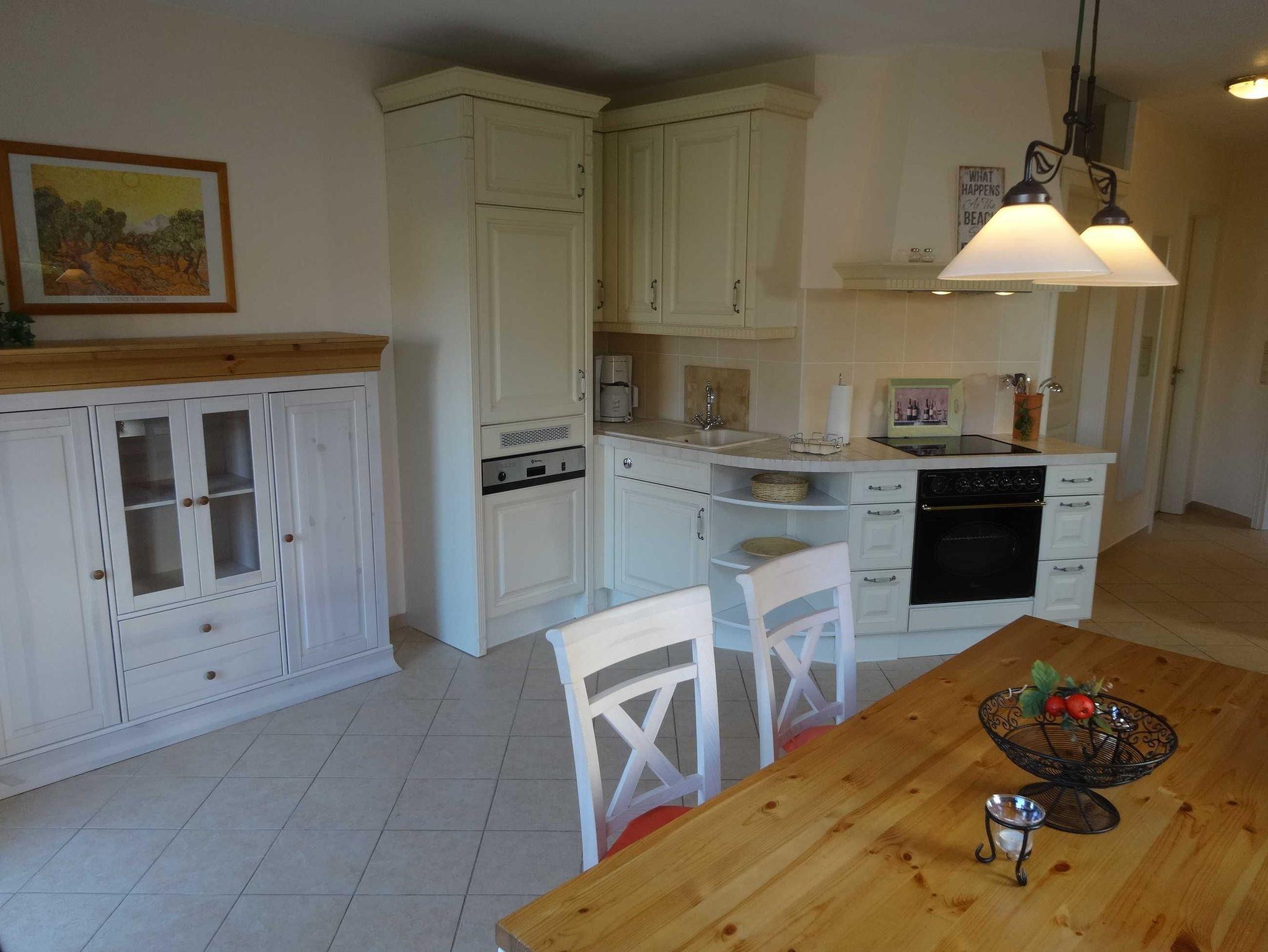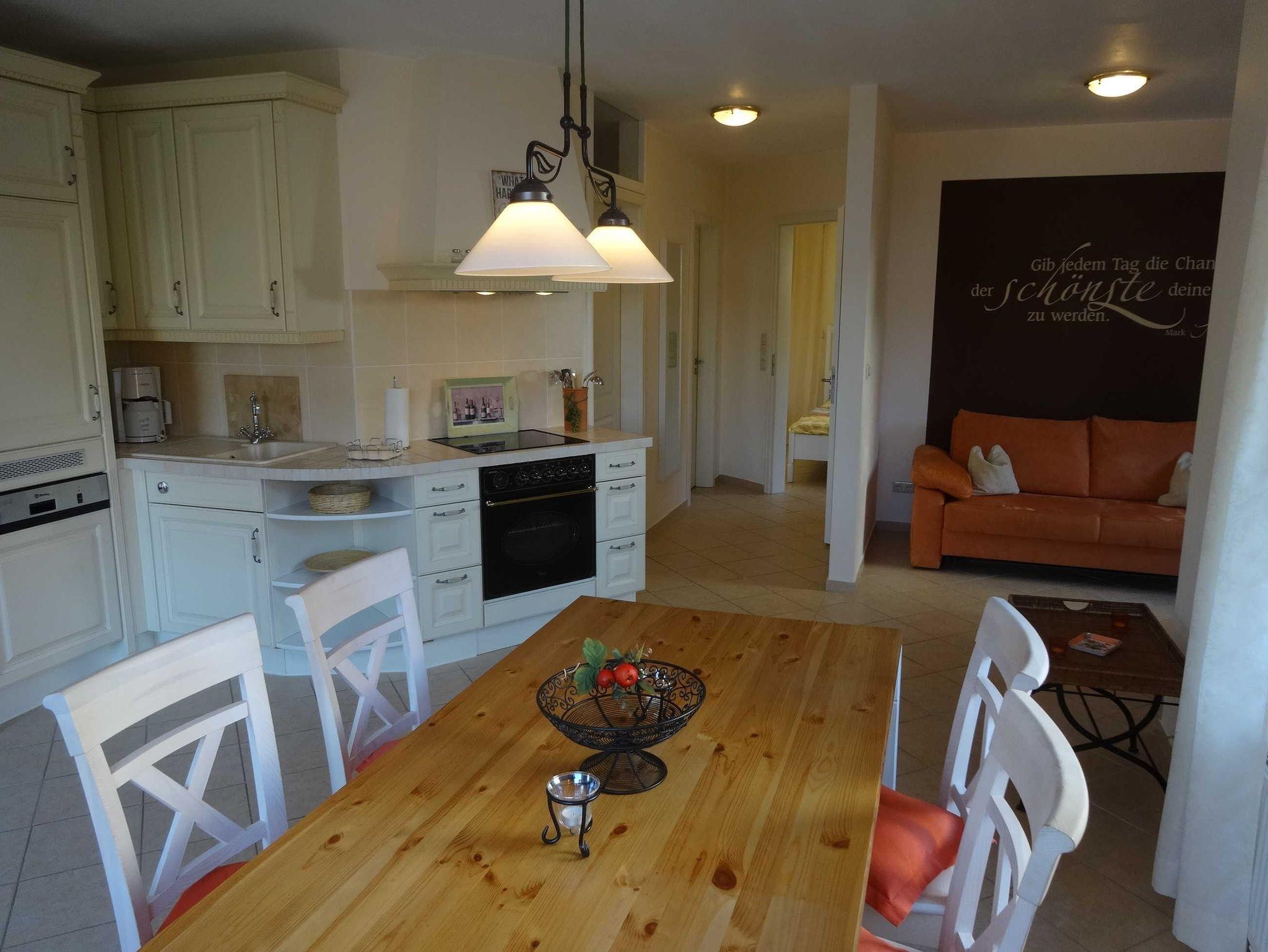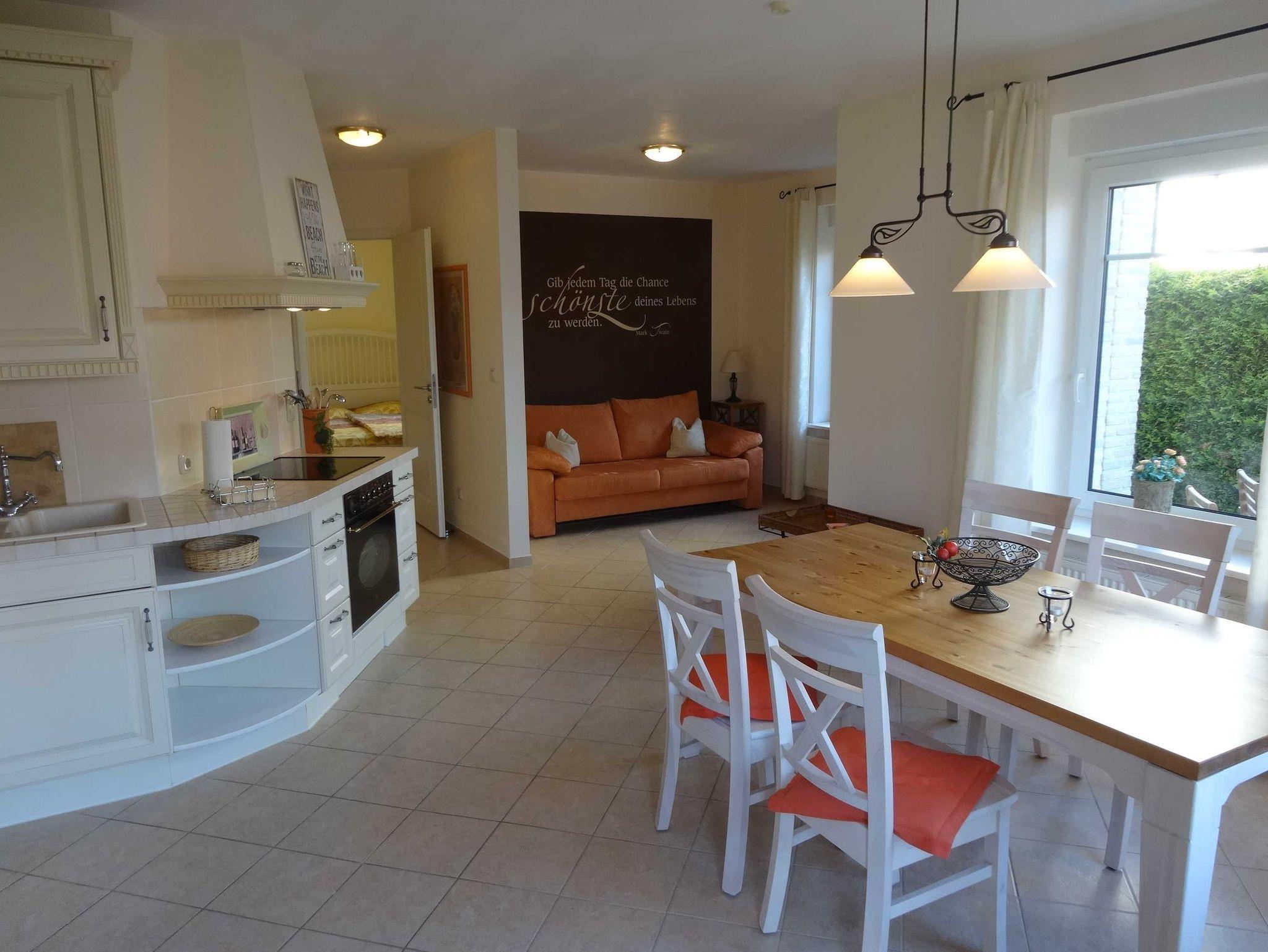 Die Ferienwohnung hat ein separates Schlafzimmer. Die sehr gut ausgestattete Einbauküche kombiniert mit dem Wohnbereich, der sehr geschmackvoll und gemütlich eingerichtet ist. Hier befindet sich auch das sehr komfortable Schlafsofa. Das elegante Bad rundet die Ferienunterkunft ab.