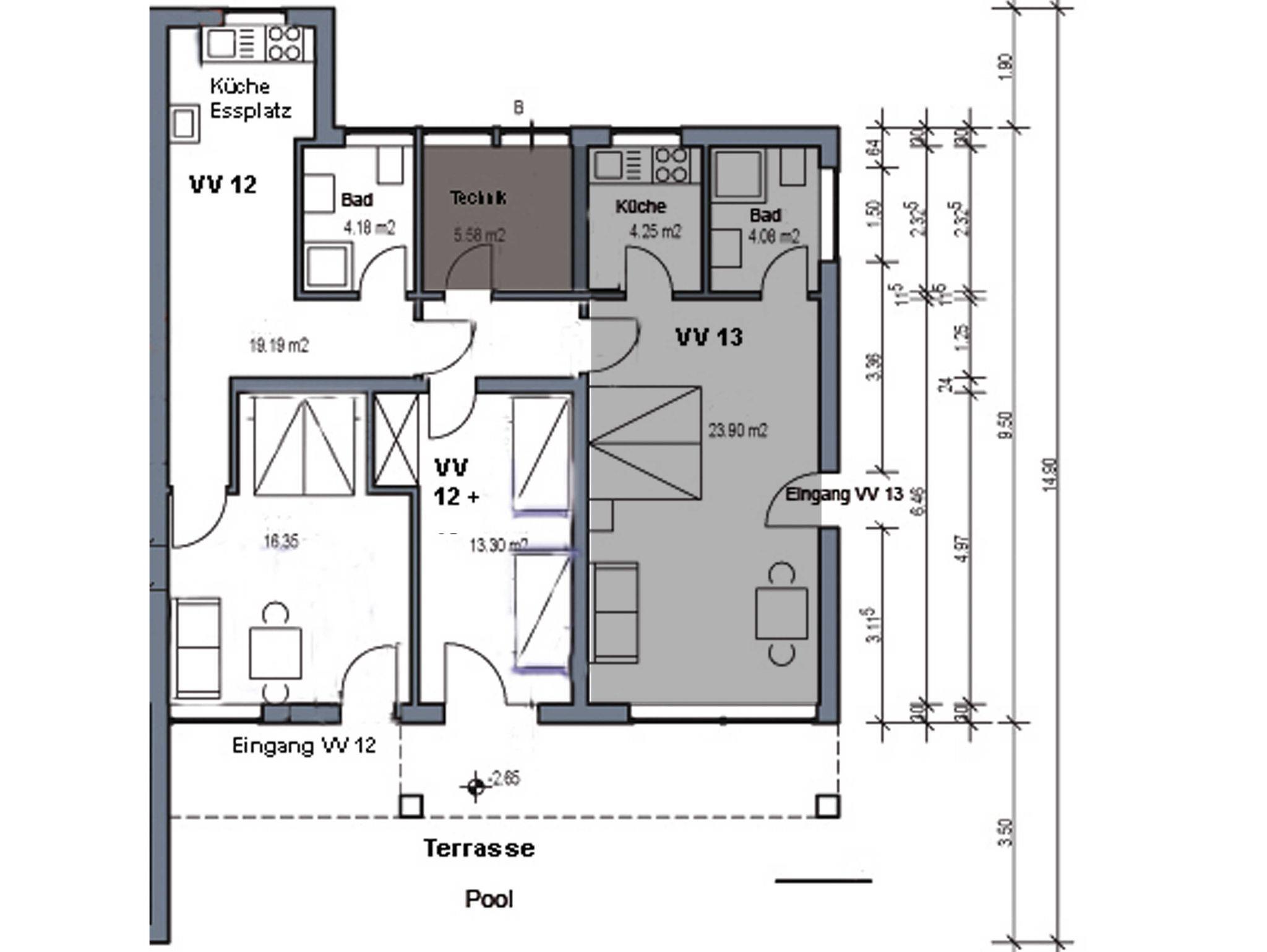 VV 12: EG, ca. 54 m², 1 komb. Wohn-/Schlafzimmer mit 2 Box-Spring-Betten, 1 Flur, Kinderzimmer mit 2 Einzelbetten, TV und separatem Eingang, 1 Duschbad, große separate Küche mit Essecke, große Terrasse direkt am Pool.