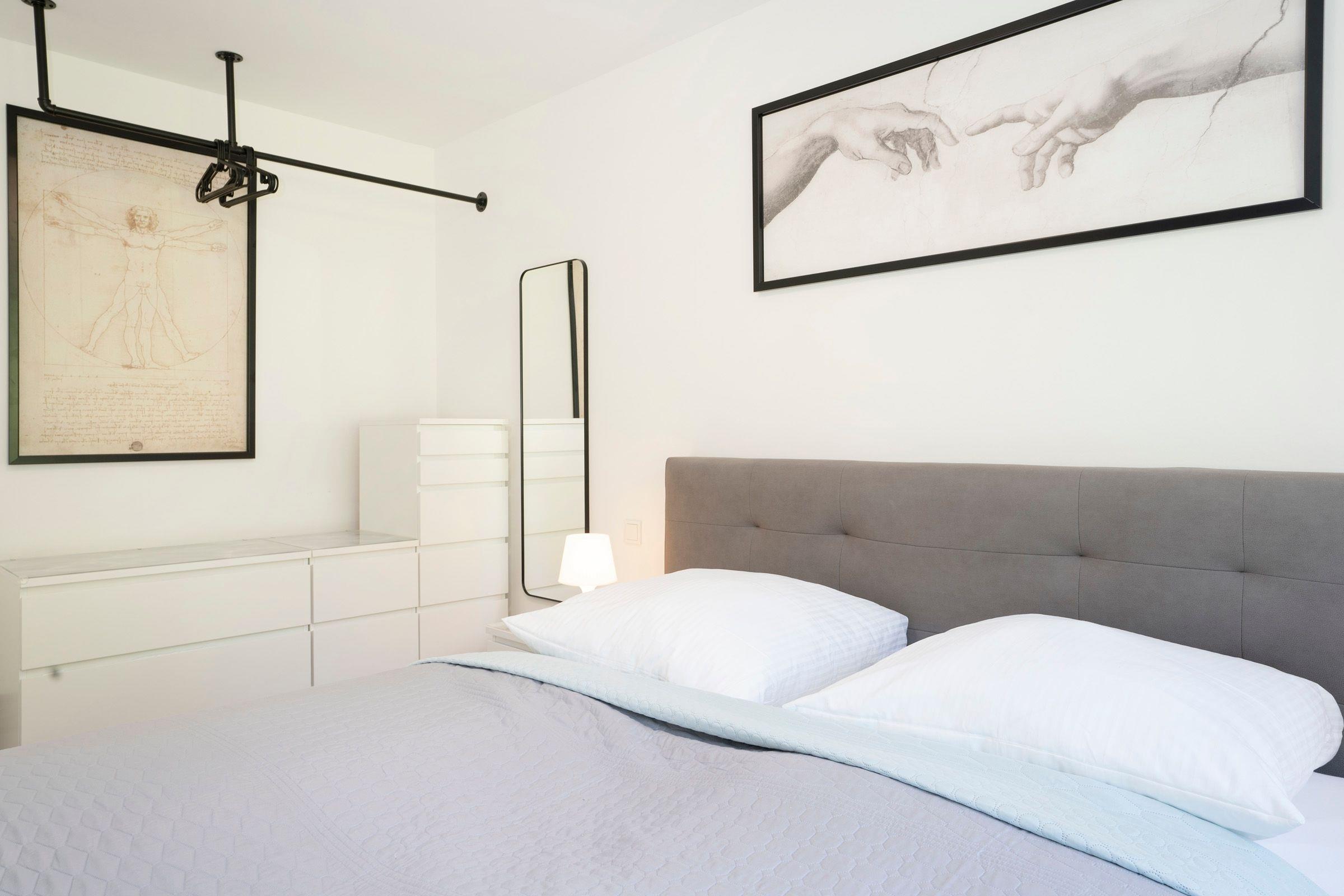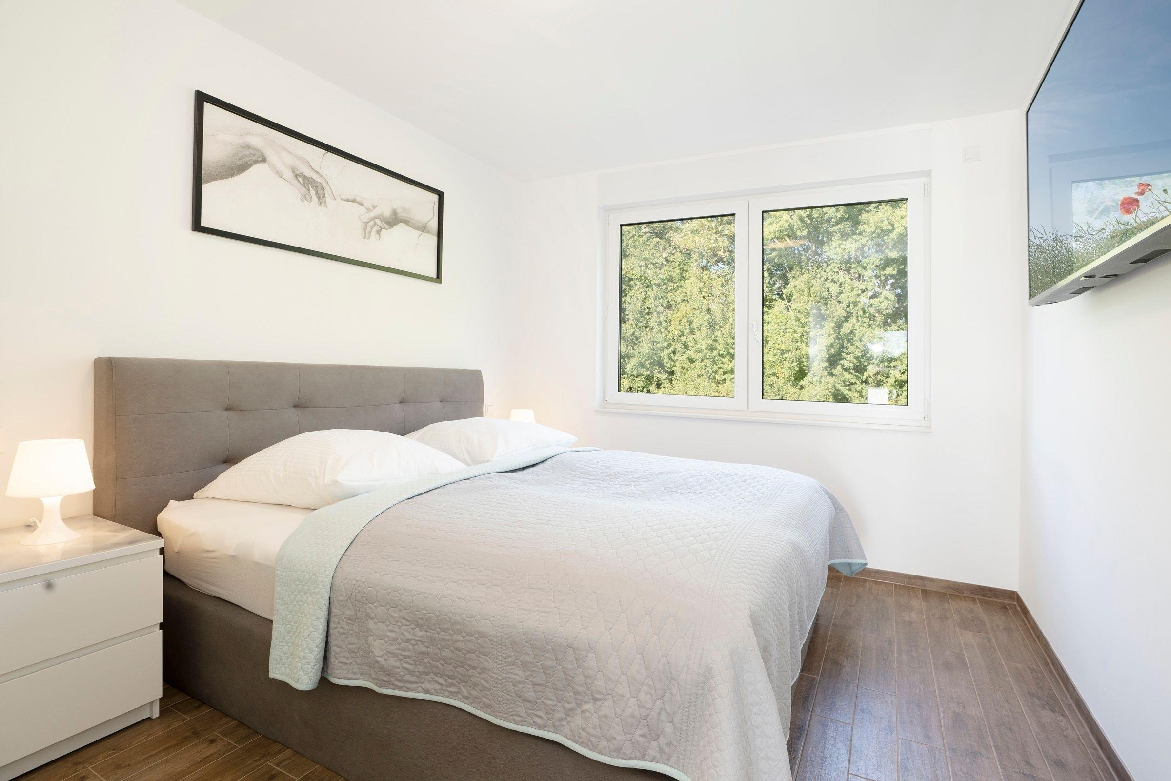 Schlafzimmer: 1 Boxspring-Doppelbett (180x200 cm), TV, Kleiderschrank, Verdunkelung: elektrische Rollläden, Platz für Babybett