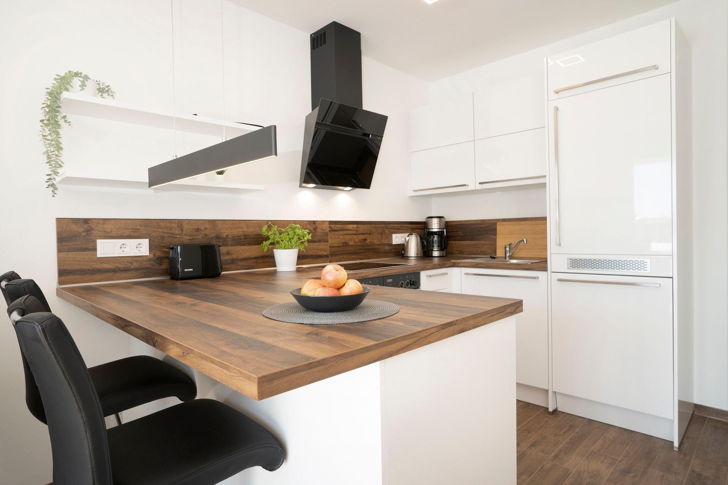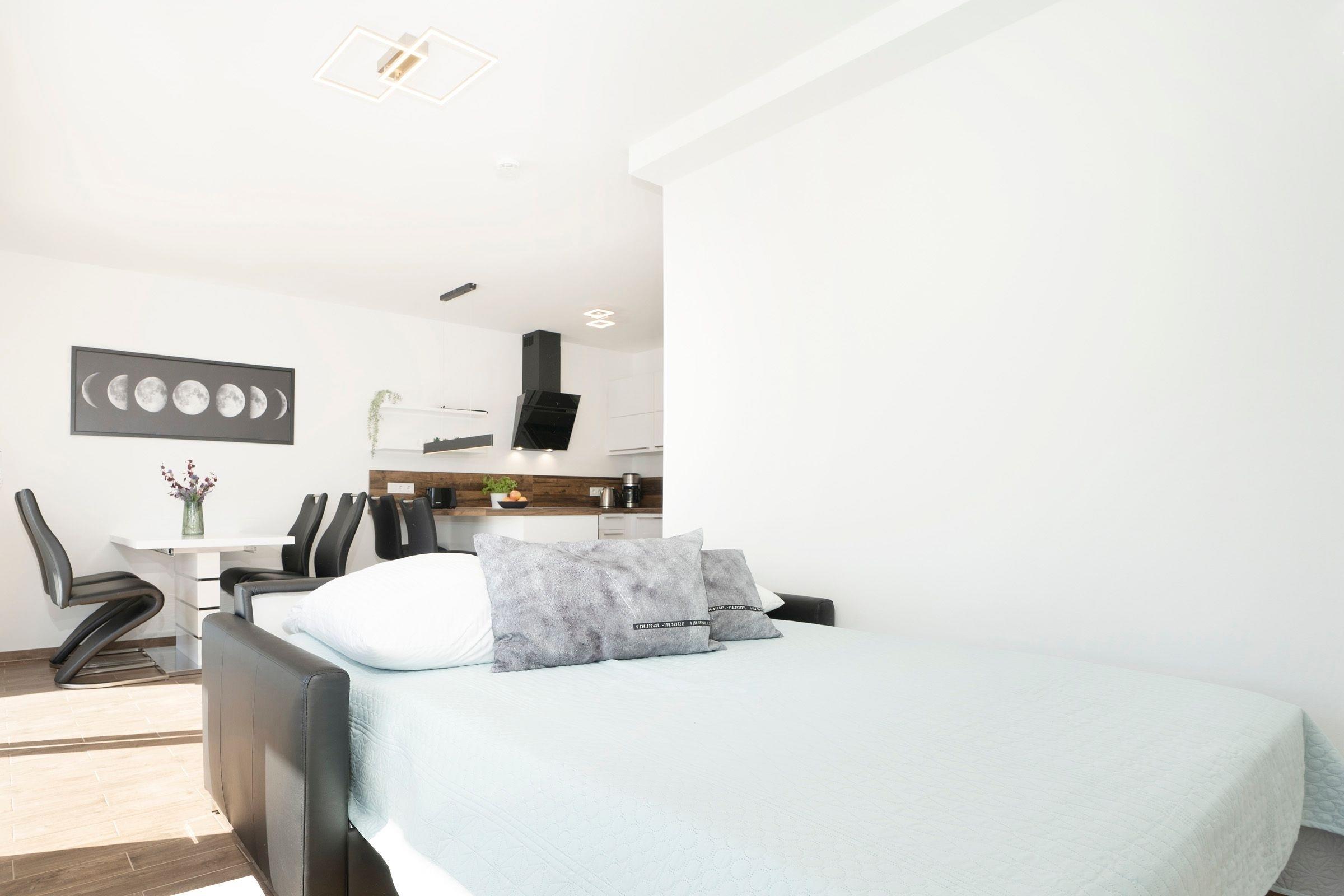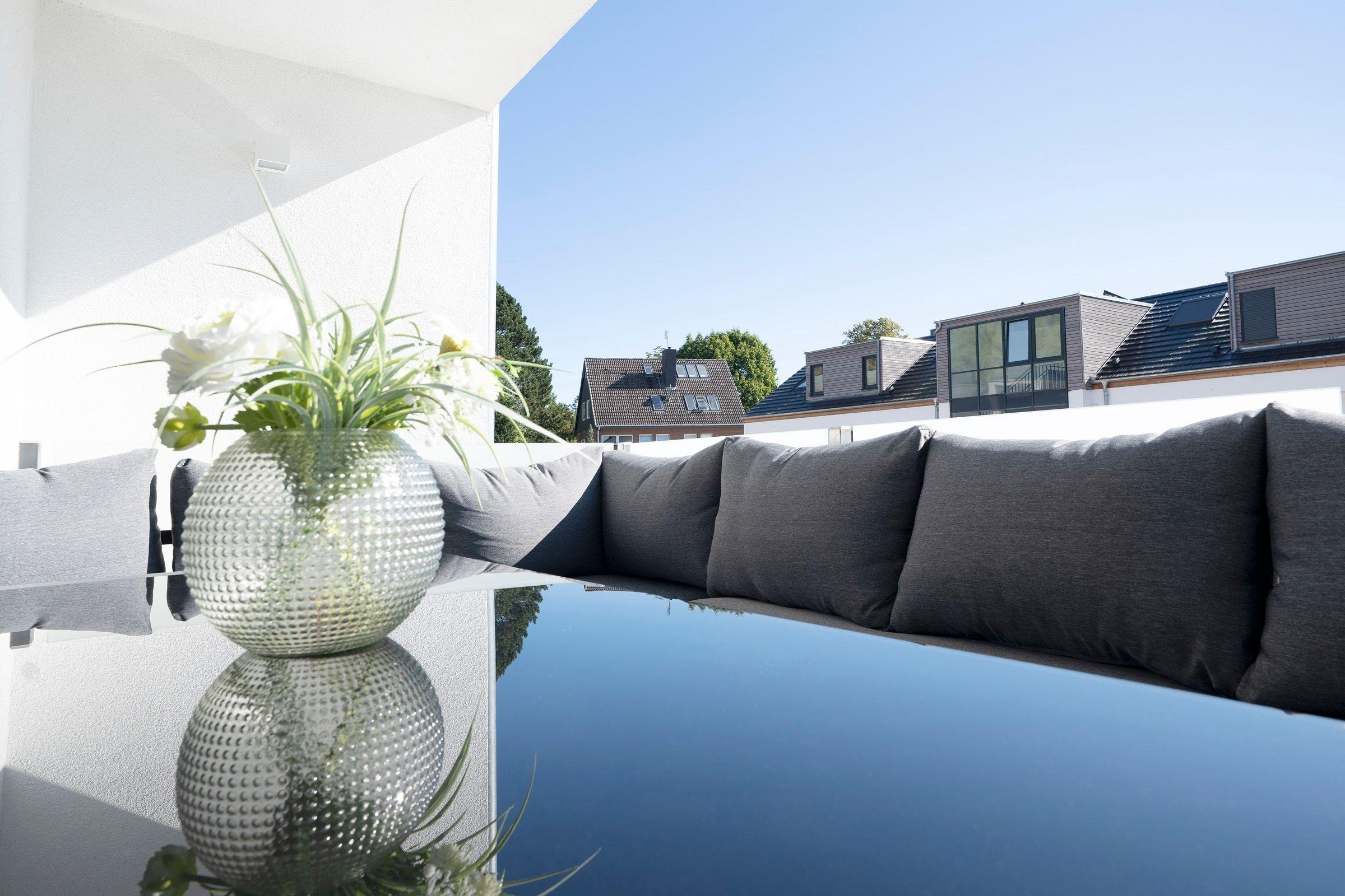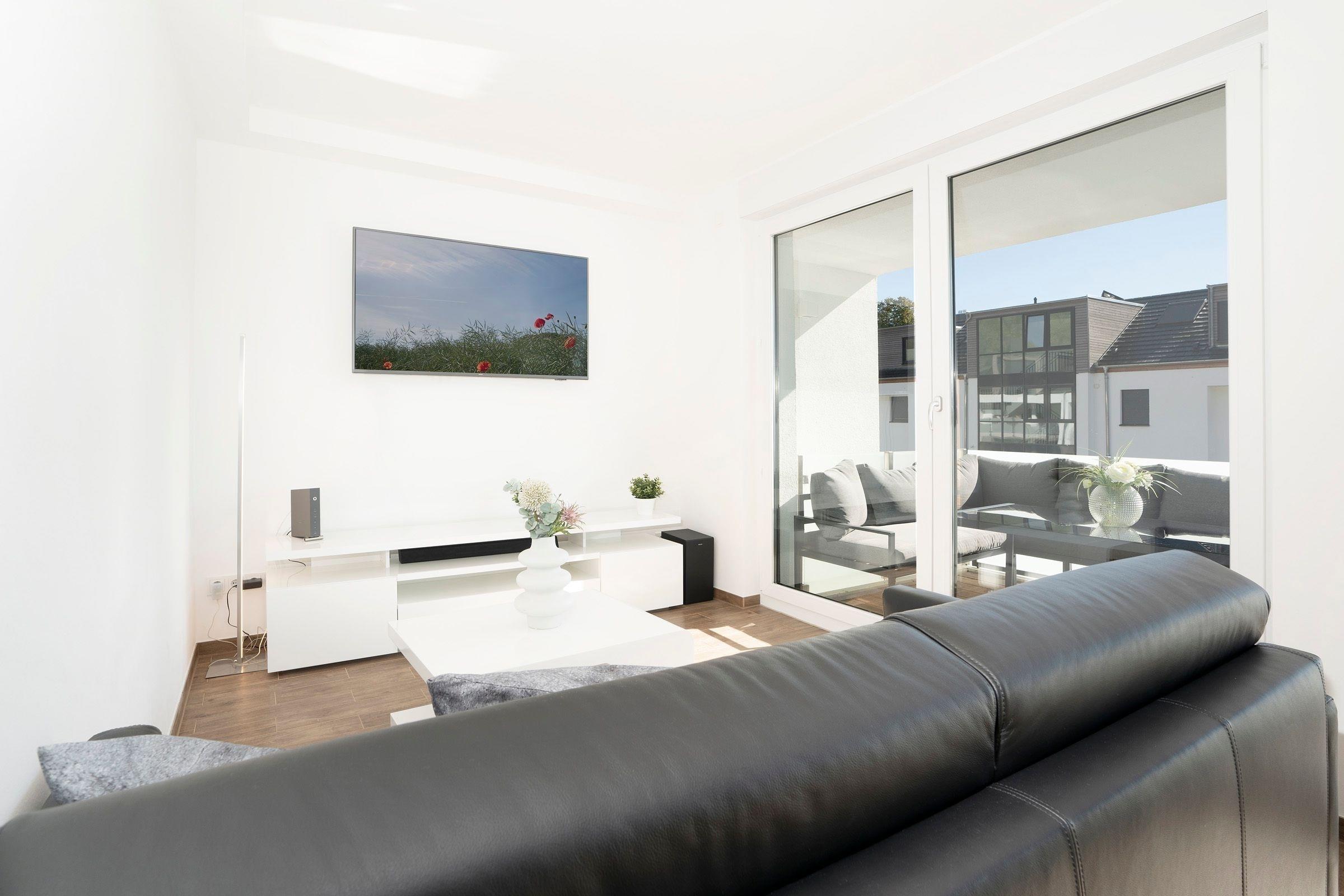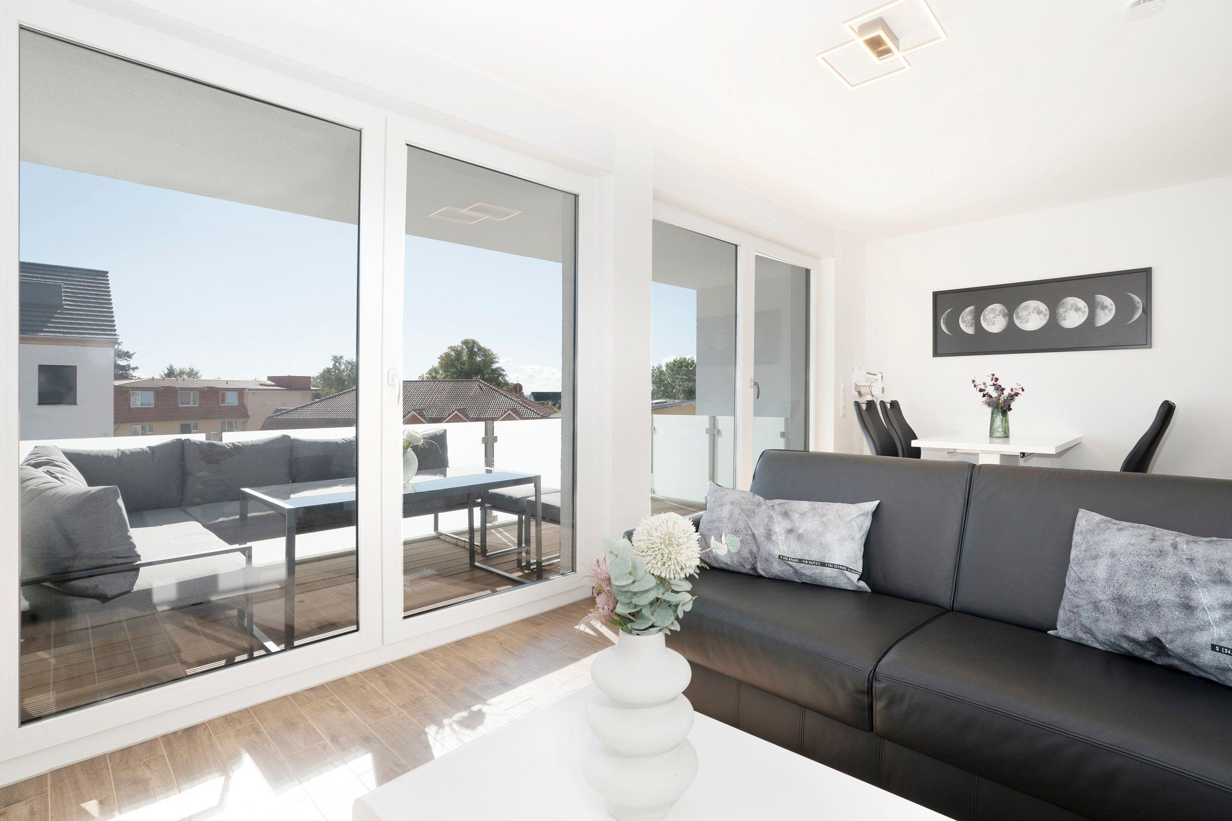 Der stilvoll eingerichtete Wohnbereich mit bequemen Sofa (Schlafmöglichkeit für 2 Personen, 140x200 cm) und Flachbildfernseher grenzt offen an den Essbereich mit ausreichend Platz für alle Gäste. Von hier aus gelangen Sie auf den möblierten Balkon mit Süd-Ost-Ausrichtung. In der vollausgestatteten Küche können Sie köstliche Urlaubsmahlzeiten zubereiten. Das separate Schlafzimmer ist mit einem Boxspring-Doppelbett (180x200 cm), TV und einem Kleiderschrank ausgestattet. Für Verdunkelung sorgen elektrische Außenrollläden. Genießen Sie den Komfort einer bodengleichen Dusche im modernen Badezimmer.