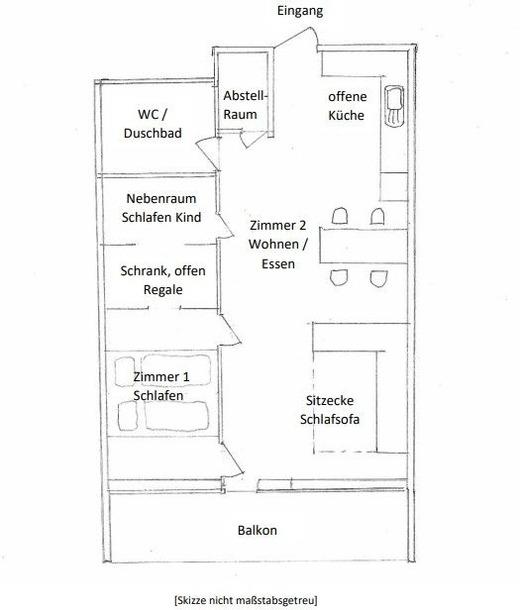 Schlafzimmer 1 (hinterer Bereich): Schlafsofa (140x200 cm), Verdunkelung (alternativ zum Schlafsofa: Platz für Kinderreisebett)