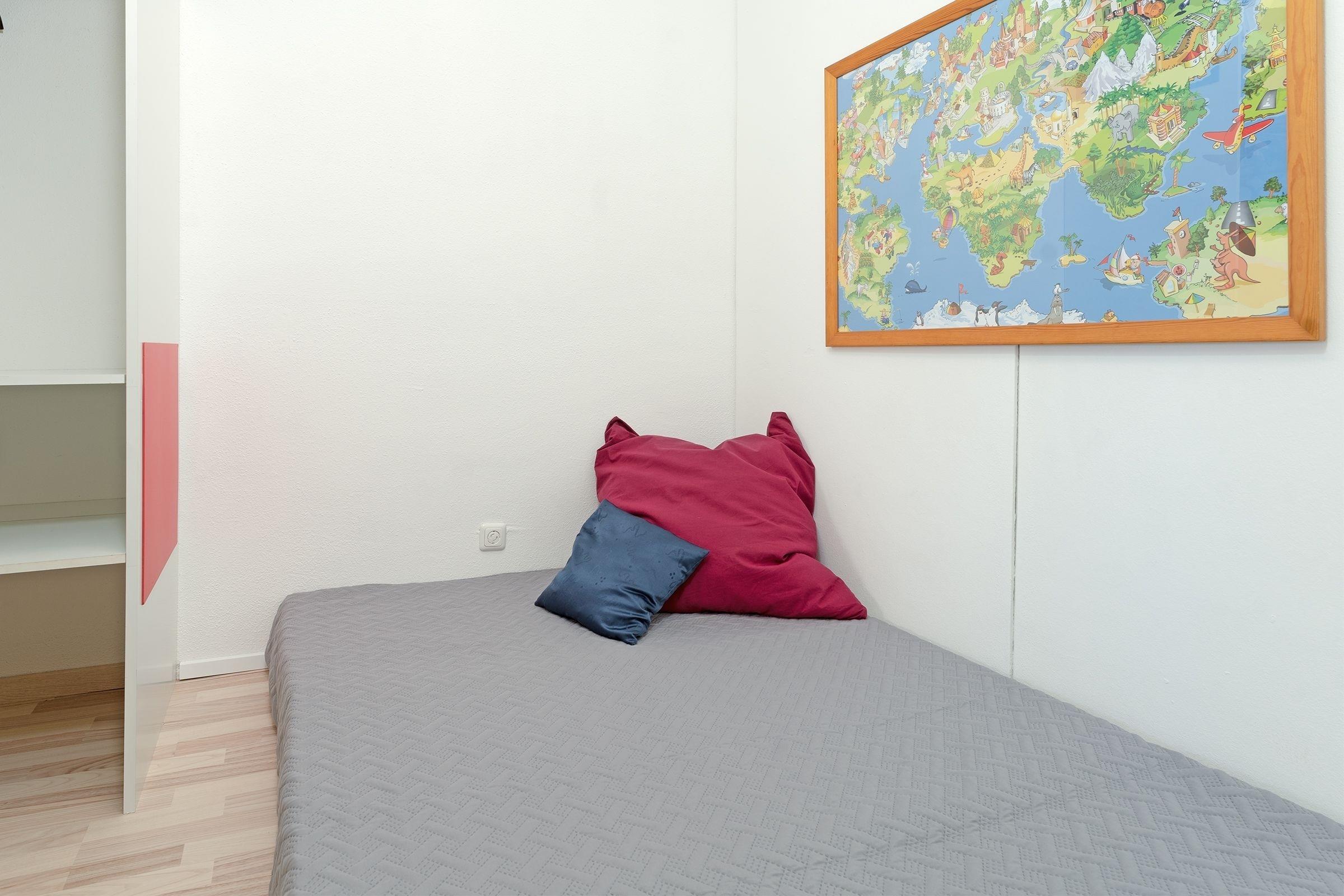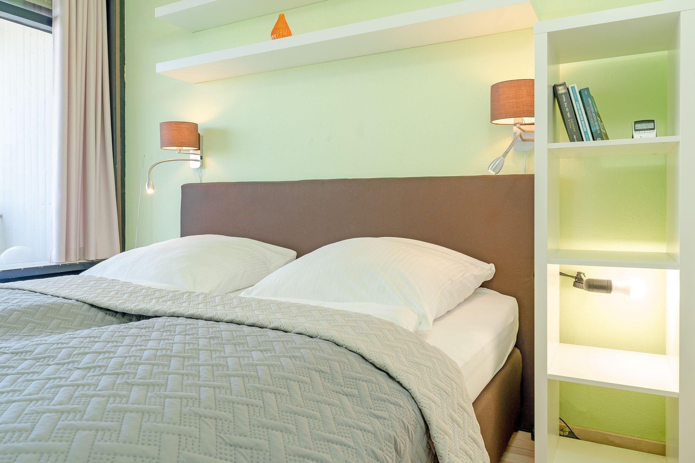 Schlafzimmer 1: 1 Boxspring-Doppelbett (180x200 cm), Kleiderschrank, Verdunkelung (Vorhang+Rollladen), kein Platz für Kinderreisebett vorhanden