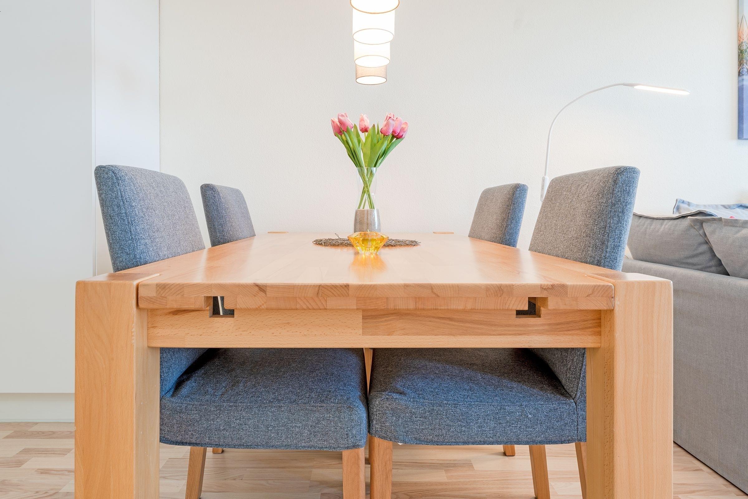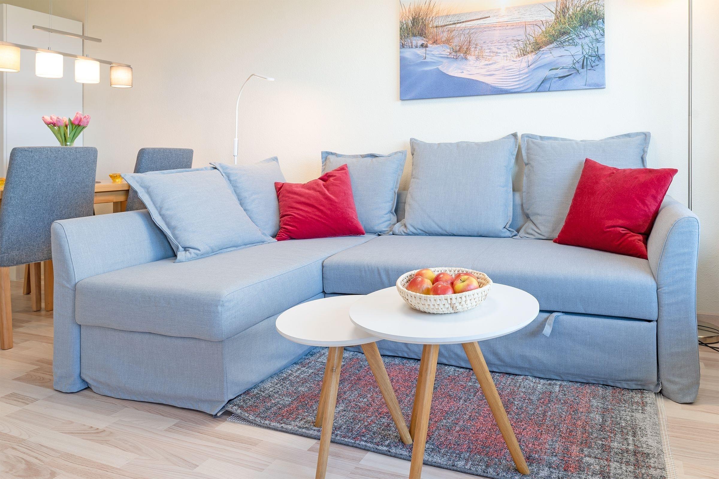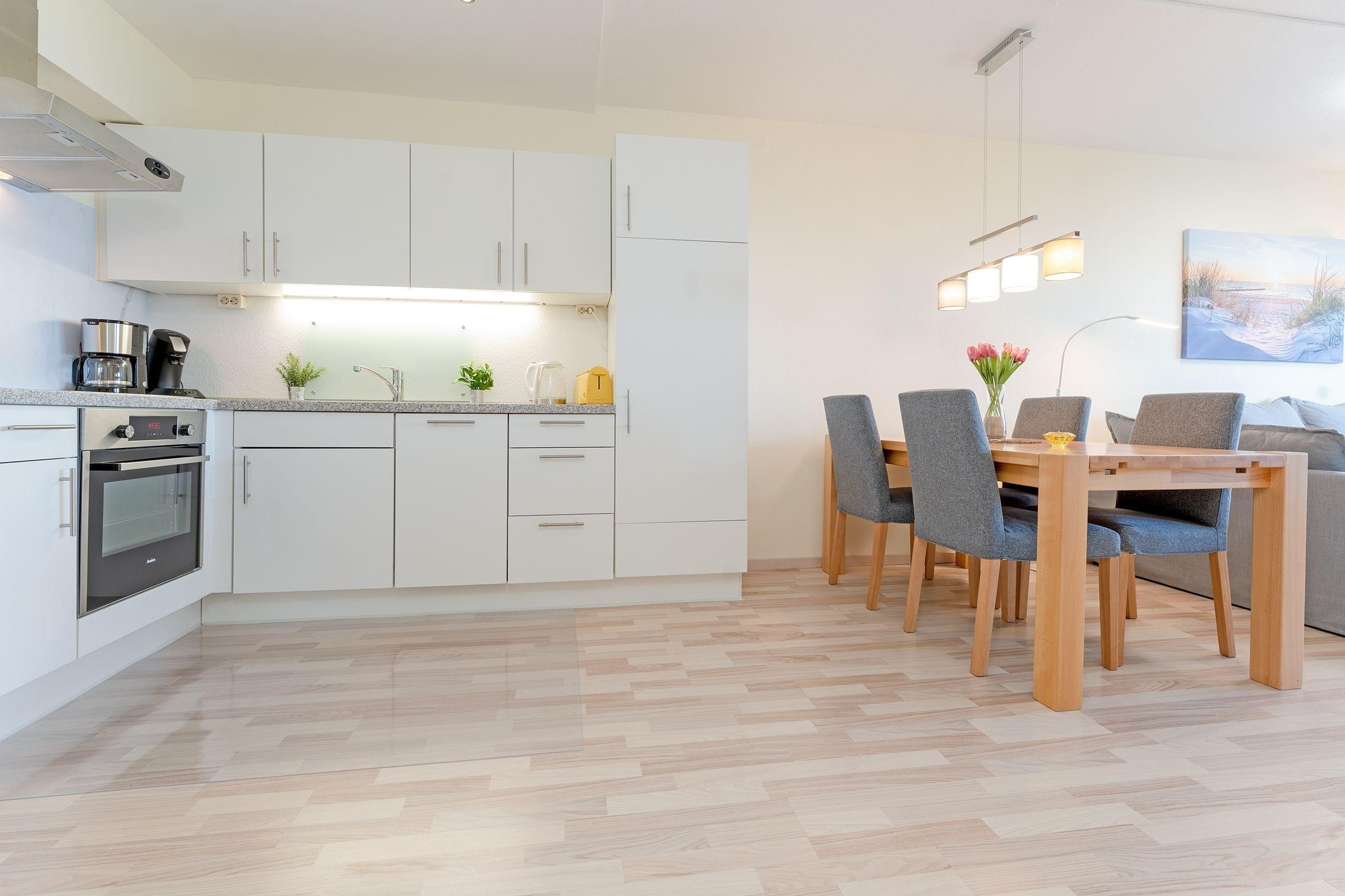Sie möchten von Ihrer Wohnung aus den freien Blick auf die Ostsee genießen? Dann sind Sie hier genau richtig. Das Herzstück dieser Wohnung bildet das Wohnzimmer mit offener Küche und Zugang zum Balkon. Von hier aus können Sie mit einem frischen Kaffee - es ist eine Filter- sowie eine Kaffeepadmaschine vorhanden - in Richtung Osten auf die Ostsee und den Hansapark blicken. Neben einem Smart TV mit kostenlos nutzbarem Disney+-Streaming-Zugang und einen Radio mit Bluetooth-Eingang umfasst das Wohnzimmer außerdem eine Schlafcouch (140x200 cm). Die weiteren Gäste schlafen nebenan (auch hier gibt es Meerblick) im Boxspring-Doppelbett (180x200 cm). Das Schlafzimmer ist durch einen offenen Kleiderschrank mit dem dritten Schlafplatz, einem Schlafsofa (140x200 cm) verbunden und verspricht Nachtruhe. Das nebenan liegende Badezimmer lässt mit Dusche, beheizbarem Handtuchhalter und Föhn keine Wünsche offen.