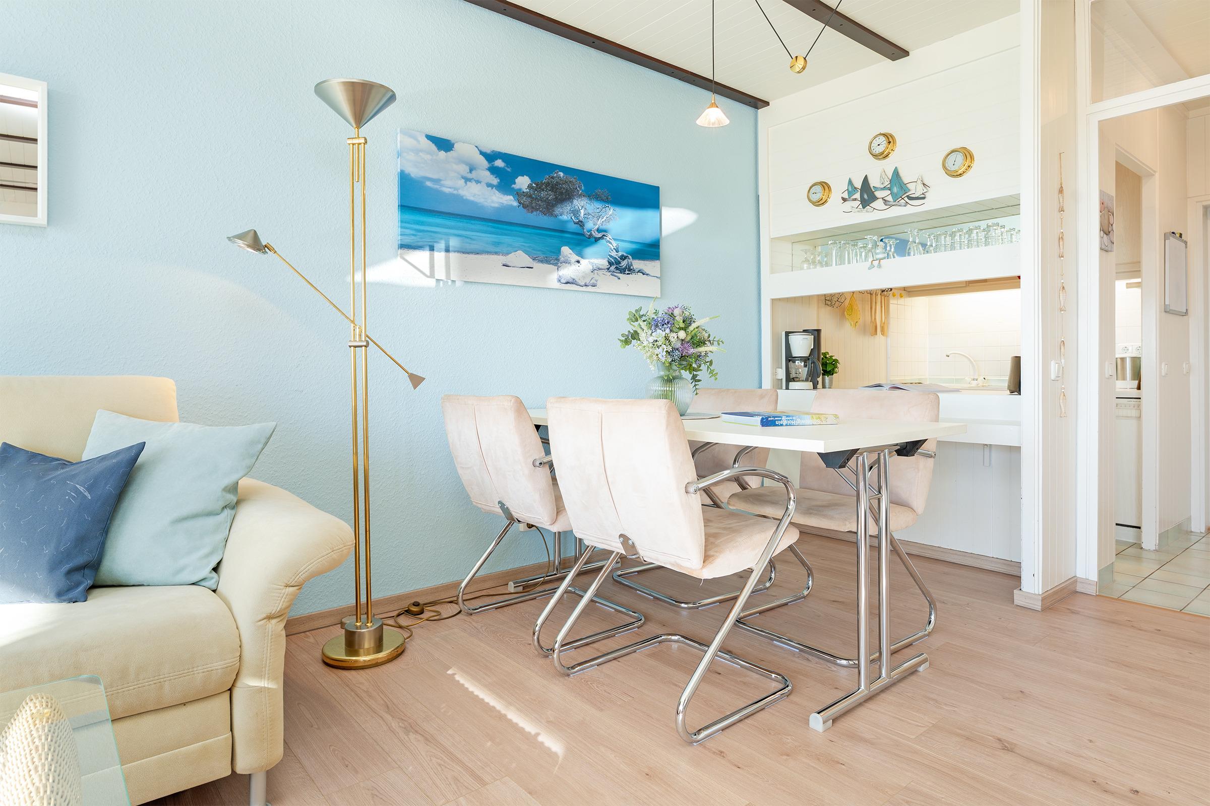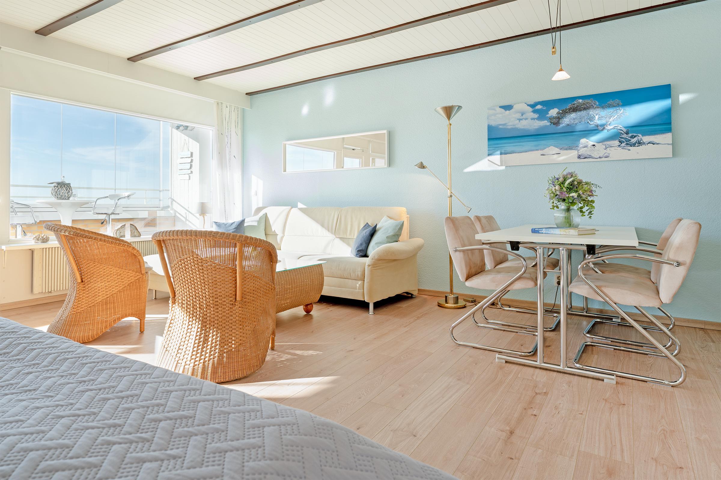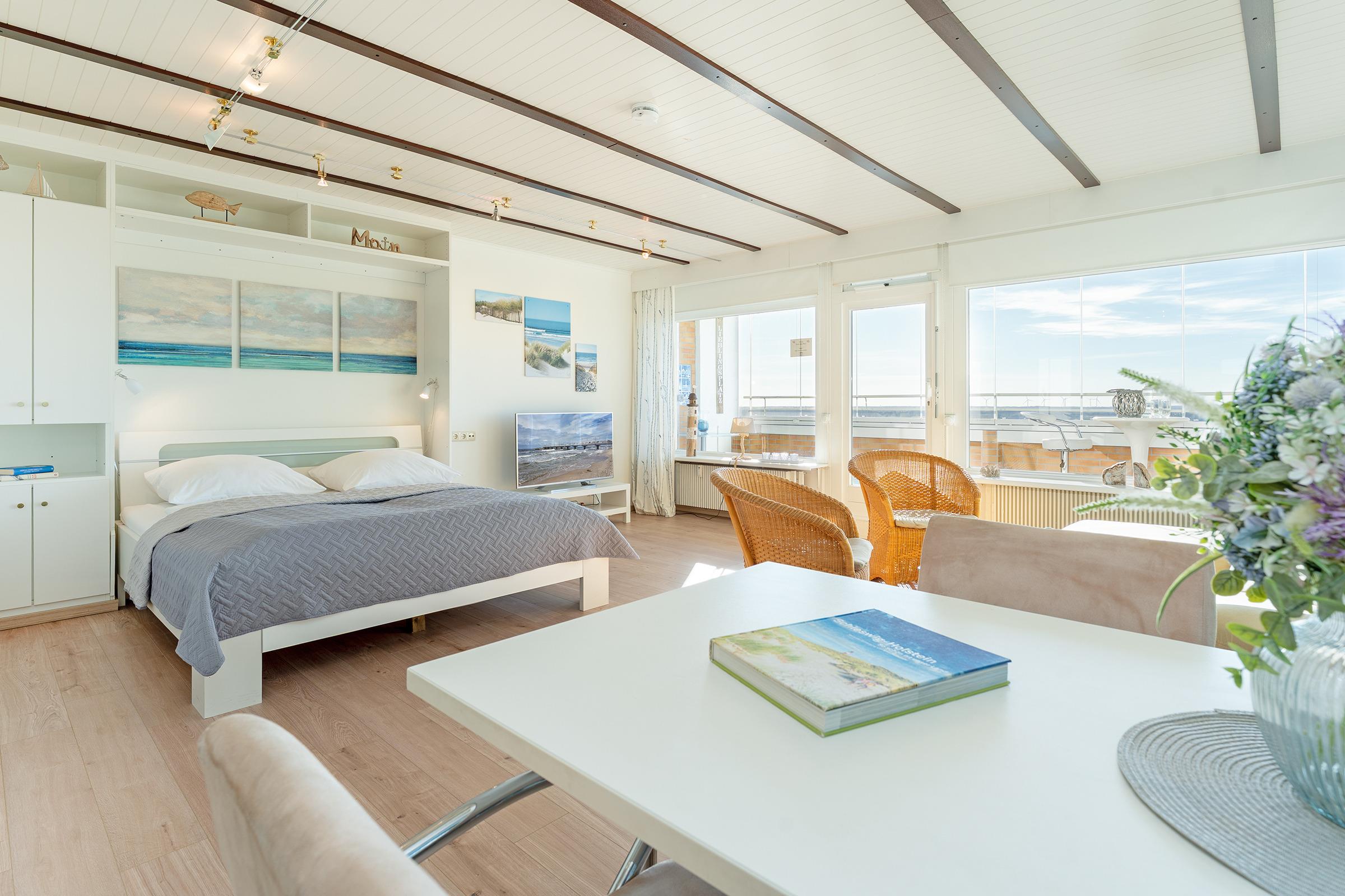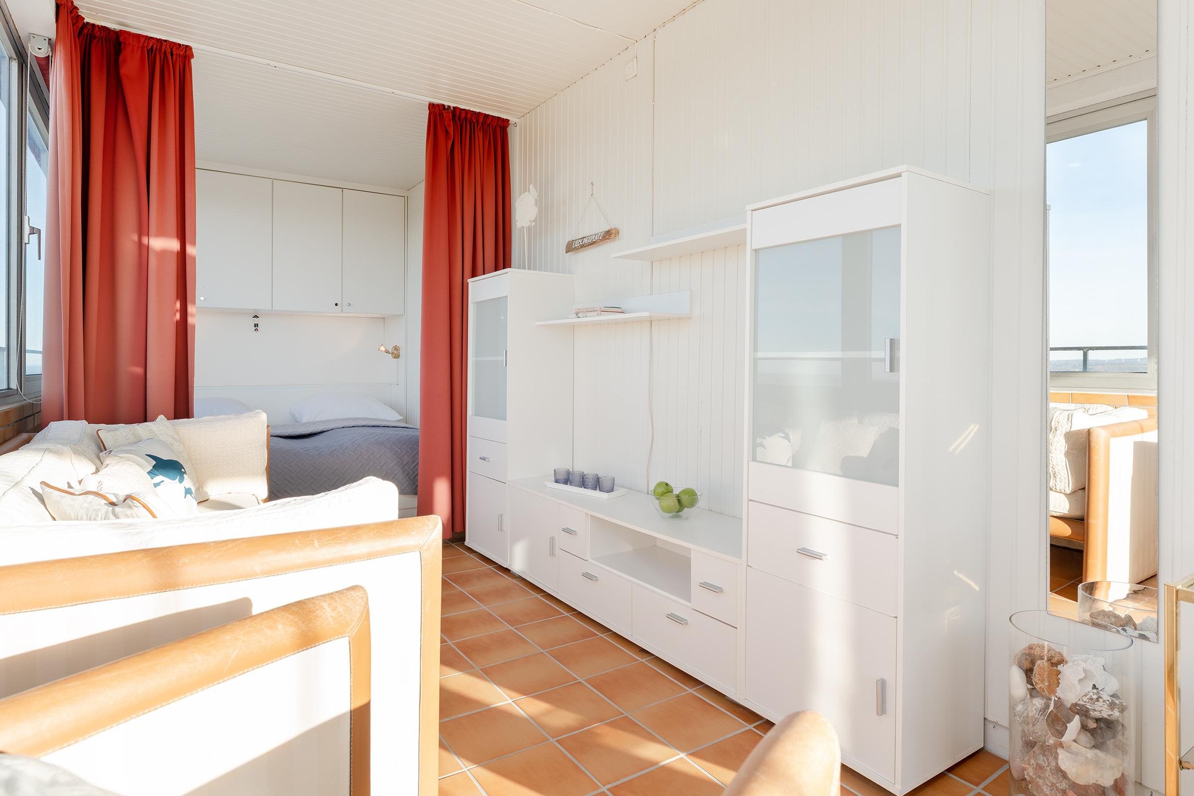 Der Wohn/Schlafbereich ist offen gestaltet und lädt mit einem gemütlichen Doppelbett (2x 90x200 cm) und einem Schlafsofa zum Entspannen ein. Die große Fensterfront sorgt für viel Tageslicht und eine freundliche Atmosphäre. Viel Platz bietet der große Balkon, der durch seine Verglasung auch in der kühleren Jahreszeit ausreichend Schutz bietet. Von hier aus gelangen Sie auch in das kleine Sommer-Schlafzimmer (unbeheizt), das mit einem weiteren Doppelbett (2x 90x200 cm) ausgestattet ist. Das Sommer-Schlafzimmer ist ab April nutzbar.