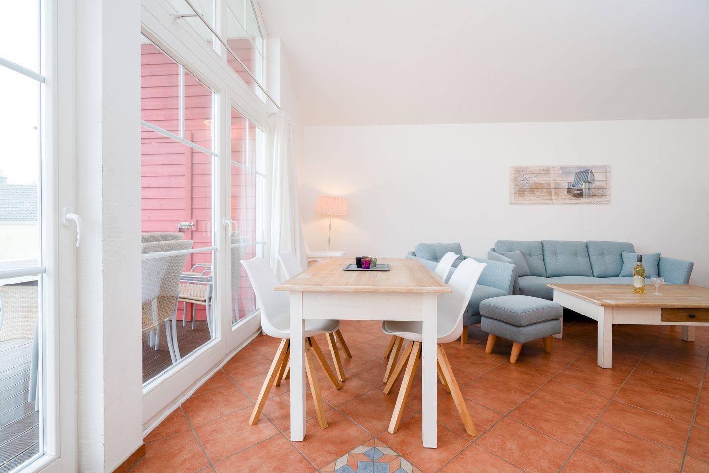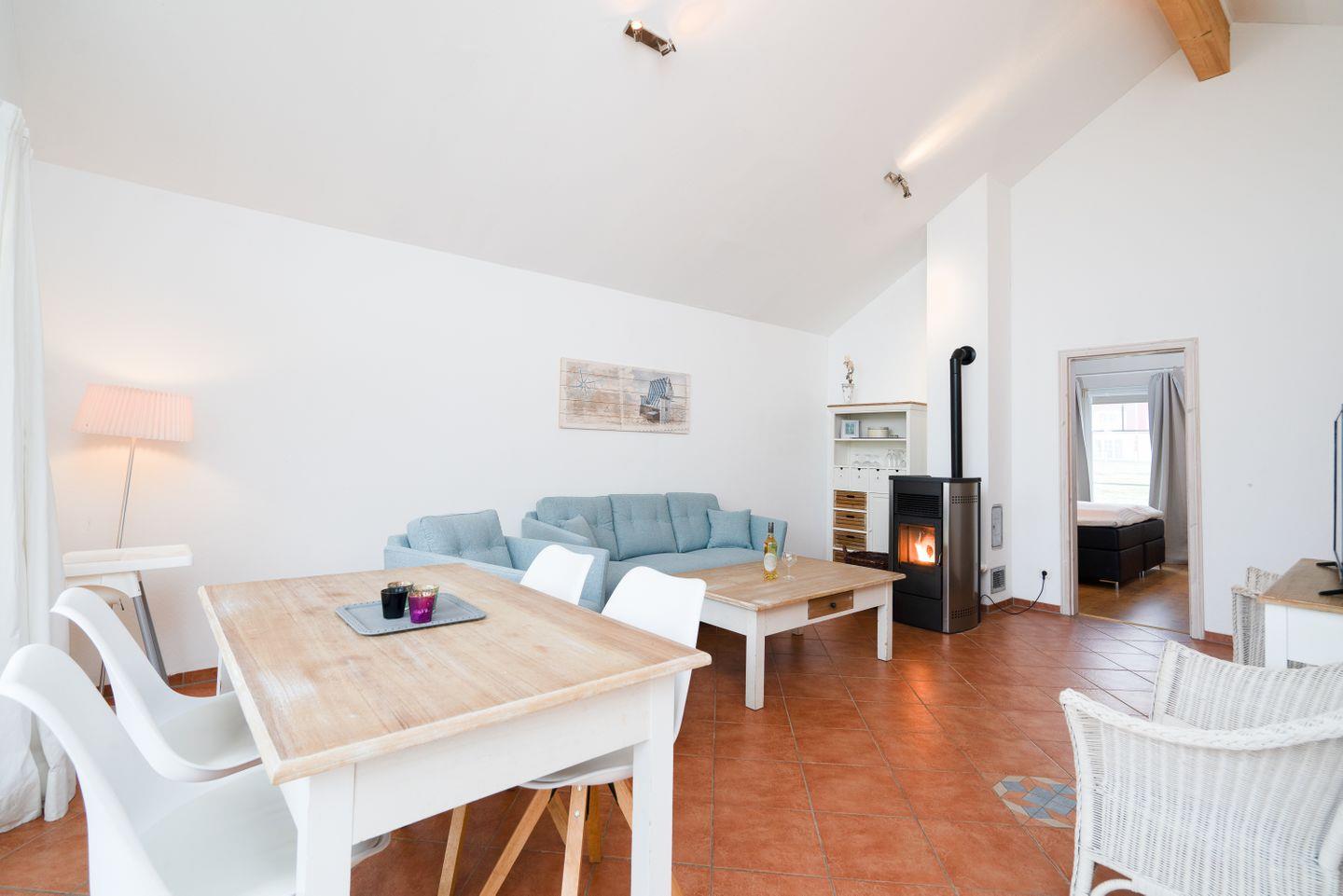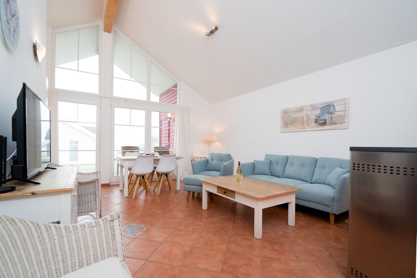 Auf 70 qm auf einer Ebene stehen Ihnen zwei Schlafräume, ein geräumiger Wohn- und Essraum mit Pelletofen und Zugang zur Terrasse zur Verfügung. Von der Terrasse können Sie durch die anderen Häuser hindurch die Ostsee sehen. Der erste Schlafraum hat ein Boxspringbett (180 cm x 200 cm), im zweiten Schlafraum stehen zwei getrennte Betten (je 80 x 200 cm), wovon man eines weiter zum Tandembett ausklappen kann. Die zum Wohn- und Essbereich offene Küche ist mit Geschirrspülmaschine, Herd und Backofen voll ausgestattet. Der Ofen im Wohnbereich sorgt für gemütliche Stunden mit Freunden und Familie. Im Bad finden Sie auch die Sauna, Waschmaschine, sowie eine Badewanne. Der Komfort einer eigenen Sauna wird sehr von unseren Wintergästen geschätzt. Die Beheizung erfolgt über Elektroheizungen und den Pelletofen.