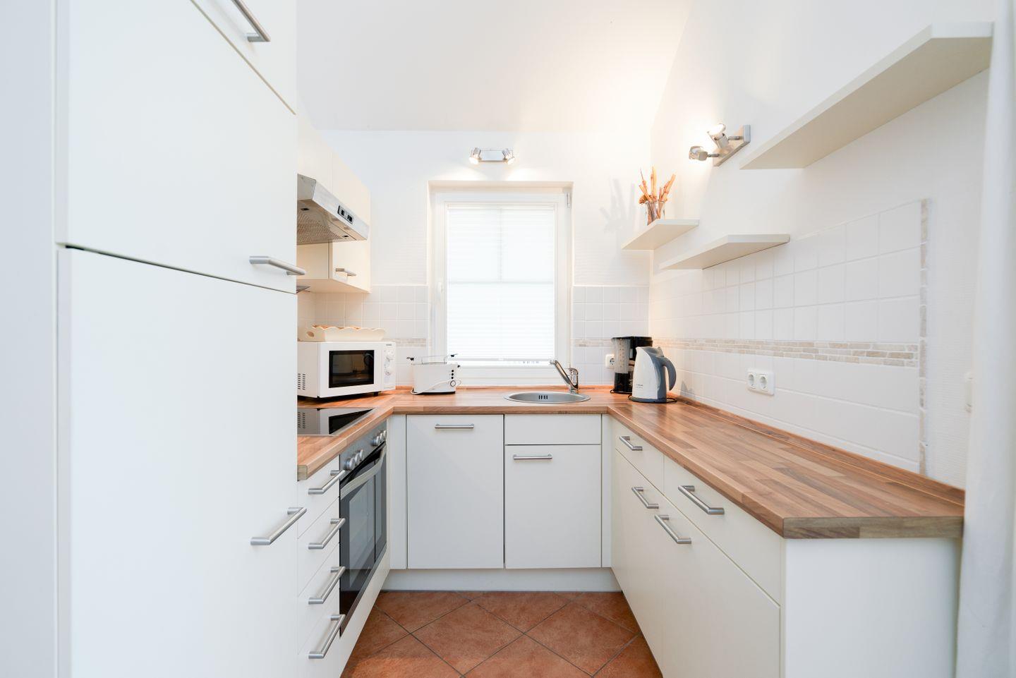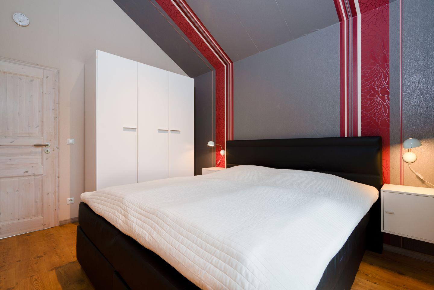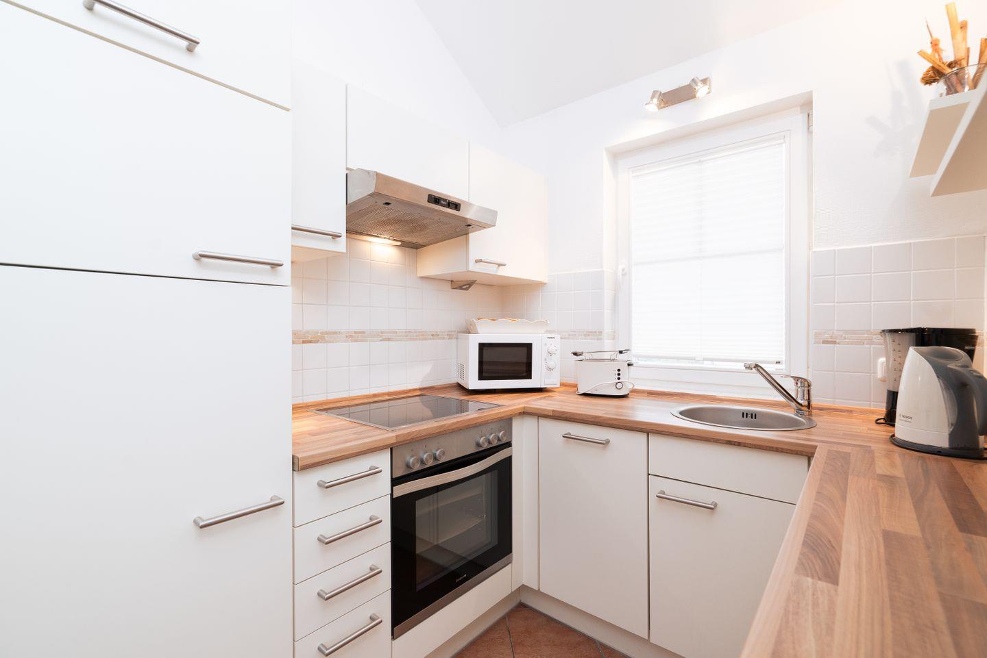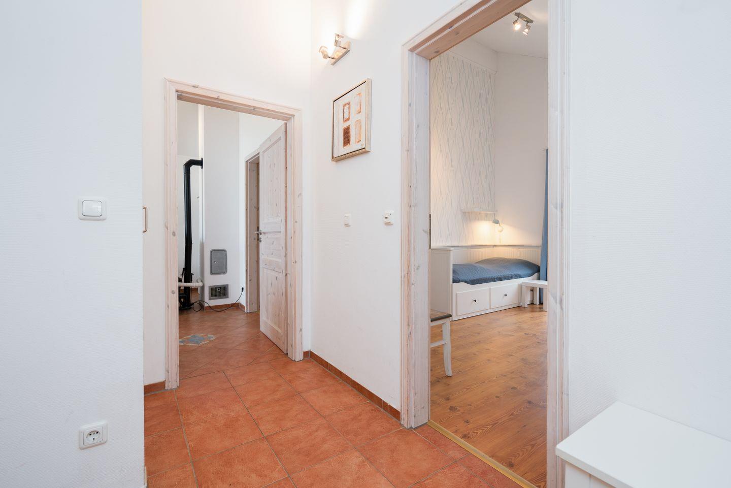 Auf 70 qm auf einer Ebene stehen Ihnen zwei Schlafräume, ein geräumiger Wohn- und Essraum mit Pelletofen und Zugang zur Terrasse zur Verfügung. Von der Terrasse können Sie durch die anderen Häuser hindurch die Ostsee sehen. Der erste Schlafraum hat ein Boxspringbett (180 cm x 200 cm), im zweiten Schlafraum stehen zwei getrennte Betten (je 80 x 200 cm), wovon man eines weiter zum Tandembett ausklappen kann. Die zum Wohn- und Essbereich offene Küche ist mit Geschirrspülmaschine, Herd und Backofen voll ausgestattet. Der Ofen im Wohnbereich sorgt für gemütliche Stunden mit Freunden und Familie. Im Bad finden Sie auch die Sauna, Waschmaschine, sowie eine Badewanne. Der Komfort einer eigenen Sauna wird sehr von unseren Wintergästen geschätzt. Die Beheizung erfolgt über Elektroheizungen und den Pelletofen.