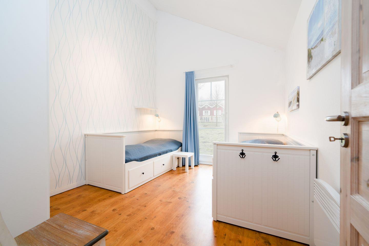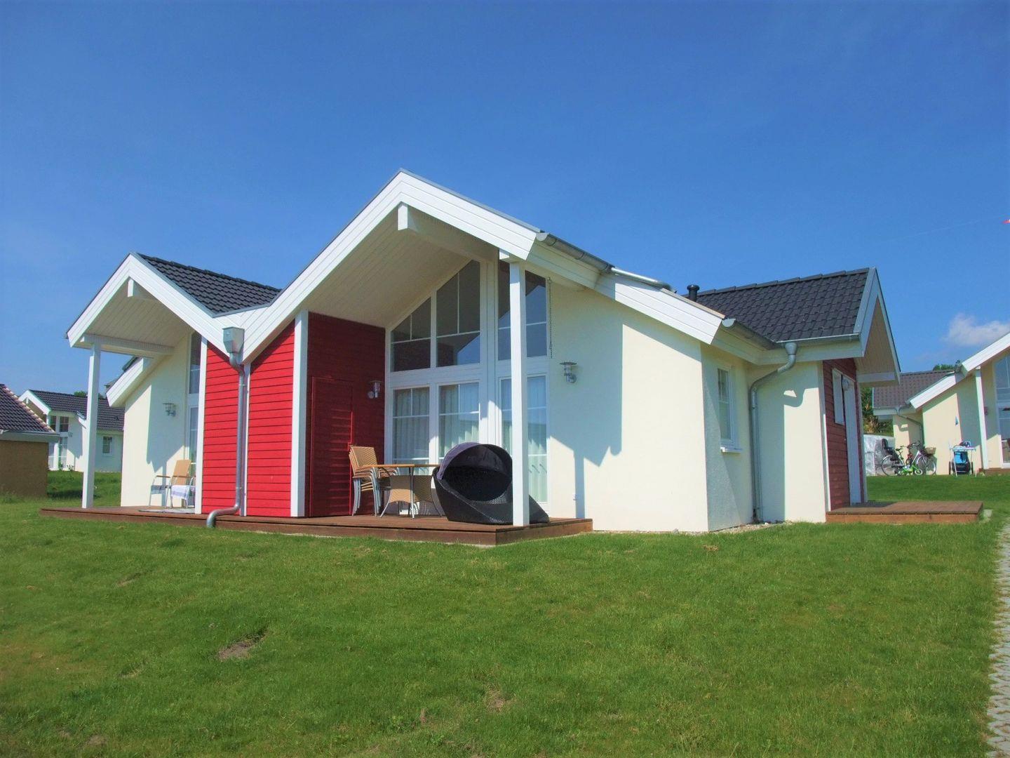 Die Bungalowhälfte "Waterkant" Nr. 72 liegt in der Strandpark-Anlage und ist für bis zu 5 Personen geeignet. Vom gemütlichen Wohnraum mit Pelletofen und integrierter, voll ausgestatteter Küche haben Sie Zugang zur Terrasse. Von hier können Sie durch die anderen Häuser hindurch die Ostsee sehen. Im ersten Schlafraum steht ein Boxspringbett, im zweiten stehen zwei Einzelbetten, wovon man eines weiter ausklappen kann. Das Bad ist mit Badewanne, Sauna und Waschmaschine ausgestattet. WLAN inklusive.