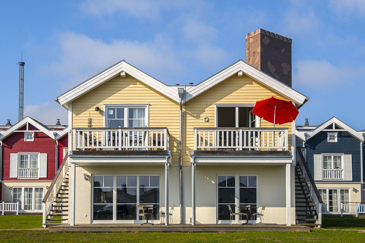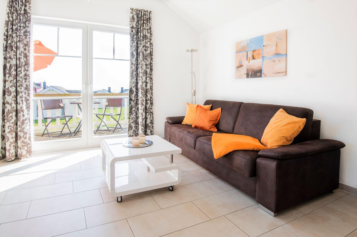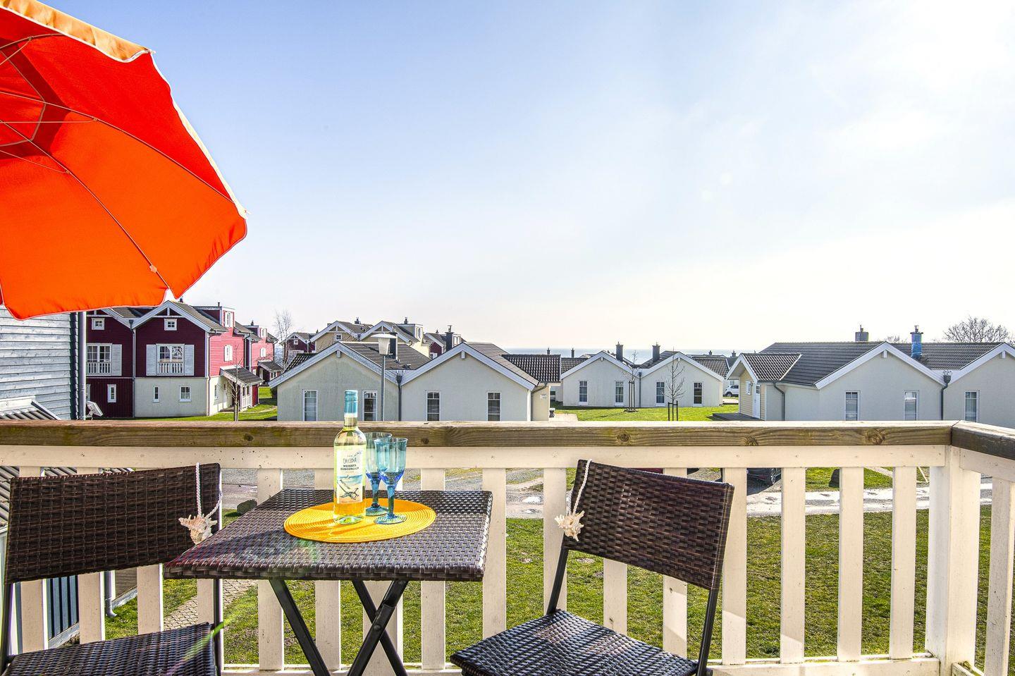 Die schöne Ferienwohnung "Schnigge" Nr. 48 liegt in der ersten Etage eines Hauses mit drei Wohneinheiten in der Strandpark-Anlage. Vom geräumigen Wohnraum mit Pelletofen und integrierter, voll ausgestatteter Küchenzeile haben Sie Zugang zum Balkon. Von hier haben Sie über die anderen Häuser hinweg Blick auf die Ostsee. Im Schlafraum steht ein Doppelbett, auf der Schlafcouch im Wohnraum kann ein Kind schlafen. Das Bad ist mit Dusche, Sauna und Waschmaschine ausgestattet. WLAN ist inklusive.