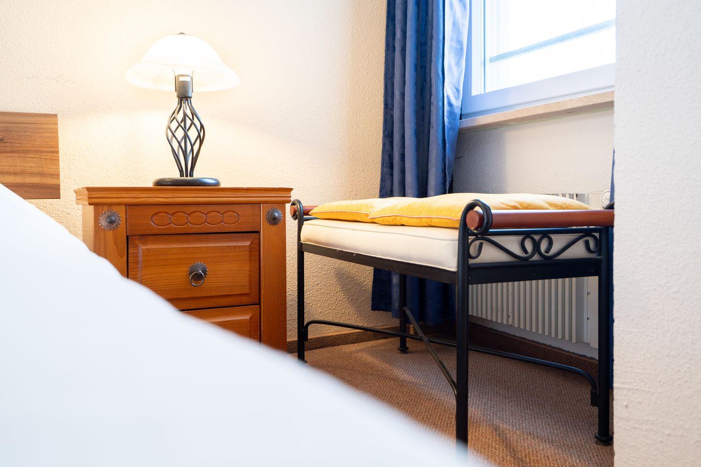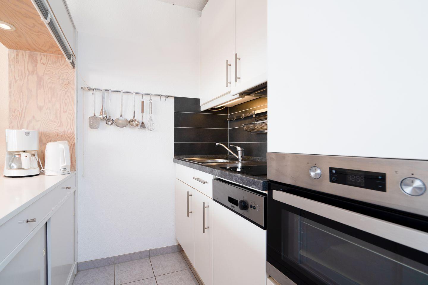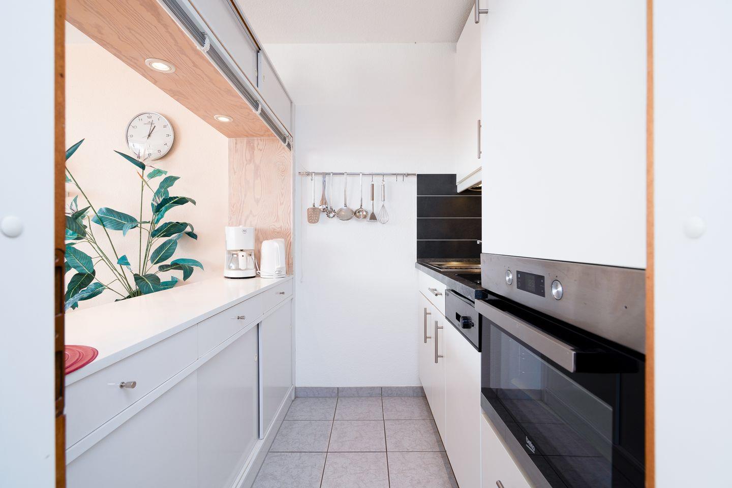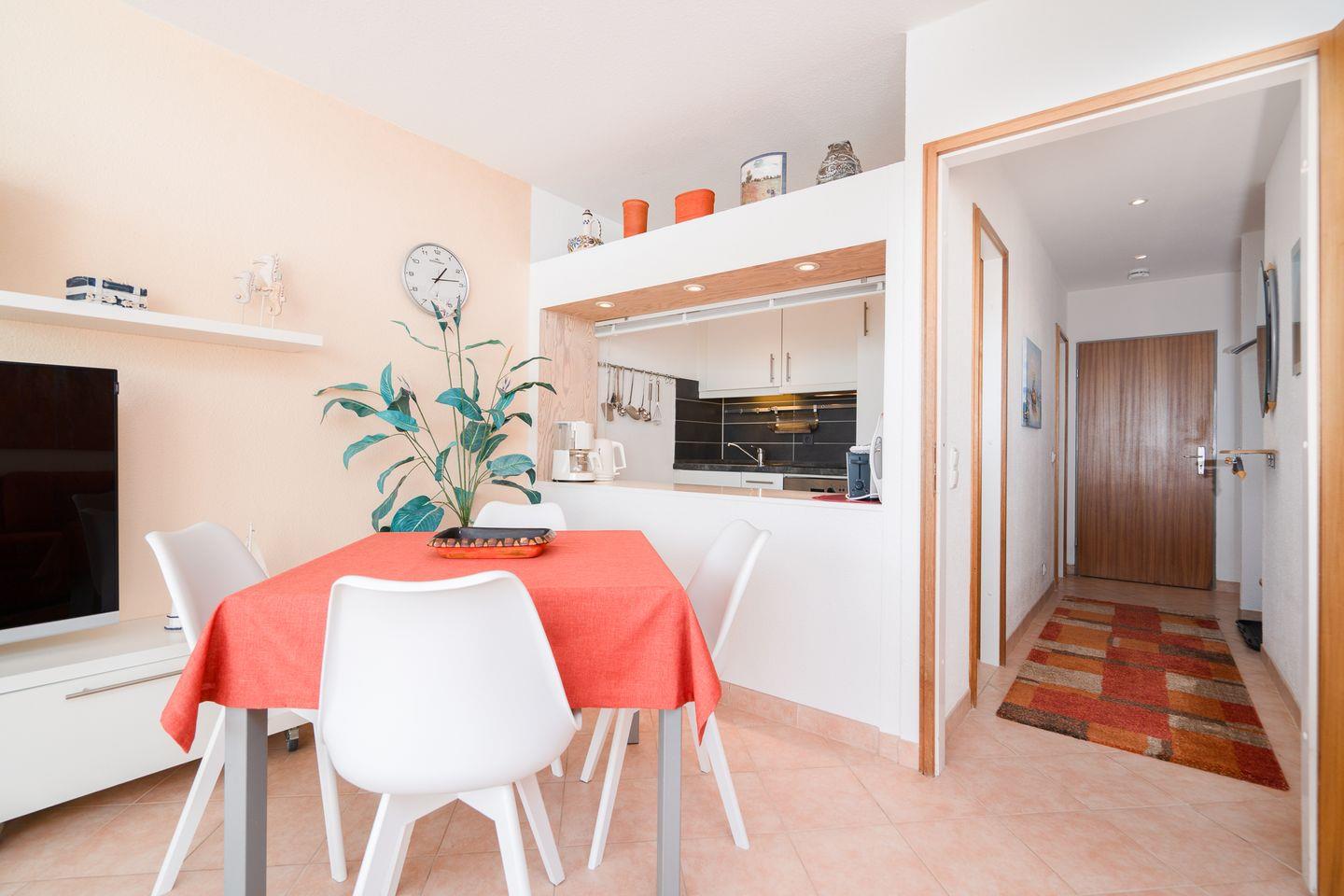 Vom hellen und freundlich gestalteten kombinierten Wohn- und Essbereich haben Sie Zugang zum Balkon. Die moderne Küche ist mit Spülmaschine, Herd und Backofen voll ausgestattet und mit einer Durchreiche zum Wohn-/Essbereich hin offen. Das Schlafzimmer hat ein Doppelbett (2x 90 x 200 cm) und ein Fenster, das modernisierte Duschbad ist innenliegend. Zum Strand und zur Promenade sind es nur wenige Gehminuten.
