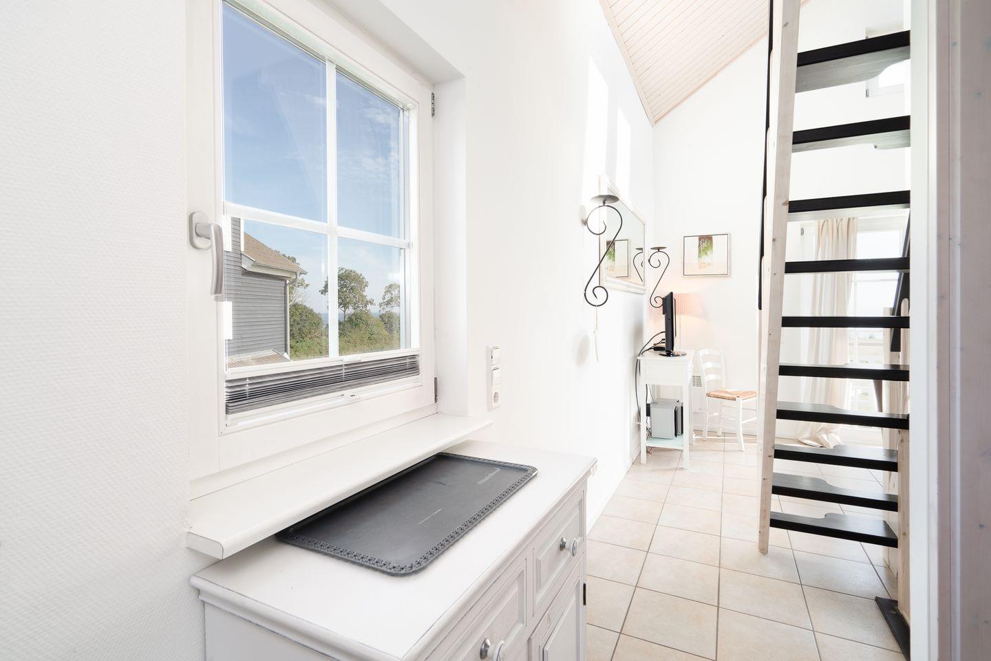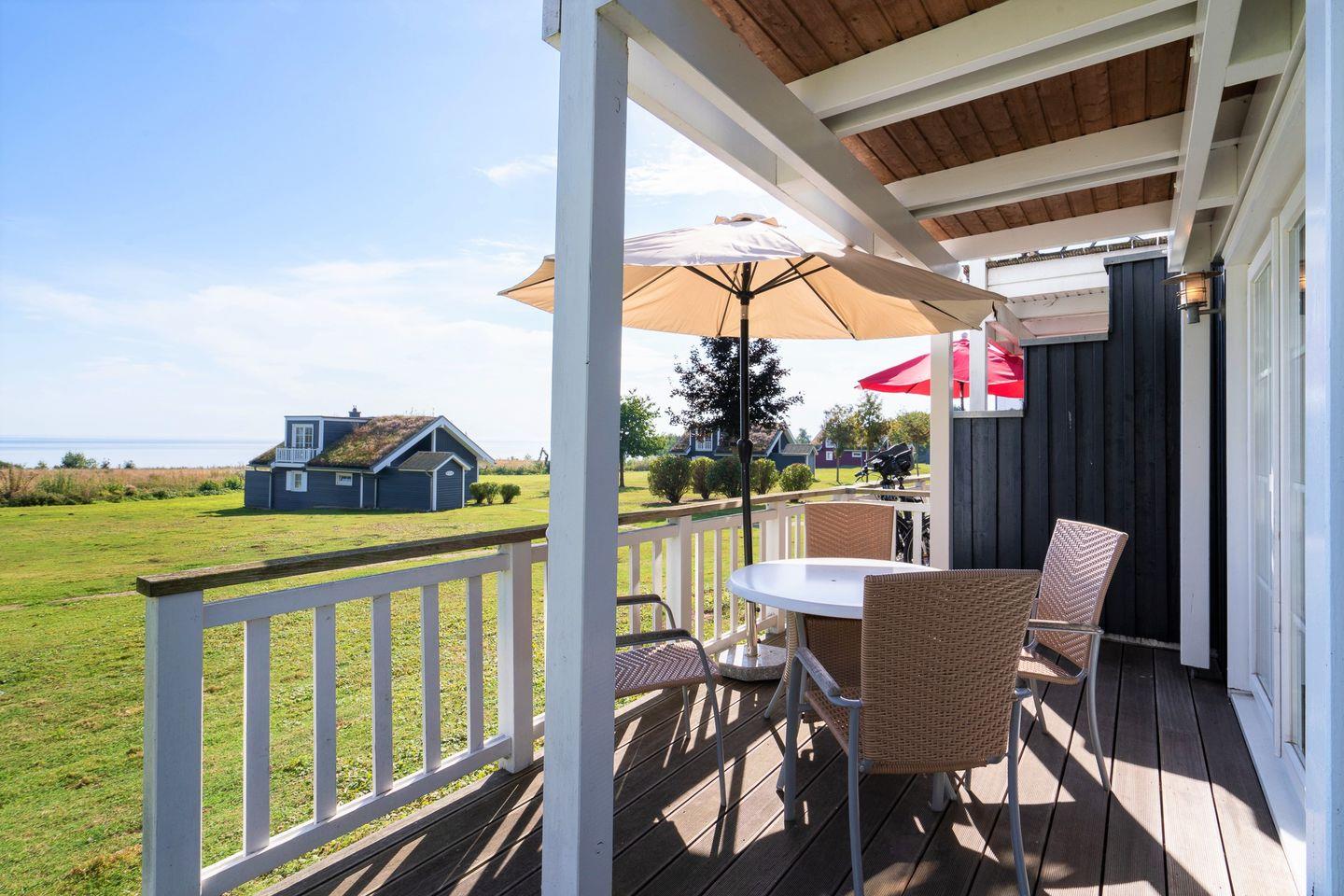 Die große Doppelhaushälfte "Krabbe" Nr. 94 bietet viel Platz und Wohlfühl-Komfort über 3 Etagen und Blick auf die Ostsee. Offene Küche mit Spülmaschine und Essbereich mit Kamin sind im Erdgeschoss, sowie Sauna mit Dusche und WC und ein Schlafraum mit Doppelbett. In der 1. Etage befinden sich ein zweiter Schlafraum mit Doppelbett, der Wohnbereich und das Bad mit Whirlwanne und Waschmaschine. Zur offenen Galerie mit Schlafsofa führt von der 1. Etage aus eine steile Raumspartreppe. WLAN inklusive.