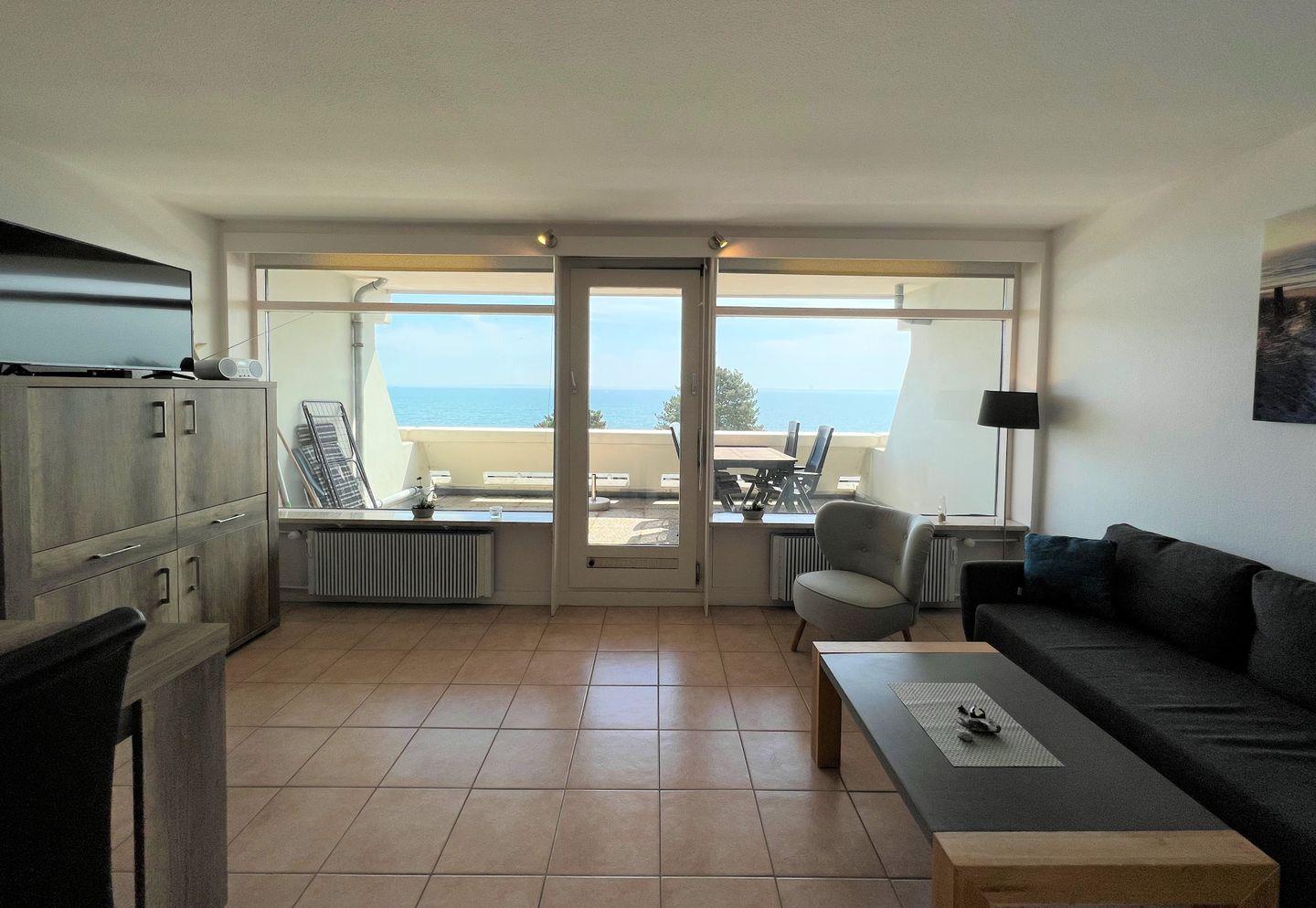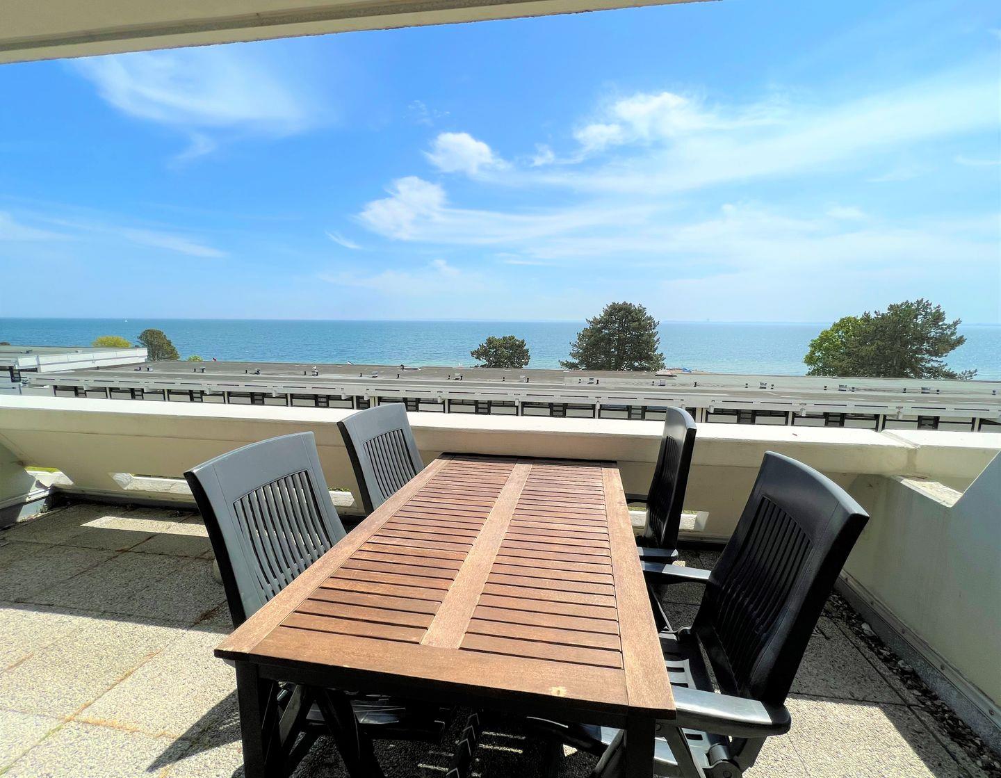 Herzlich Willkommen in der 3-Raum-Ferienwohnung Nr. 205, hier kann die ganze Familie aus der 2. Etage den Meerblick genießen. Der große Balkon in Süd-Ost-Lage hat über die 1- Reihe der Terrassenhäuser Blick auf die Ostsee und lädt zum Entspannen und Erholen ein. Die ca. 50 qm große Wohnung ist für 4 Personen geeignet. Im ersten Schlafraum stehen zwei Einzelbetten (jeweils 90 x 190 cm), die nicht zusammen zu schieben sind. Im zweiten Schlafraum steht ein Etagenbett (80 x 190 cm). In den Schlafräumen ist kein Platz für ein Babybett. Vom kombinierten Wohn- und Essbereich haben Sie Zugang zum Balkon. Die kleine Küche, mit Spülmaschine und Backofen ausgestattet, ist mit einer Durchreiche zum Essbereich hin offen. Das innenliegende Duschbad wurde modernisiert. Zum Badestrand sind es nur wenige Minuten zu Fuß. PKW-Stellplatz inklusive.