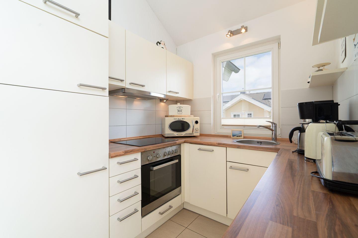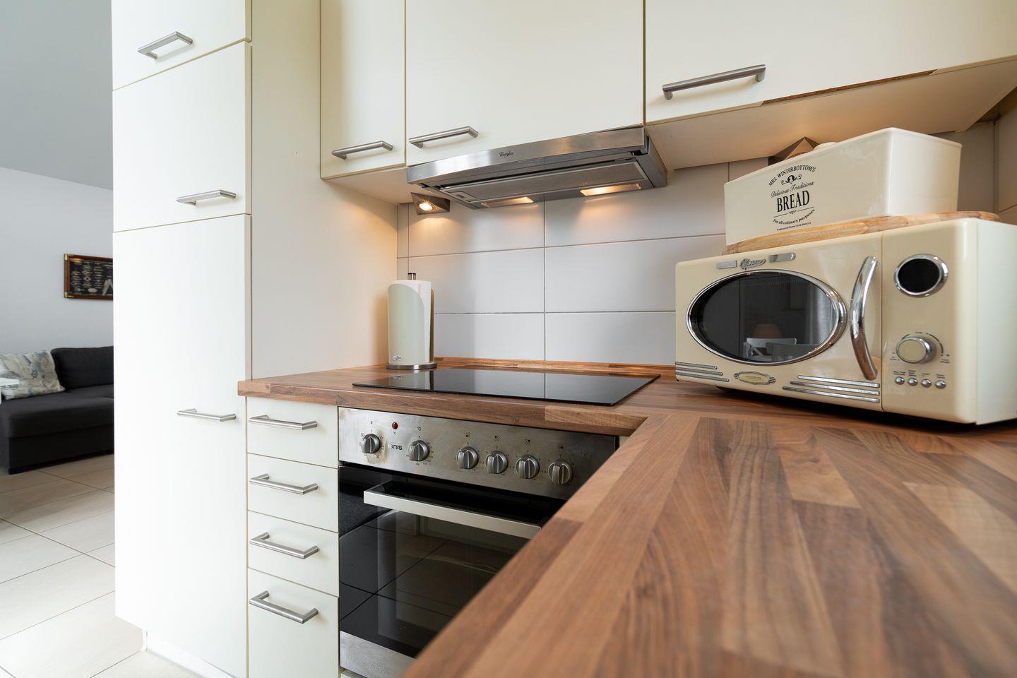 Auf 70 qm auf einer Ebene stehen Ihnen 2 Schlafräume (1x mit Boxspringbett (180 cm x 200 cm) und 1 x mit 2 getrennten Betten), ein geräumiger Wohn- und Essraum mit Pelletofen und Zugang zur Terrasse zur Verfügung. Der Ofen sorgt für gemütliche Stunden mit Freunden und Familie. Die zum Wohn- und Essbereich offene Küche ist mit Geschirrspülmaschine, Herd und Backofen voll ausgestattet. Im Bad finden Sie auch die Sauna, sowie eine Badewanne. Der Komfort einer eigenen Sauna wird besonders von unseren Gästen im Winter geschätzt. Eine Waschmaschine steht ebenfalls im Haus zur Verfügung. Die Beheizung erfolgt über Elektroheizungen und den Pelletofen.