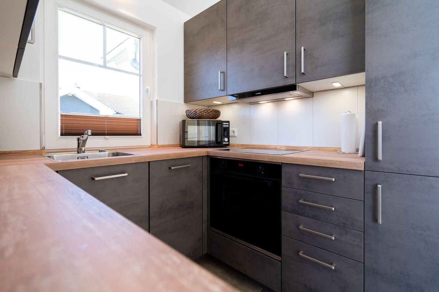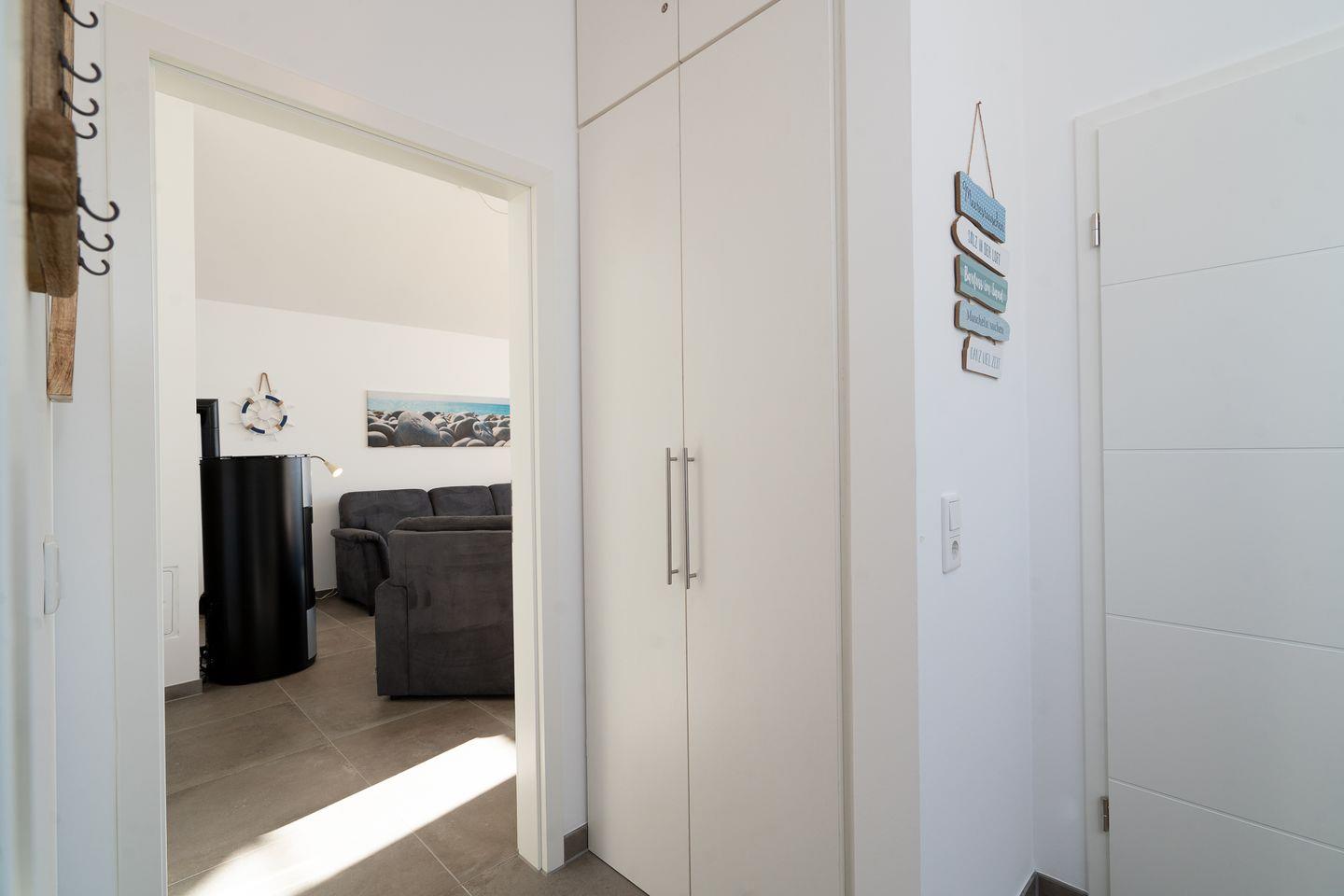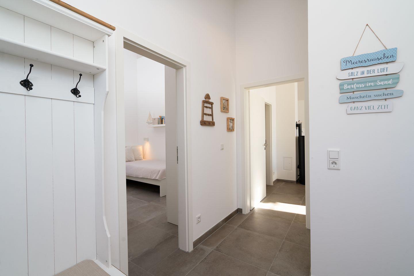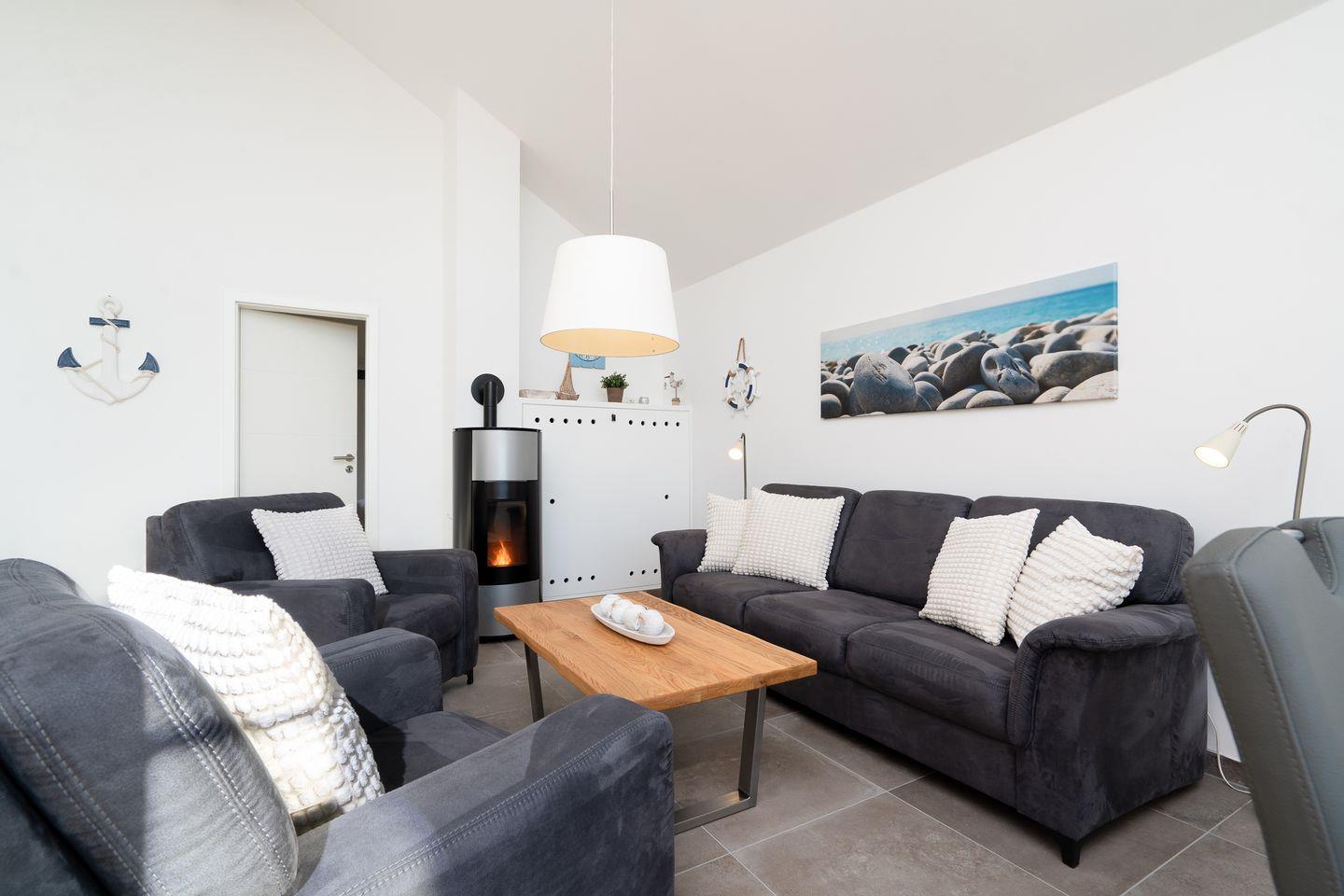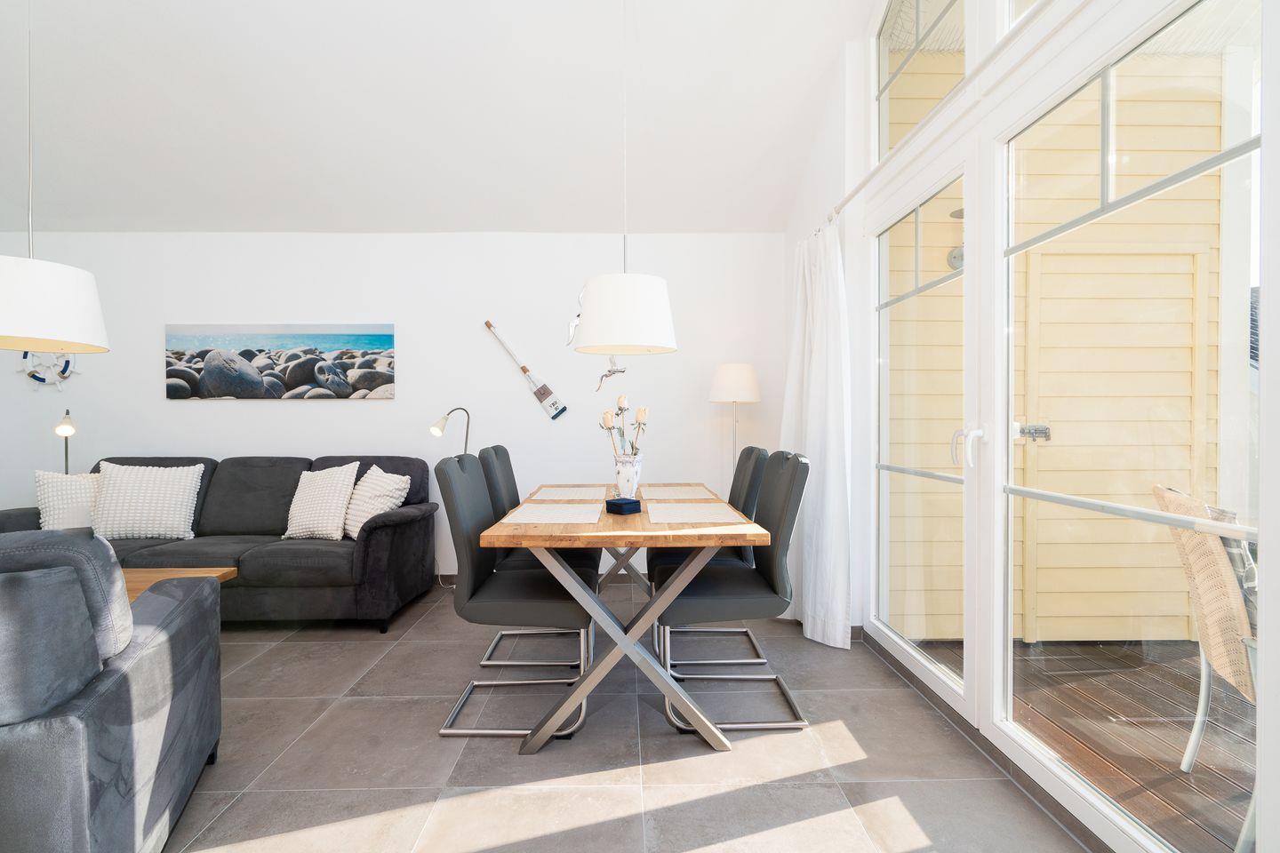 Auf 70 qm auf einer Ebene stehen Ihnen 2 Schlafräume (1x mit Doppelbett (Matratzen 2x 80cm x 200 cm) und 1 x mit 2 getrennten Betten (Matratzen 2x 90x200 cm), ein geräumiger Wohn- und Essraum mit Pelletofen und Zugang zur Terrasse zur Verfügung. Von der Terrasse können Sie durch die anderen Häuser hindurch die Ostsee sehen. Die zum Wohn- und Essraum hin offene Küche ist mit Geschirrspülmaschine, Herd und Backofen gut ausgestattet. Der Pelletofen im Wohnbereich sorgt für gemütliche Stunden mit Freunden und Familie. Im modernen Bad finden Sie auch die Sauna, sowie eine bodentiefe Dusche. Der Komfort einer eigenen Sauna wird sehr von unseren Wintergästen geschätzt. Eine Waschmaschine gehört ebenfalls zur Ausstattung. Die Beheizung erfolgt über Elektroheizungen und den Pelletofen.