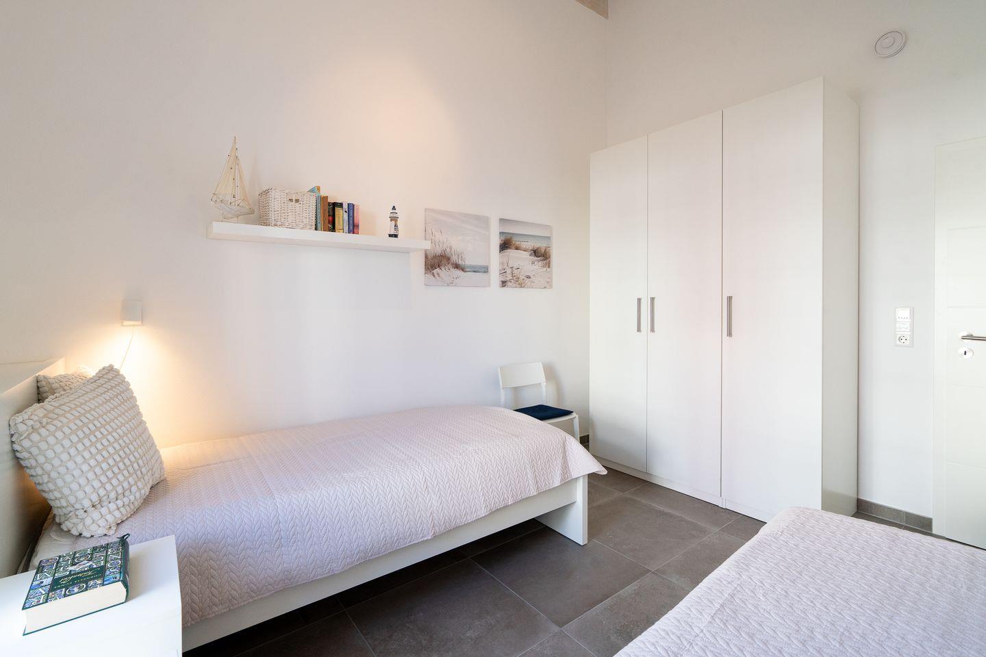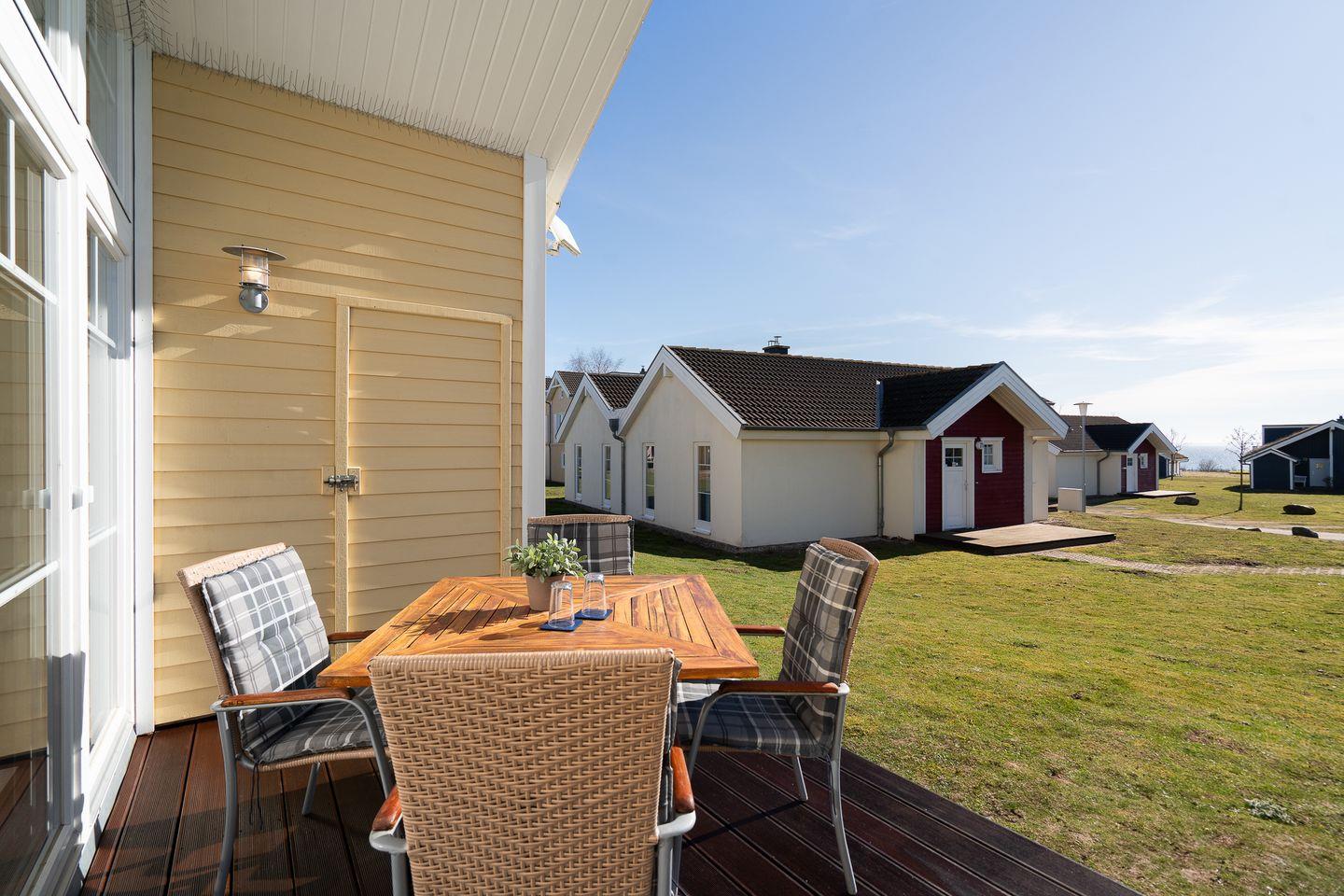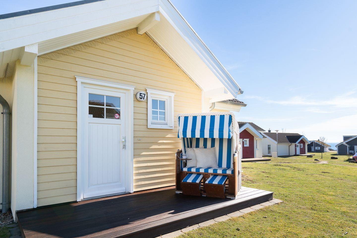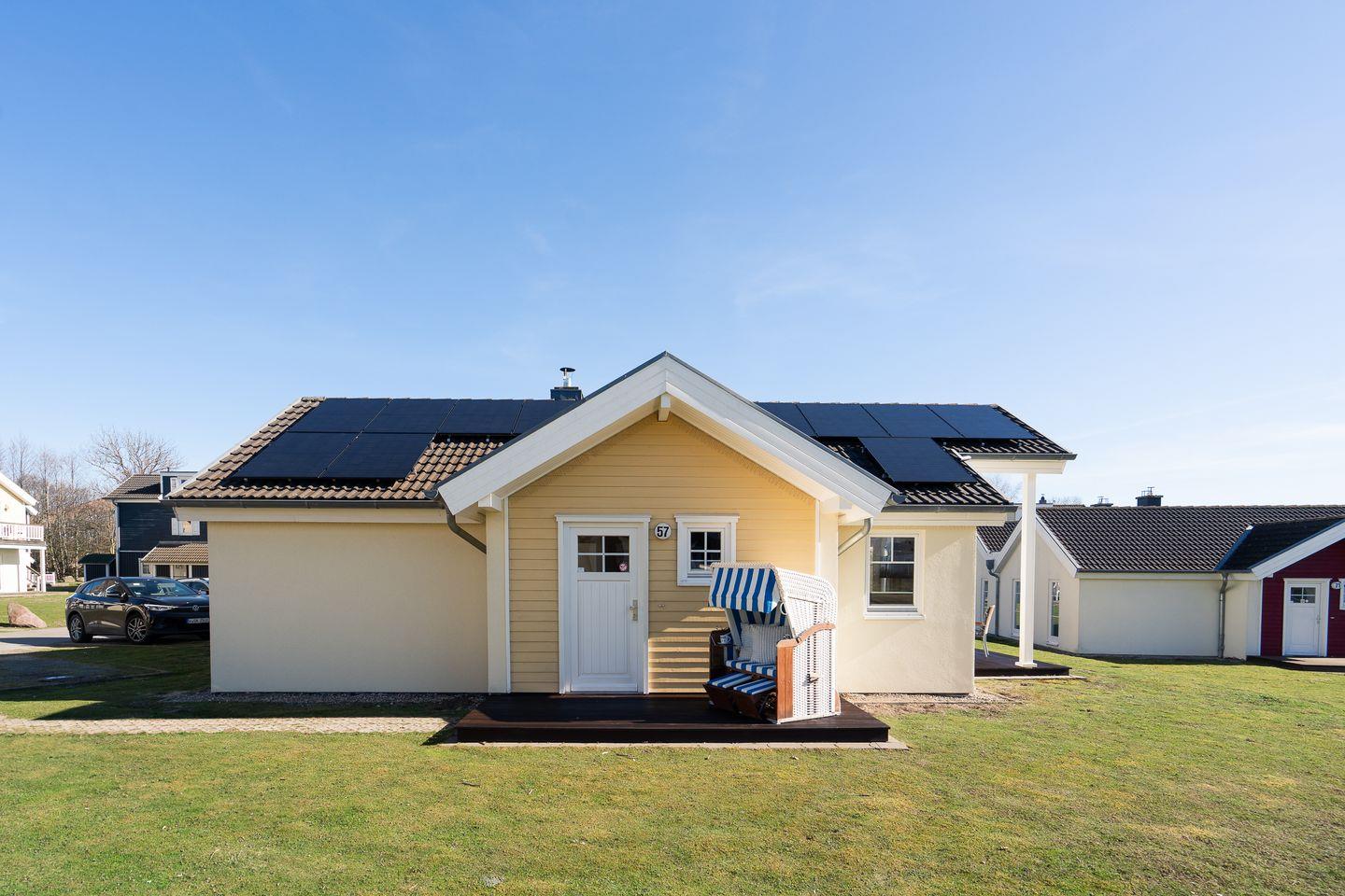 Die gemütliche Bungalowhälfte Nr. 57 liegt in der Strandpark-Anlage und ist für 4 Personen geeignet. Vom geräumigen Wohnraum mit Pelletofen und offener Küche haben Sie Zugang zur Terrasse. Die Küche ist mit Spülmaschine, Backofen und Herd voll ausgestattet. Von der Terrasse können Sie durch die anderen Häuser hindurch die Ostsee sehen. Im ersten Schlafraum steht ein Doppelbett, im zweiten stehen zwei Einzelbetten. Das Bad ist mit Dusche, Sauna und Waschmaschine ausgestattet. WLAN ist inklusive.