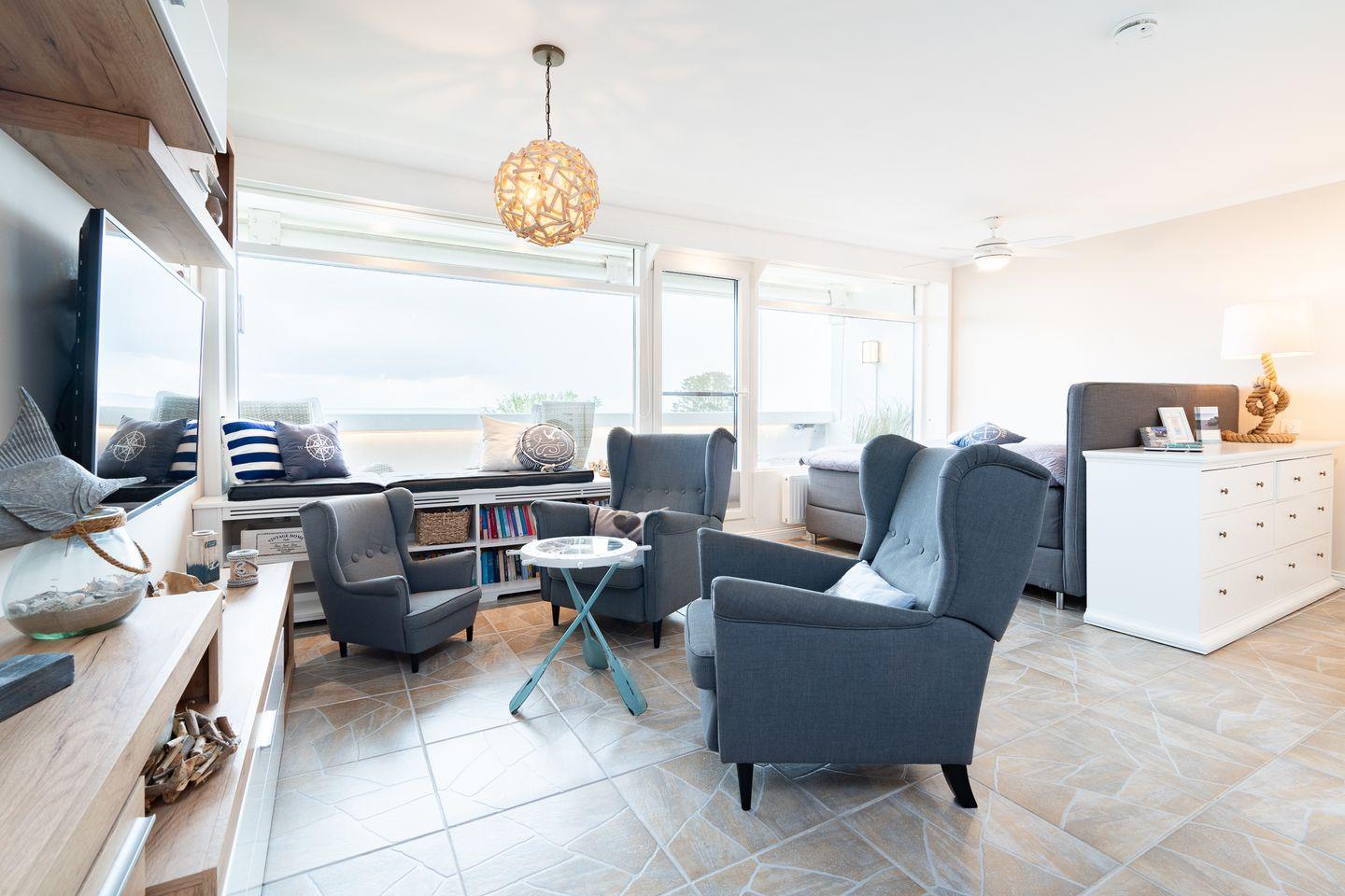 Die Ferienwohnung mit Balkon bietet allen Komfort für erholsame und entspannte Tage an der Ostsee. Von Sonnenaufgang bis zum Nachmittag können Sie die Sonne genießen, eine Markise ist auf dem Balkon vorhanden. Mit 55qm Wohnfläche ist Platz für bis zu 4 Personen. Das helle und maritim gestaltete Wohnzimmer bietet durch die großen Panoramafenster einen atemberaubenden Blick auf die Ostsee. Hier finden Sie ein Boxspringbett (160 cm x 200 cm) direkt vor der großen Panoramascheibe. Verdunklungsrollos sorgen für einen erholsamen Schlaf. Im separaten Schlafraum mit TV befindet sich ein ausziehbares Einzelbett (2x 80 x 200 cm). Der Essbereich und eine Wohnlandschaft mit zwei Ruhesesseln und Leseecke mit Flatscreen-TV (55 Zoll) runden die tolle Ausstattung der Wohnung ab. Eine große Auswahl an Gesellschaftsspielen, Büchern und DVDs lädt zum gemütlichen und entspannten Verweilen ein. Die separate Küche ist klein, aber hochwertig mit Backofen und Herd ausgestattet. Das moderne Duschbad ist innenliegend. Ohne eine Straße überqueren zu müssen, sind es nur wenige Gehminuten zum schönen Sandstrand. PKW-Stellplatz inklusive.