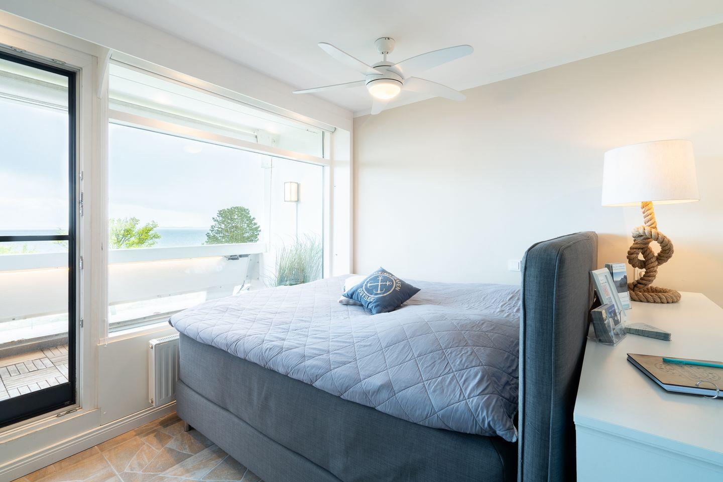 In 1. Reihe entdecken Sie hier Ihre Liebe zum Strand. Mit 55qm Wohnfläche ist Platz für bis zu 4 Personen. Das helle und maritim gestaltete Wohnzimmer bietet durch die großen Panoramafenster einen herrlichen Blick auf die Ostsee. Hier steht ein Boxspringbett direkt vor der großen Panoramascheibe. Im separaten Schlafraum mit TV befindet sich ein ausziehbares Einzelbett. Die kleine, abgetrennte Küche ist mit Backofen und Herd ausgestattet, das innenliegende Duschbad ist modern. WLAN ist inklusive.