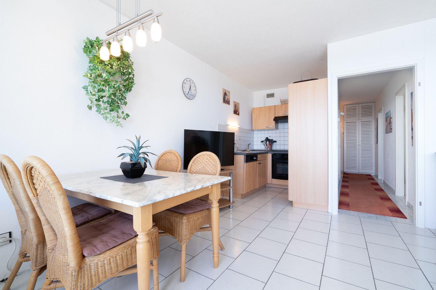 Die Ferienwohnung Nr. 406 ist eine 3-Raum-Nichtraucherwohnung in der 4. Etage mit Balkon und Ostseeblick. Die Wohnung ist für bis zu fünf Personen geeignet. im ersten Schlafraum steht ein Doppelbett, im zweiten ein Etagenbett. Das Sofa im Wohnzimmer bietet einen weiteren Schlafplatz. Die Küchenzeile ist zum Wohn- und Essbereich offen und mit Spülmaschine, Backofen und Herd ausgestattet. Das Wannenbad ist innenliegend. Zum Strand sind es nur wenige Fußschritte.