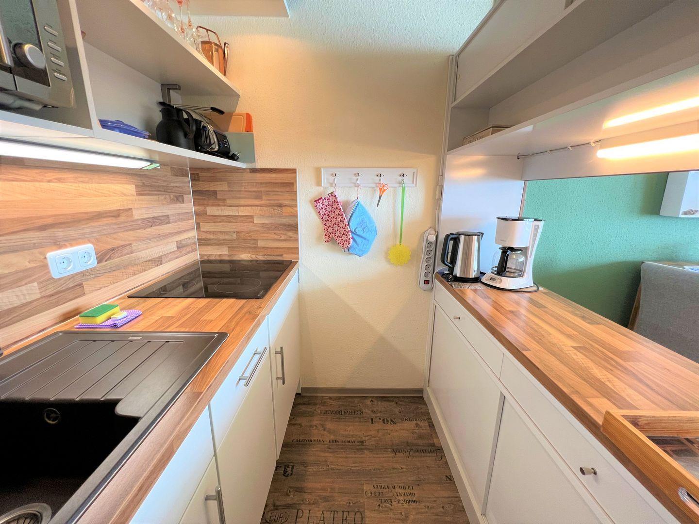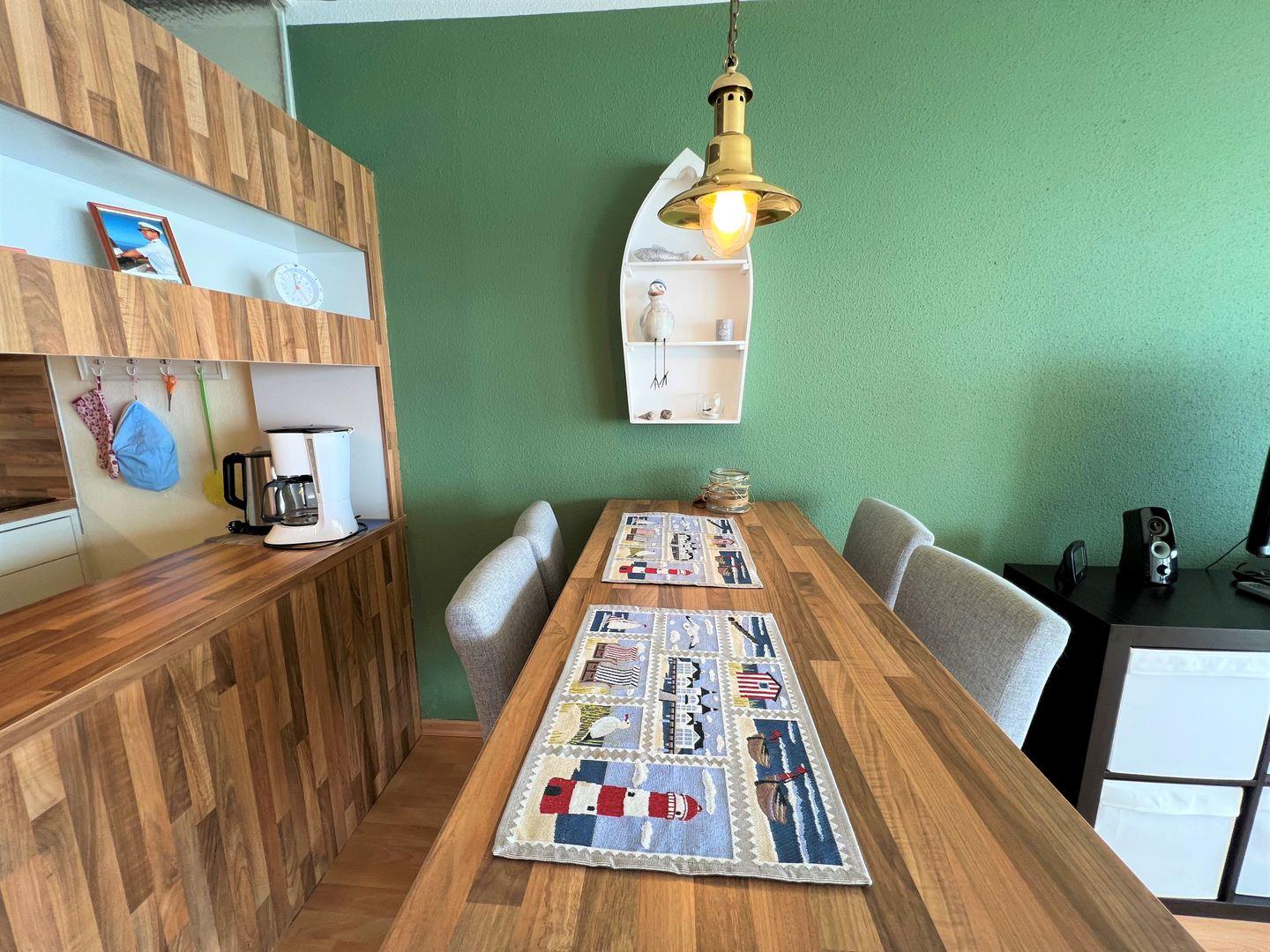 Diese 2-Raum-Ferienwohnung hat einen Balkon in Süd-Ost-Lage mit wunderbarem Blick auf die Ostsee. Die Küche ist mit Spülmaschine und Herd ausgestattet und mit einer Durchreiche zum kombinierten Wohn- und Essbereich hin offen. Im maritim eingerichteteten Wohnraum steht eine Schlafcouch (140 cm x 200 cm). Der Schlafraum mit Klappfenster ist mit zwei Einzelbetten ausgestattet, die man nicht zusammenschieben kann (2x 90 cm x 200 cm). Das Duschbad hat ebenfalls ein Klappfenster. PKW-Stellplatz inklusive. Zum Strand sind es nur wenige Fußschritte.